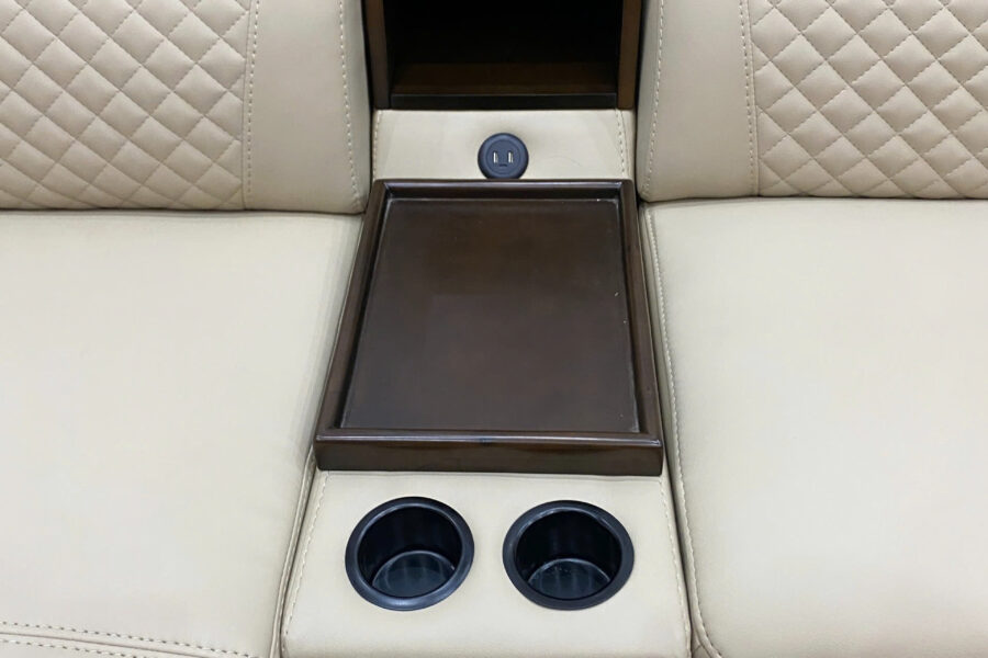 Phần tay ghế được ốp gỗ ở giữa, như một dải phân cách tạo chiều sâu và độ tương phản màu sắc tinh tế.