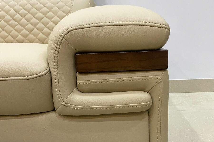 Đường may trang trí ở giữ hông hay chỉ nổi bo tay và chi tiết gỗ bóng nhẹ, giúp định hình rõ ràng cấu trúc tay ghế.