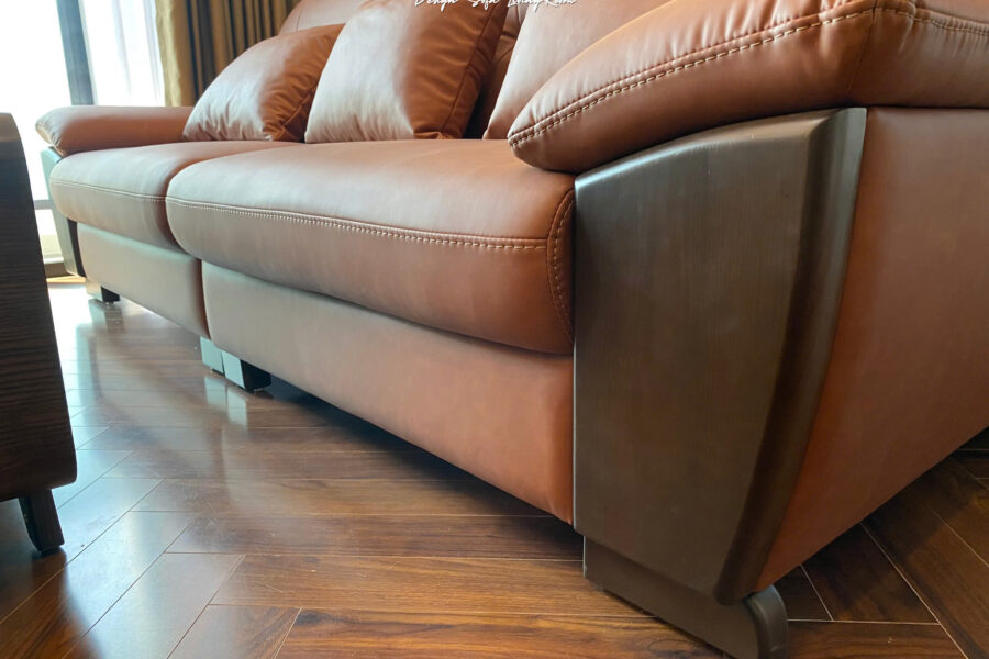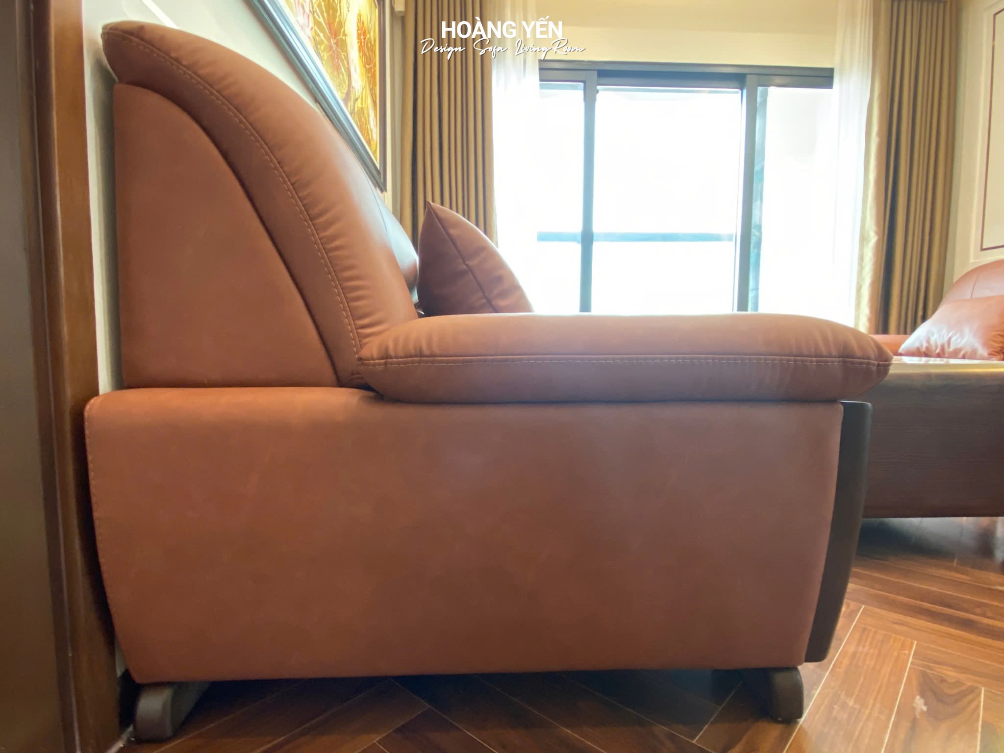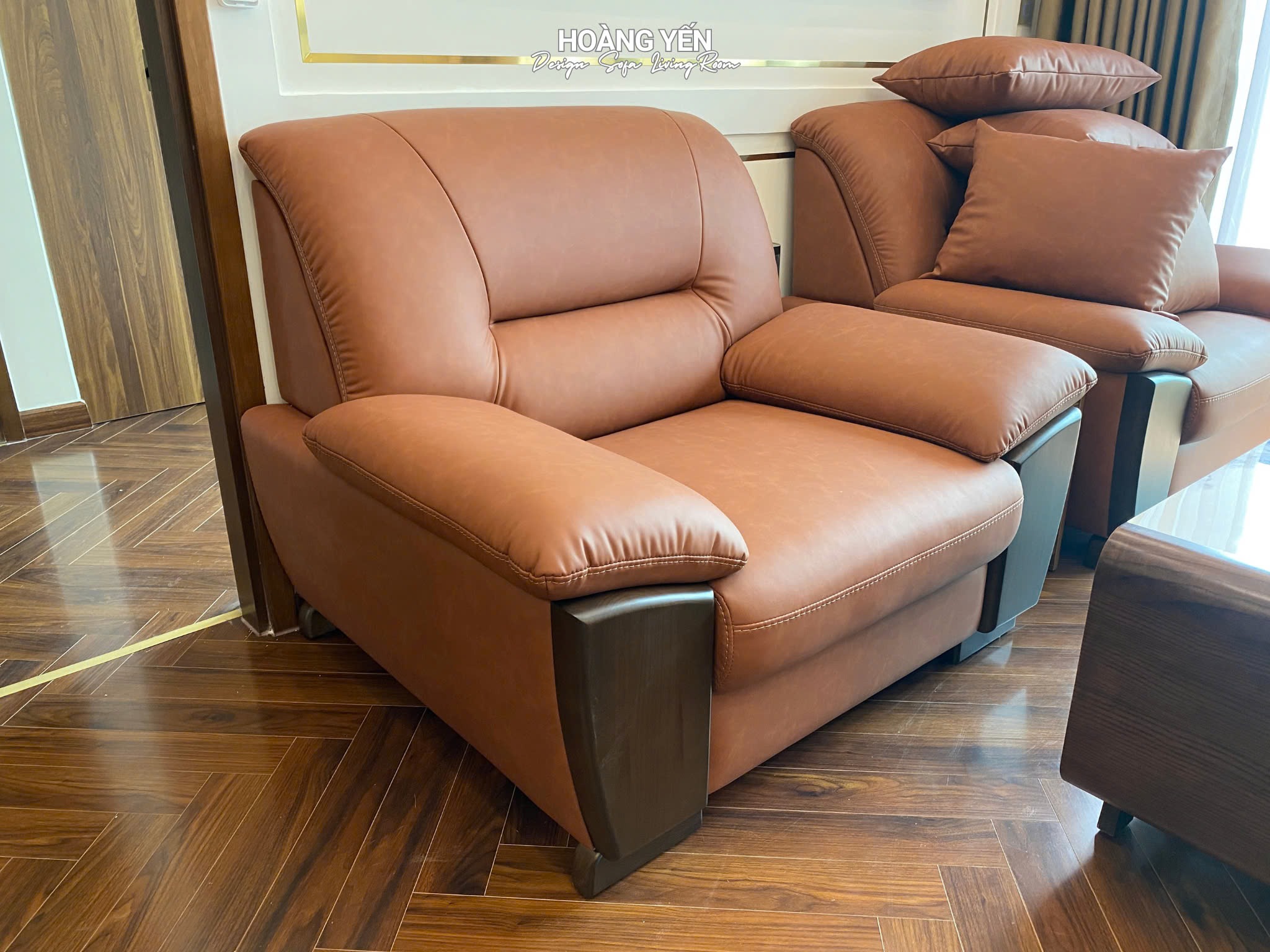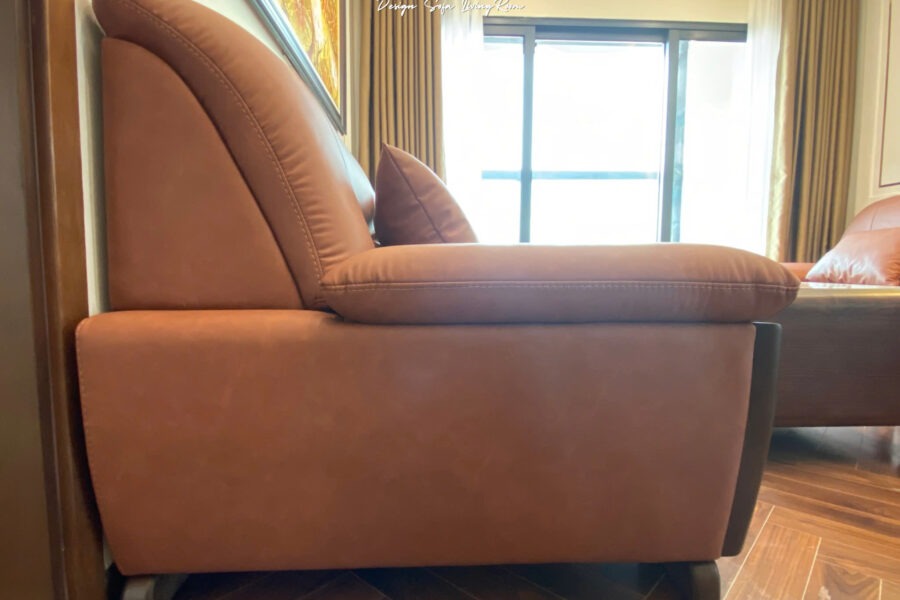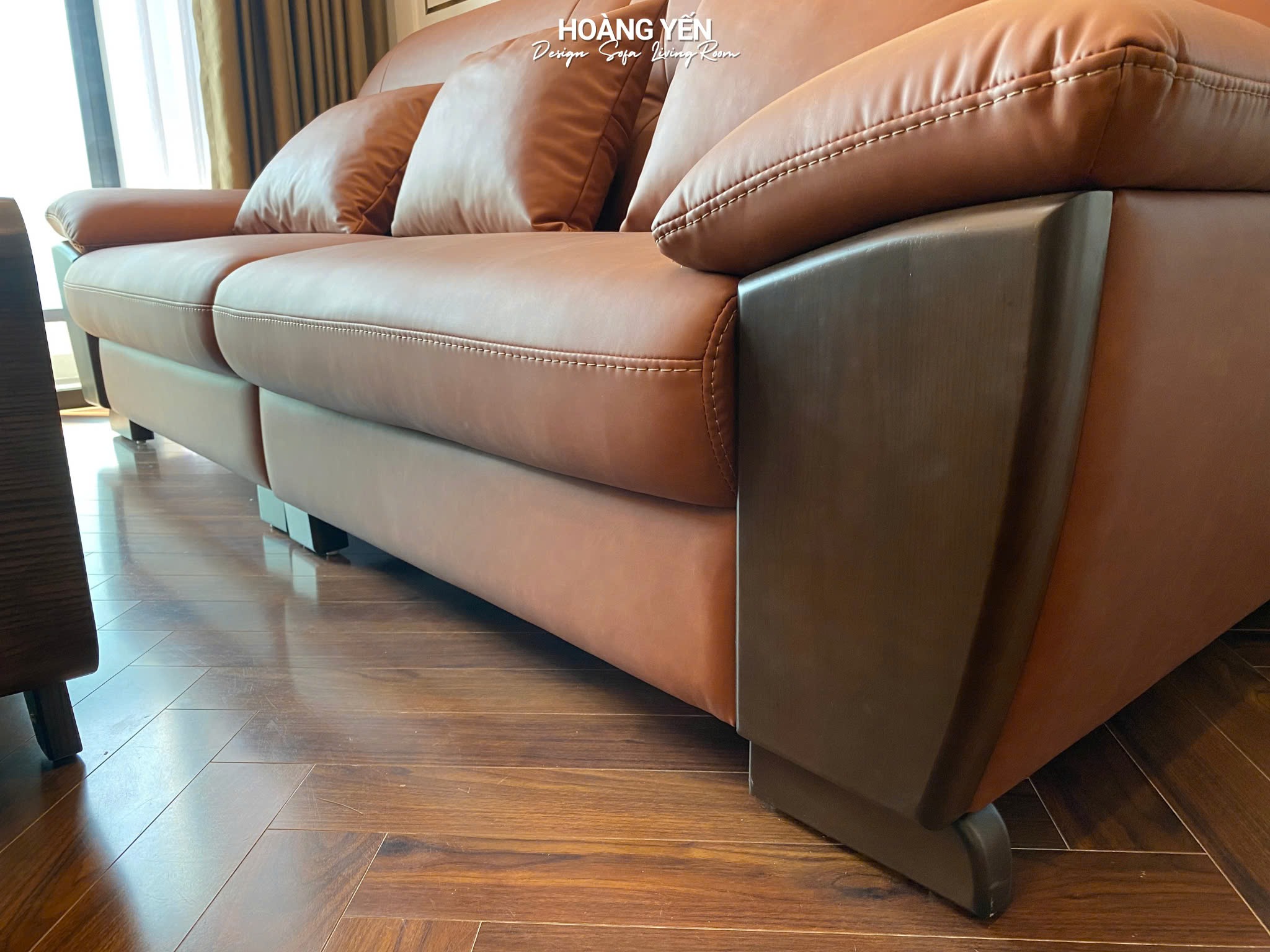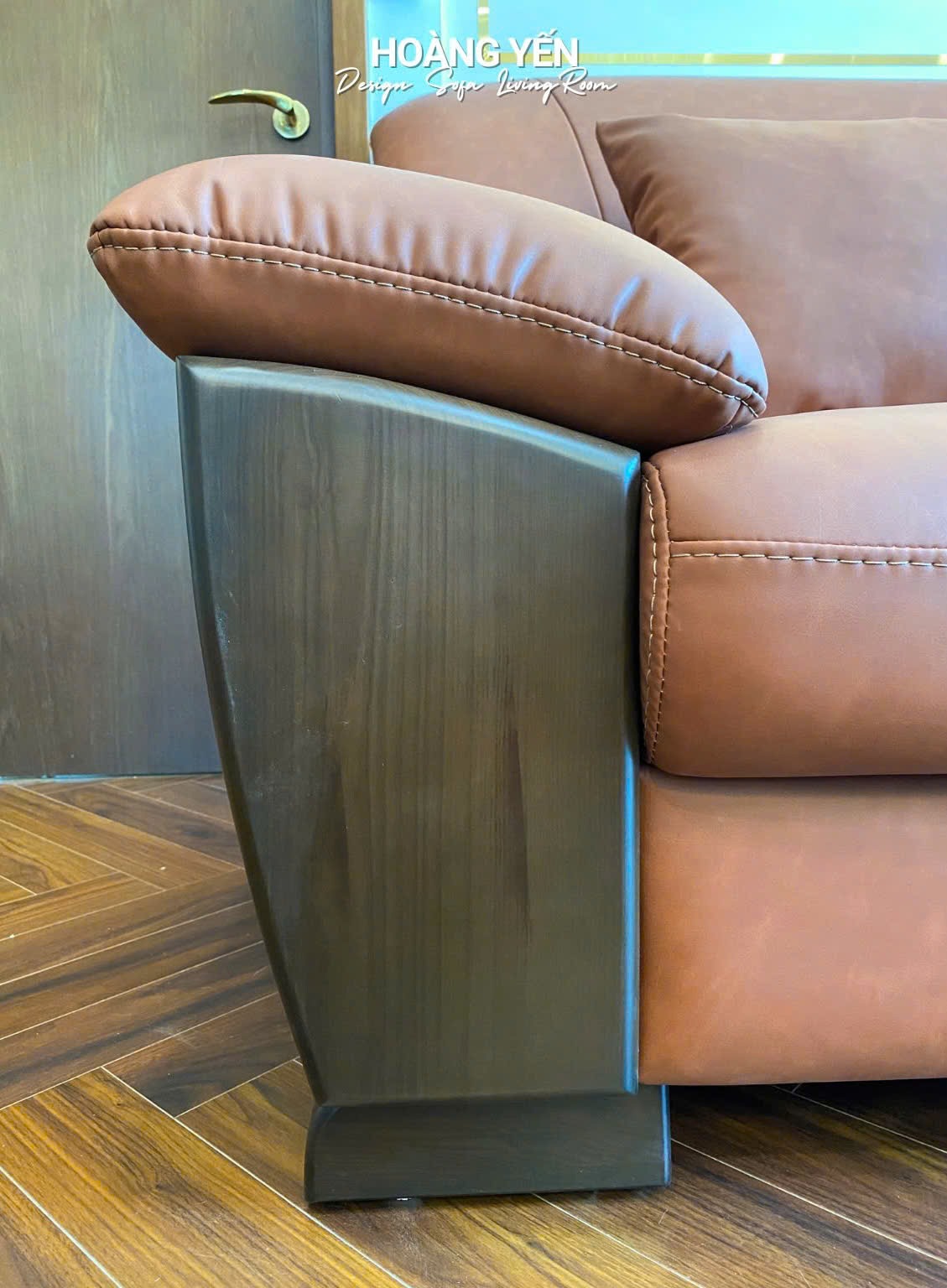 Chân ghế được làm bằng gỗ, phủ sơn màu nâu đậm, tạo sự tương phản với màu da bò sáng của sofa.