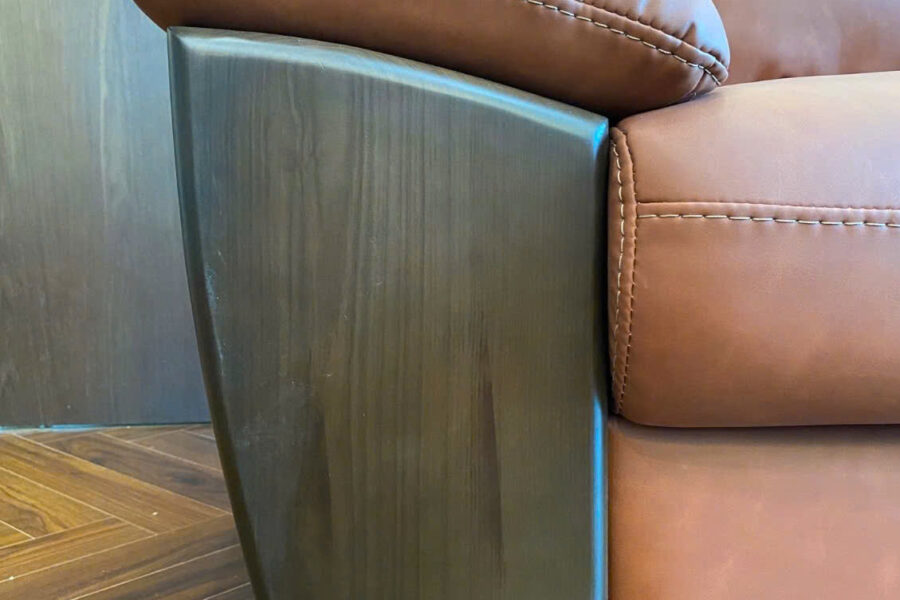 Ốp gỗ màu nâu sẫm chạy từ dưới chân lên ôm theo đường cong của tay ghế.