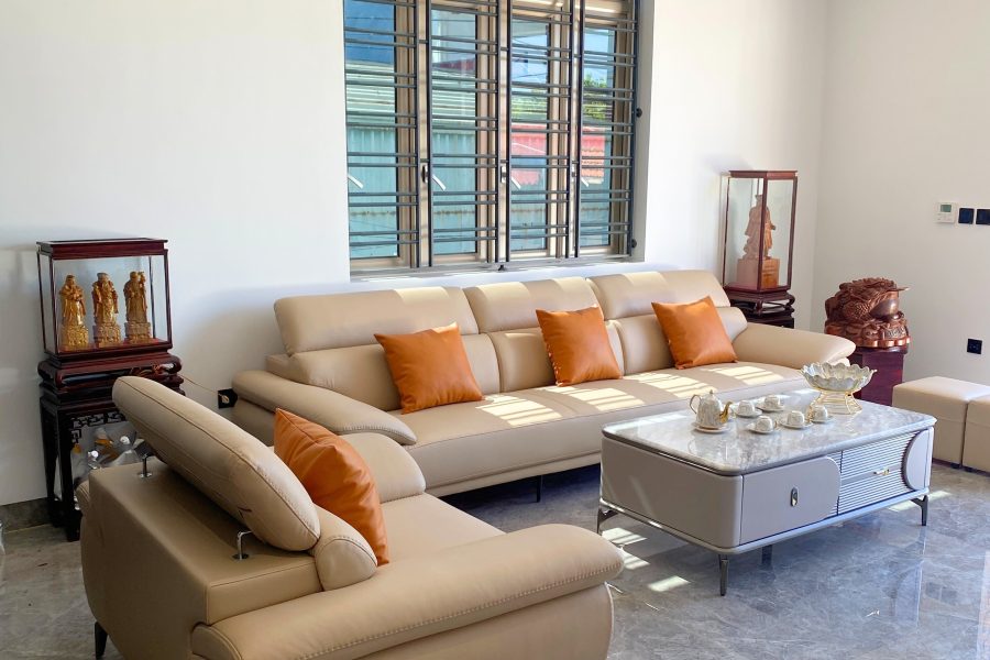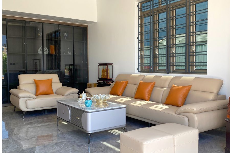 Kích thước sofa da phòng khách lớn giúp tối ưu công năng cho các gia đình có tần suất tiếp khách cao.
