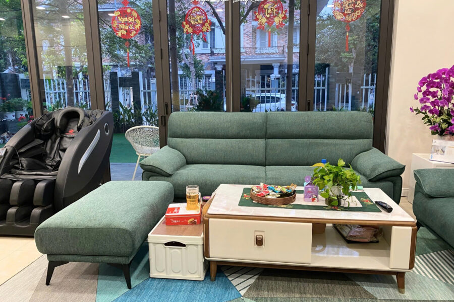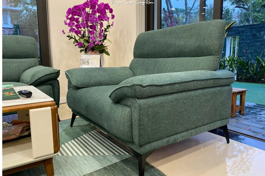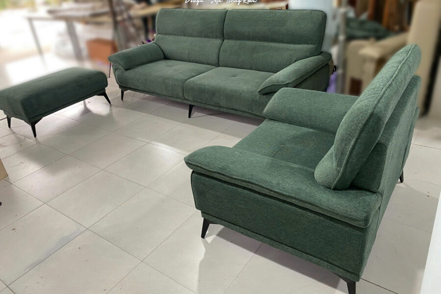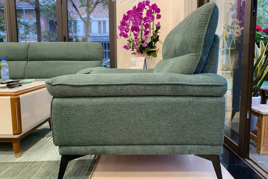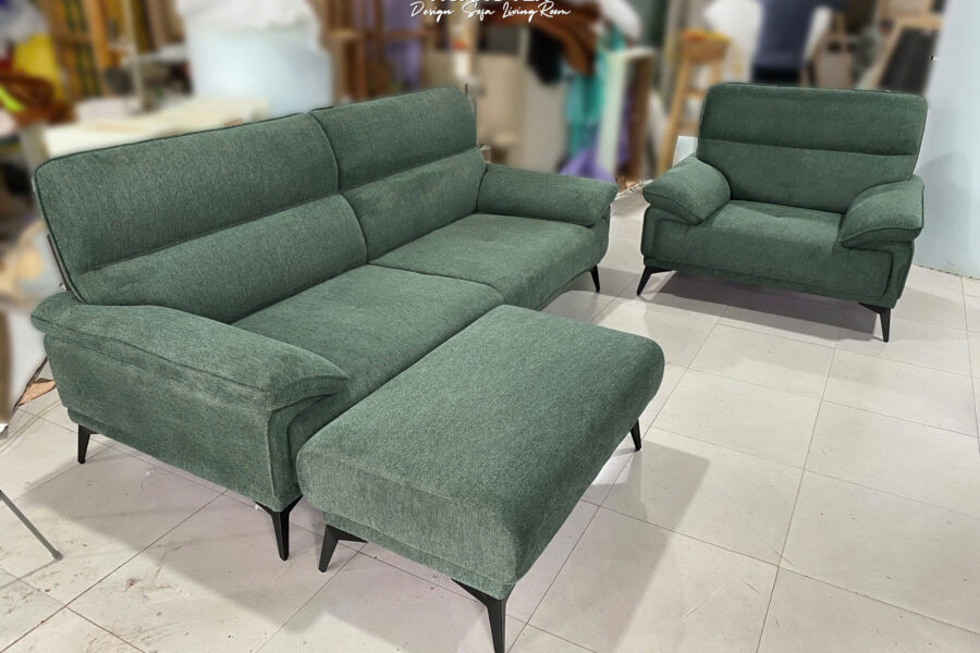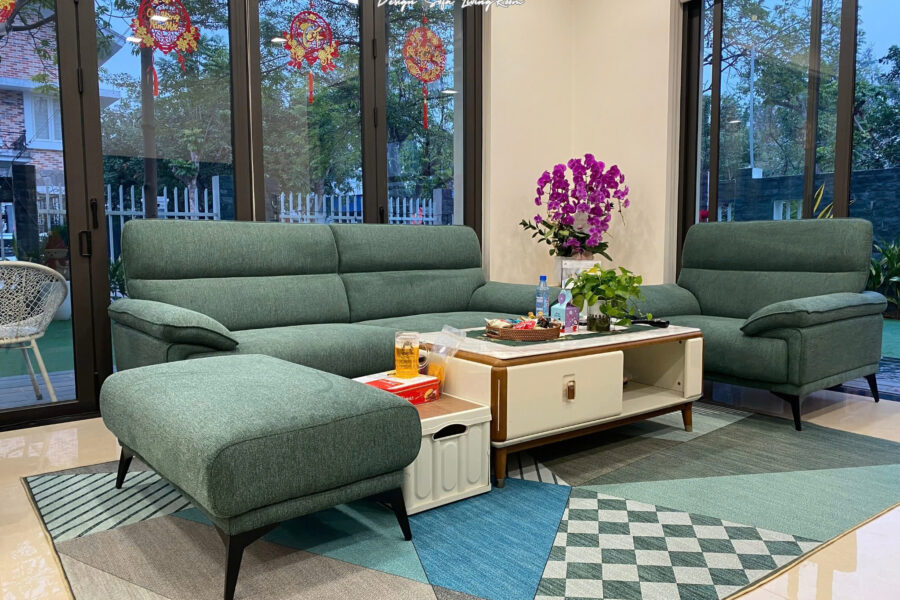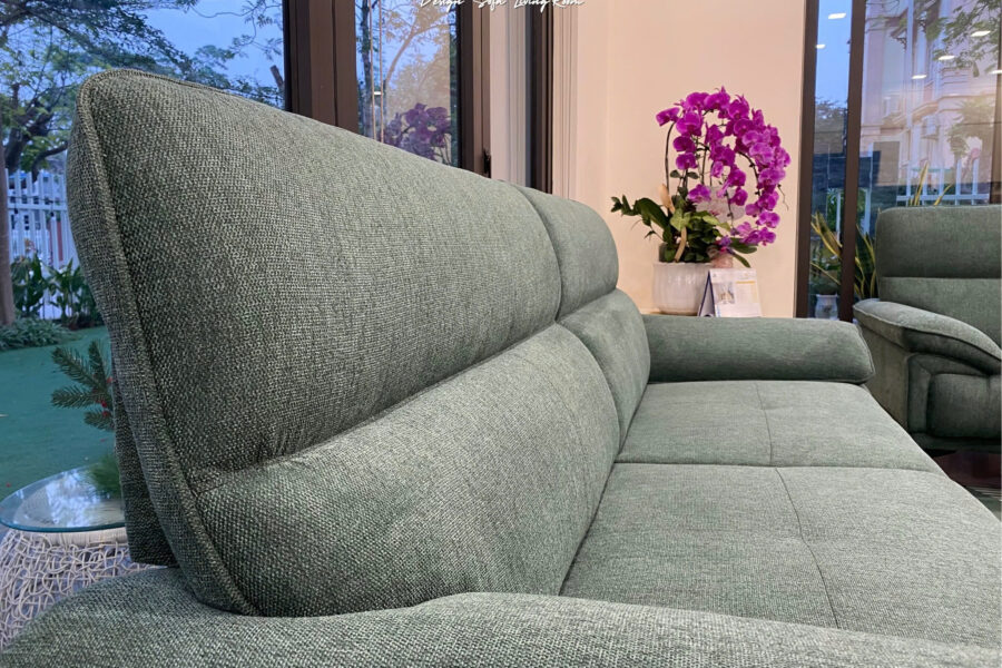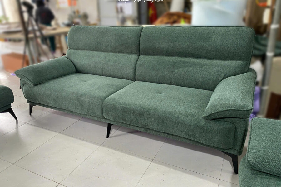 Bộ sofa nỉ này có màu xanh rêu trầm, là tông màu pha giữa xanh lá cây đậm và một chút sắc xám nhẹ.