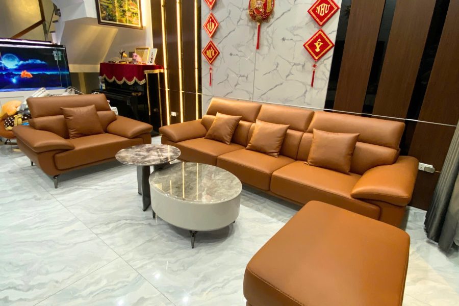 Bộ sofa da cam bò thiên ấm, vừa có chiều sâu, vừa gợi cảm giác gần gũi, hiện đại và tinh tế.