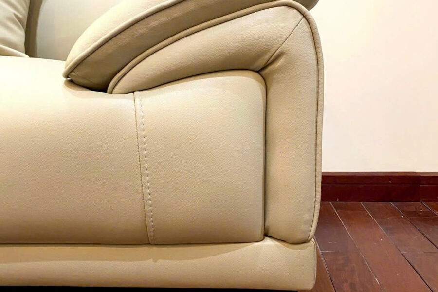 Lưng ghế được tạo khối với các gối tựa lớn, đường may thẳng gọn gàng chạy dọc viền tạo nên sự chắc chắn và tinh tế.