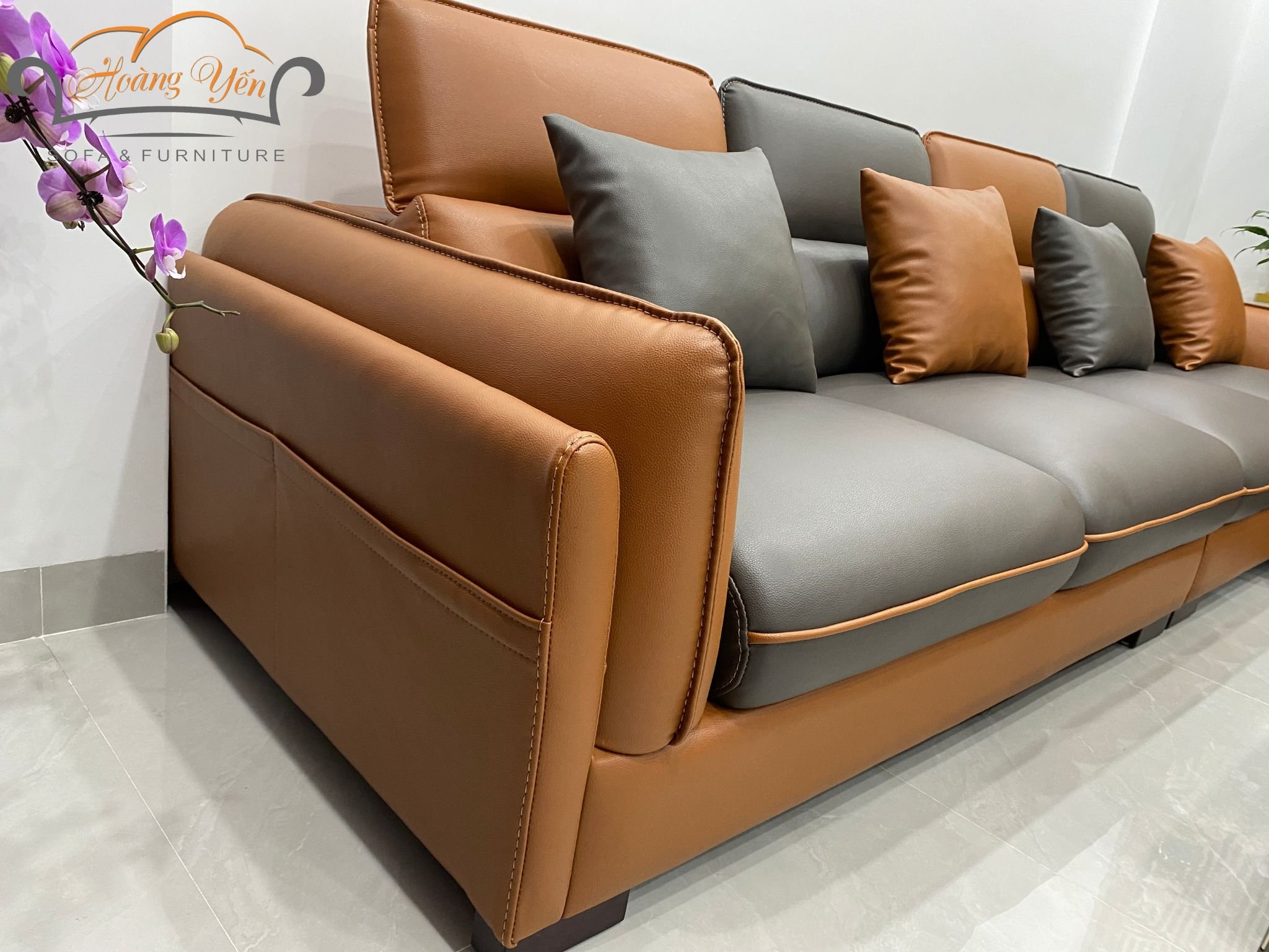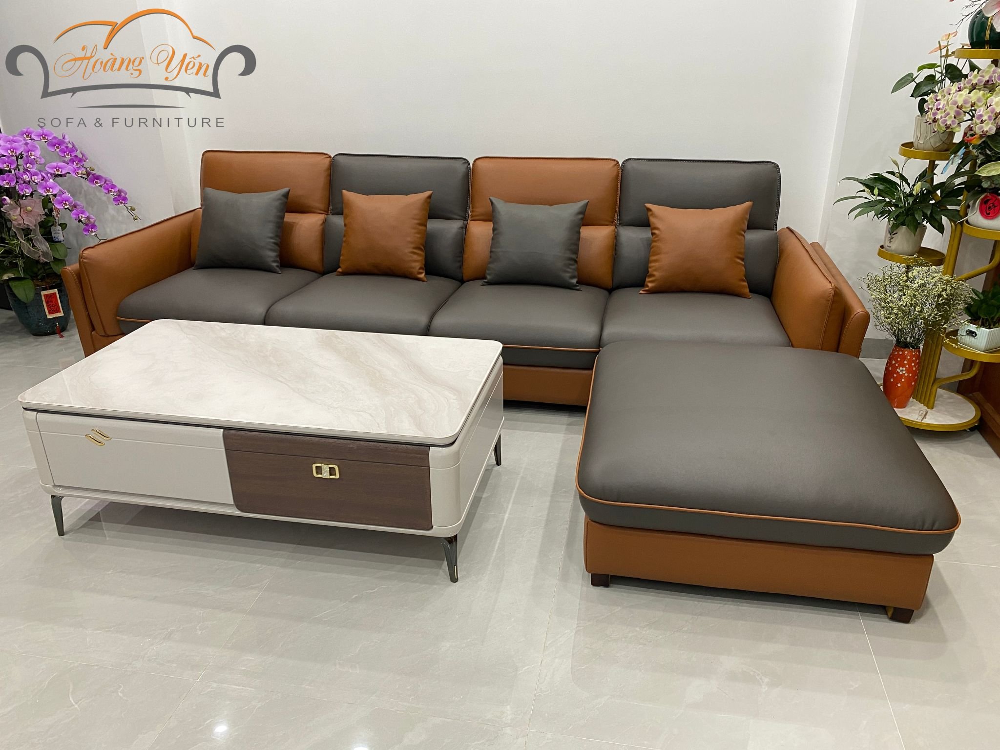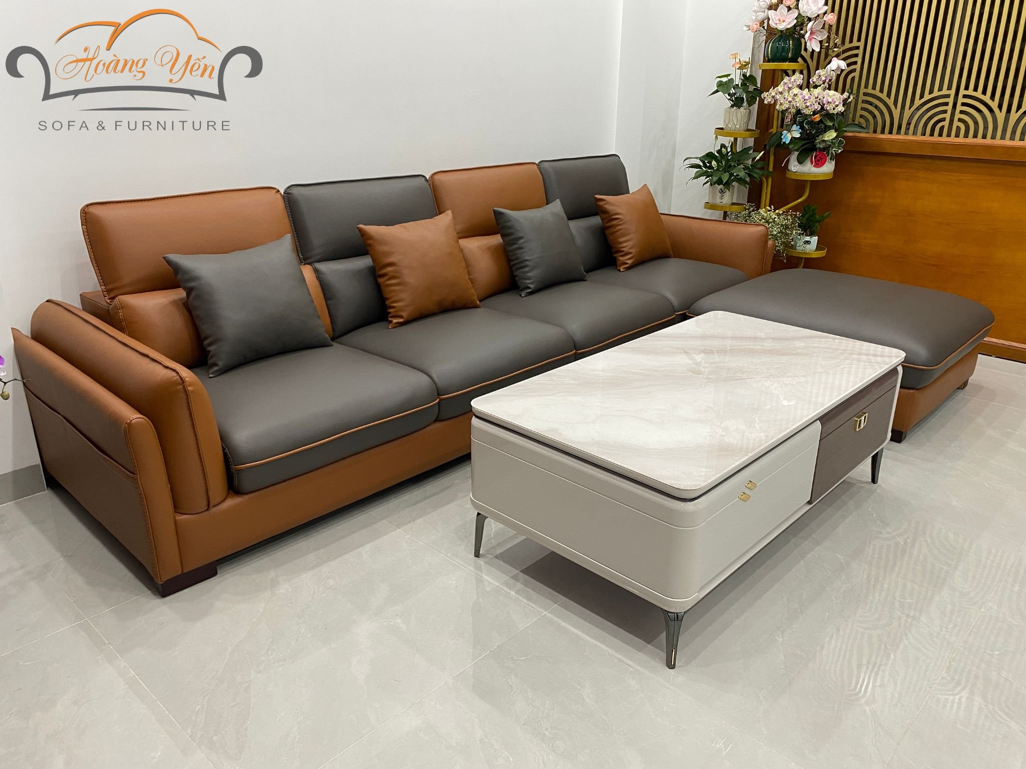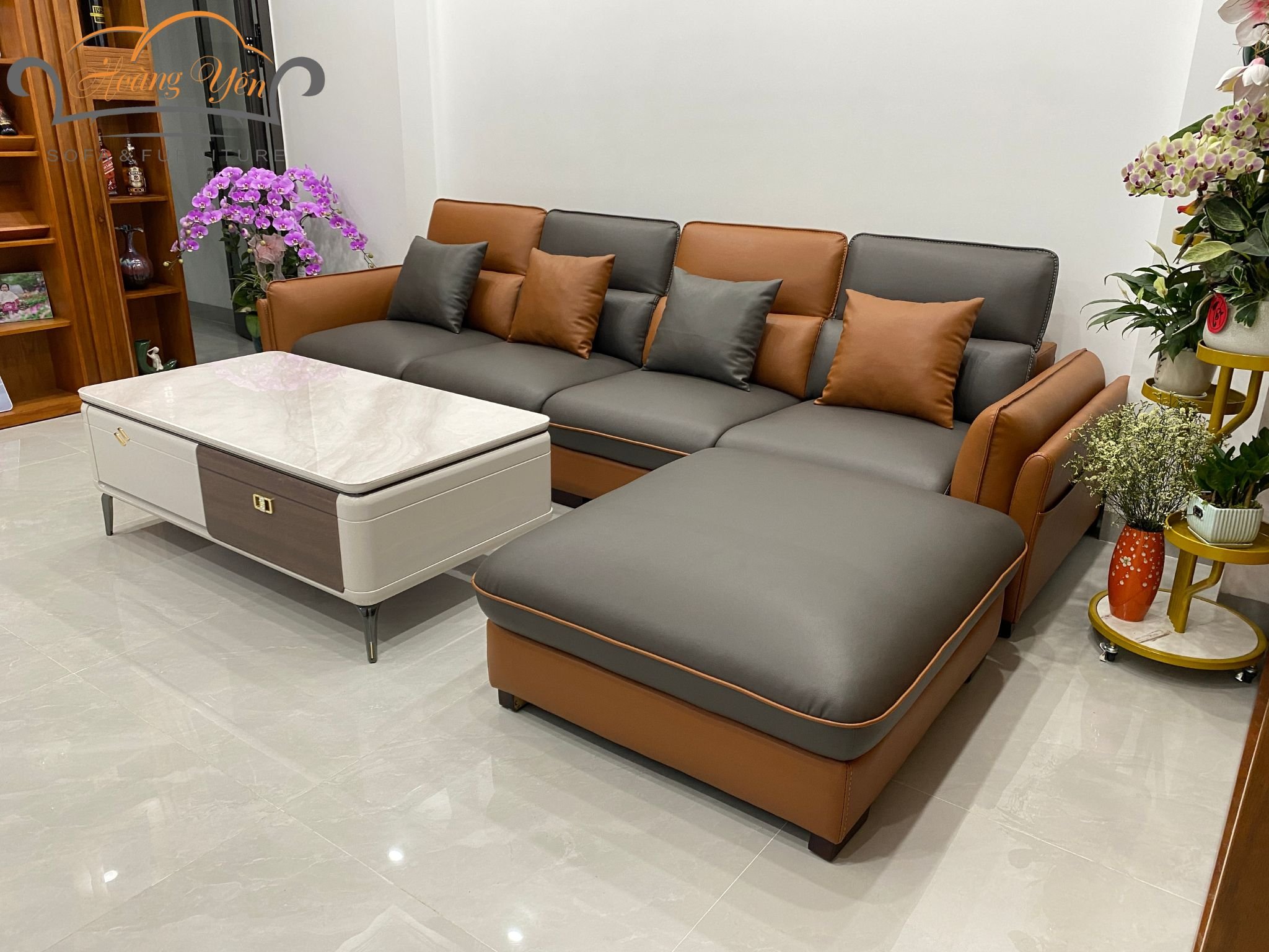 Đây là mẫu sofa da mang đến sự ấm cúng, hiện đại nhưng vẫn nổi bật cho không gian sinh hoạt chính của gia đình.
