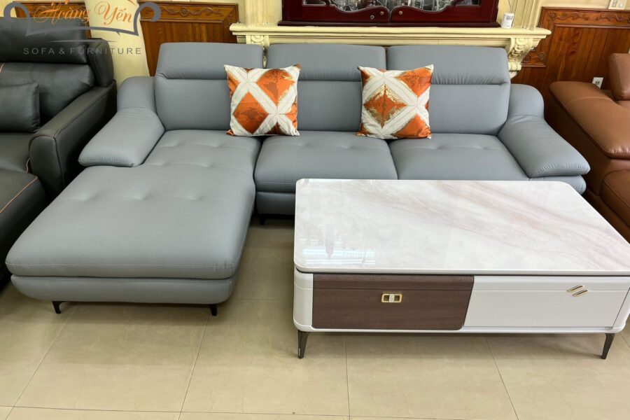 Sofa này được làm bằng da HC 2 lớp có bề mặt vân sần nhẹ, mềm mại, chịu được mài mòn và dễ vệ sinh.