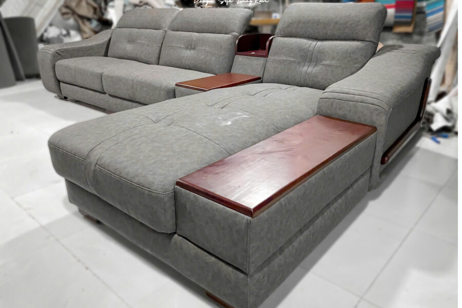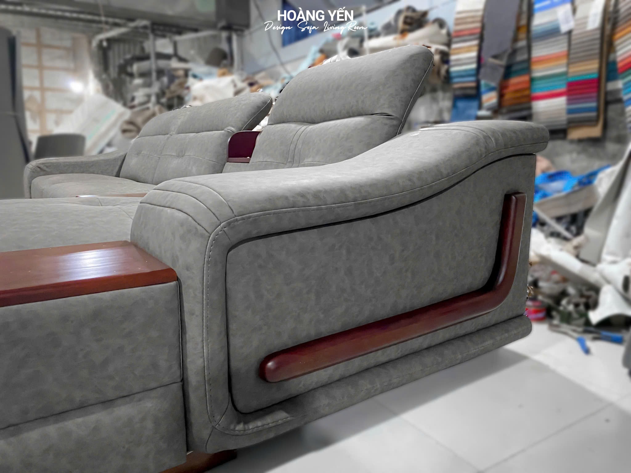 Mặt gỗ ốp ở phần tay ghế làm điểm nhấn sang trọng, phần gỗ ở đệm góc L và táp gỗ tiện ích cho việc để đồ.