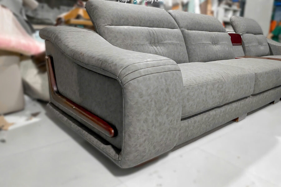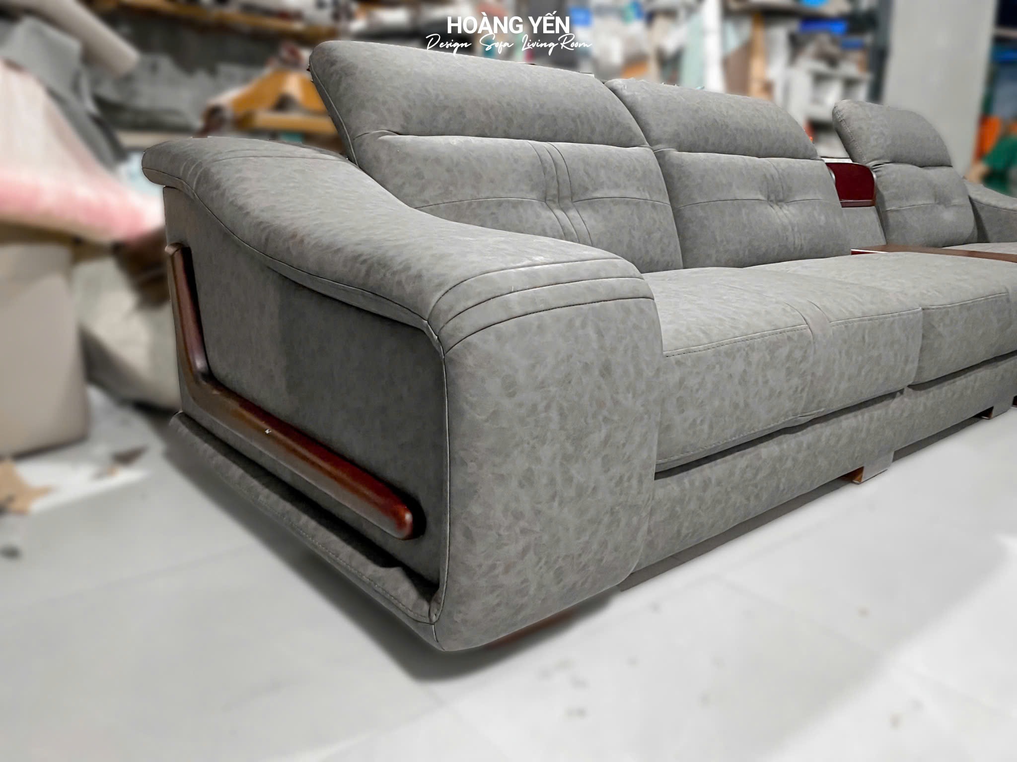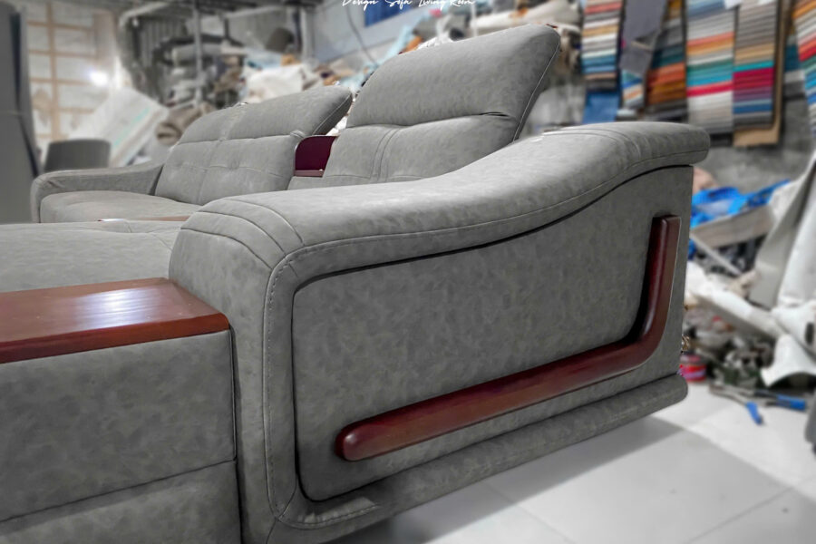 Màu sắc hài hòa với viền gỗ ở tay ghế và mặt gỗ trang trí, tạo sự đồng bộ trong toàn bộ thiết kế sofa.
