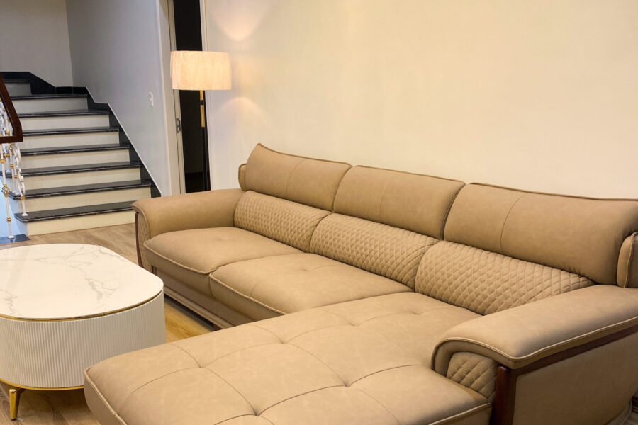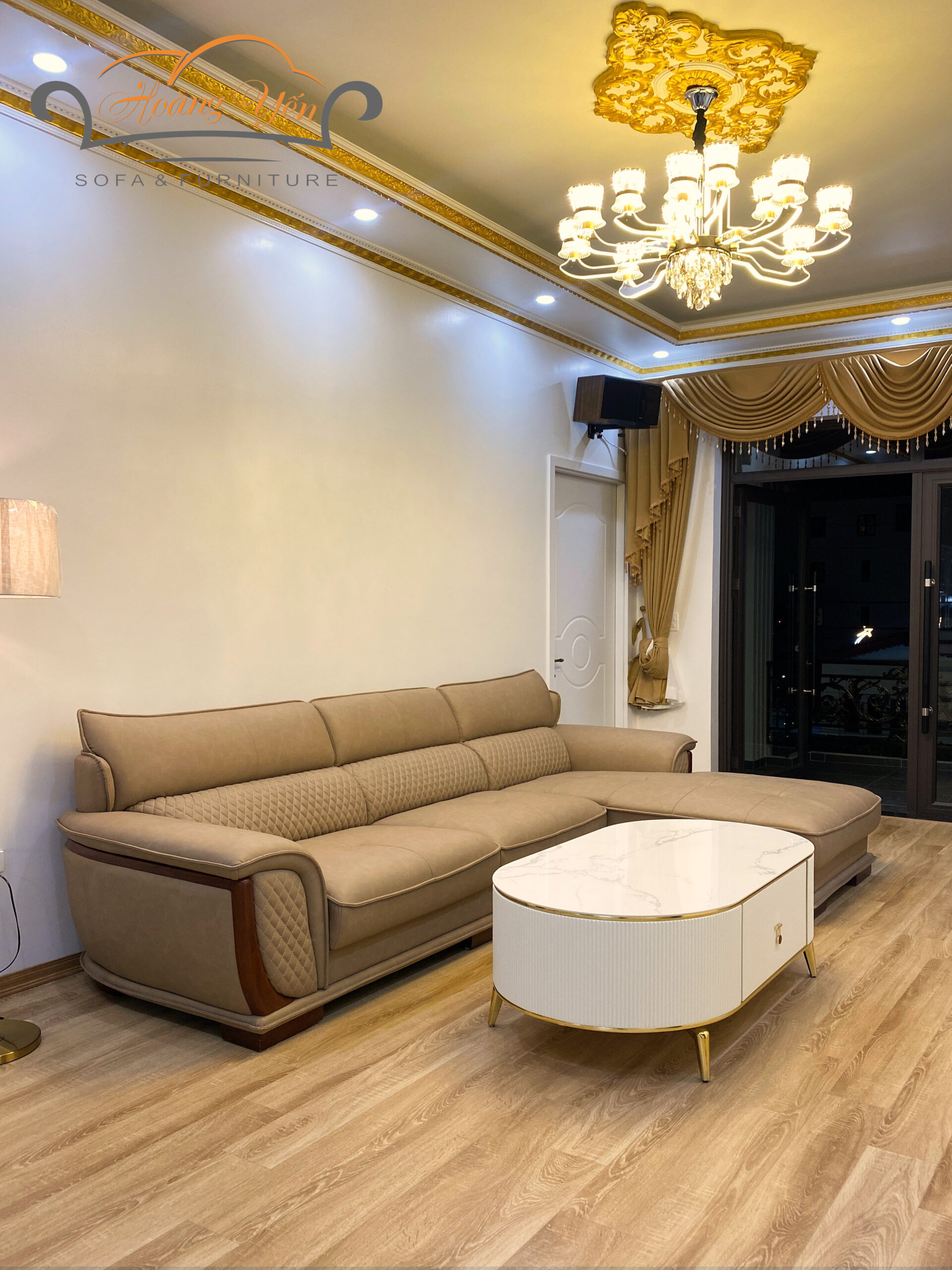 Bộ sofa góc được thiết kế theo phong cách sang trọng và lịch sự hợp với không gian phòng khách hiện đại và bán cổ điển.