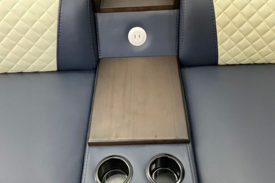 Bộ ghế hiện đại mang nét kì bí của biển cả, phần tiện ích mới là tráp trang trí có thể để bình hoa hoặc trà… và cổng sạc.