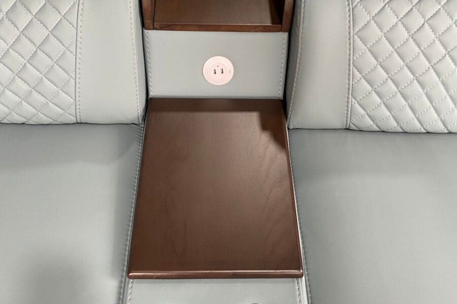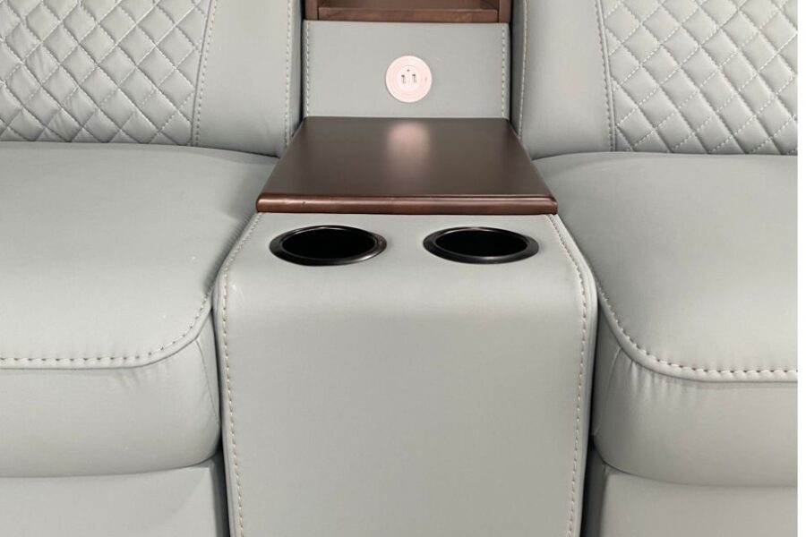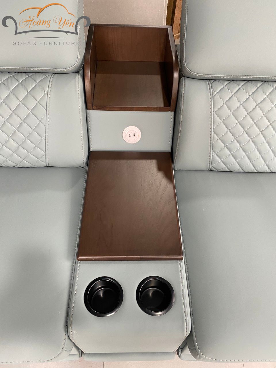 Phần tráp của sofa SHY354 là sự kết hợp hoàn hảo giữa da và gỗ, có ngăn để cốc nước và có cả phần trang trí lọ hoa.