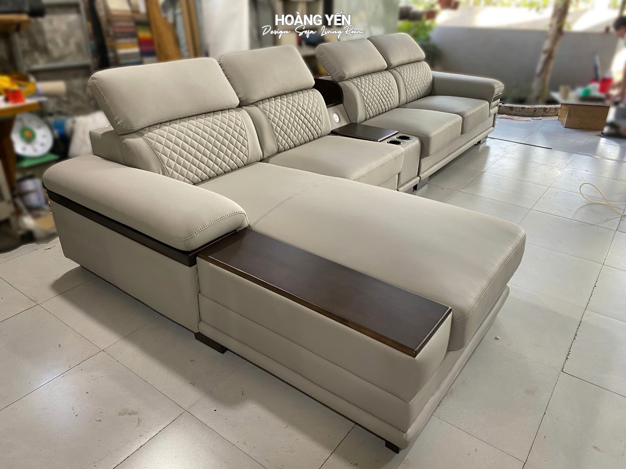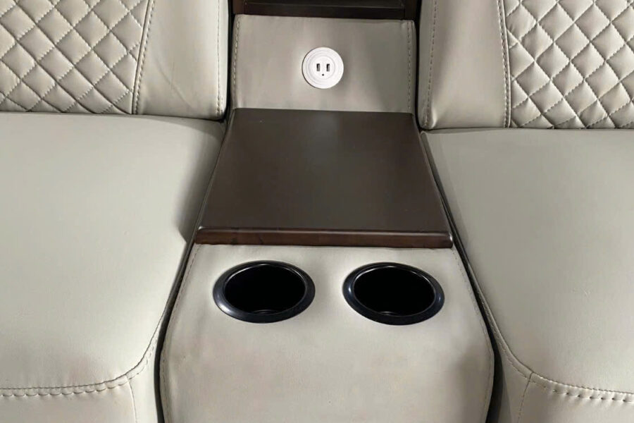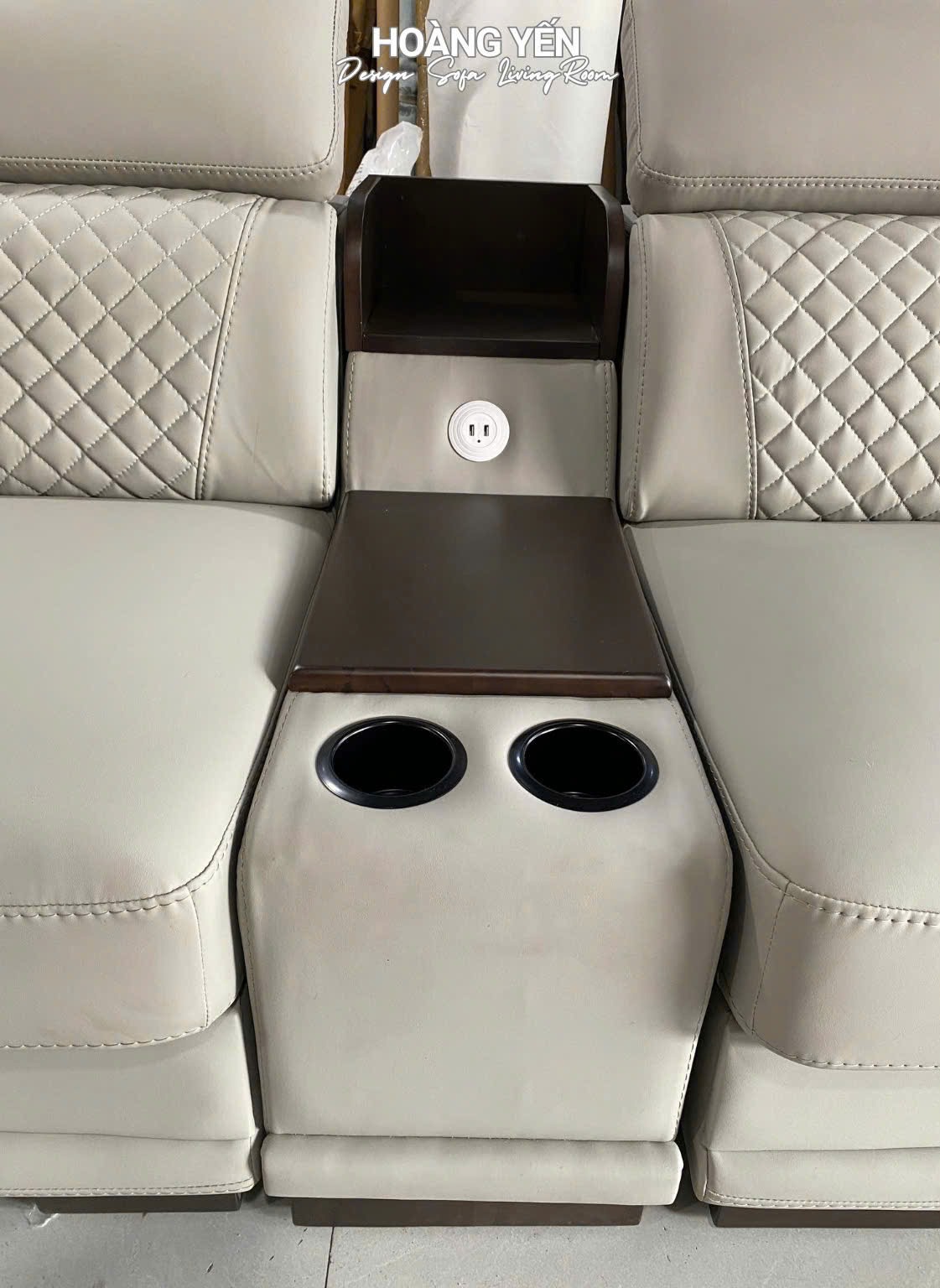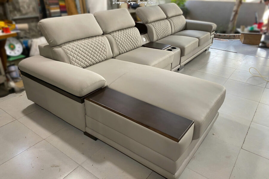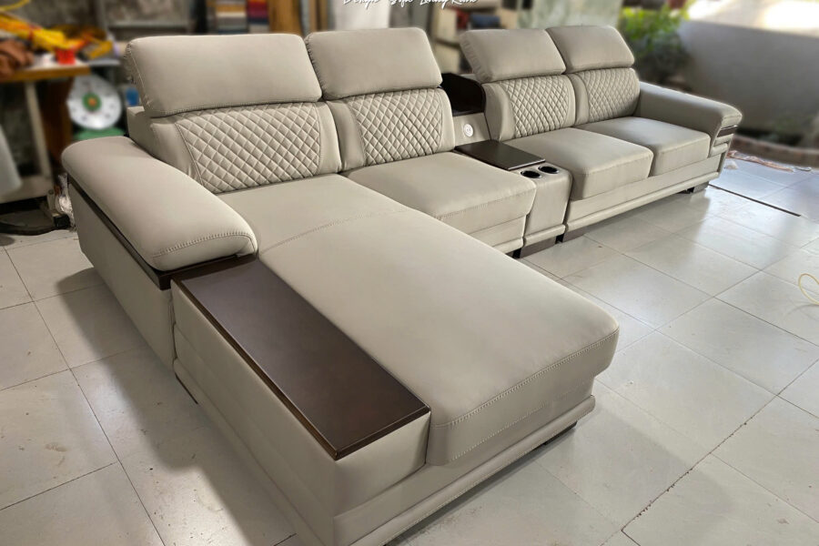 Sofa tích hợp tráp gỗ thông minh bao gồm hộc để cốc, bàn mini, cổng sạc USB tạo cảm giác tiện lợi, gọn gàng.