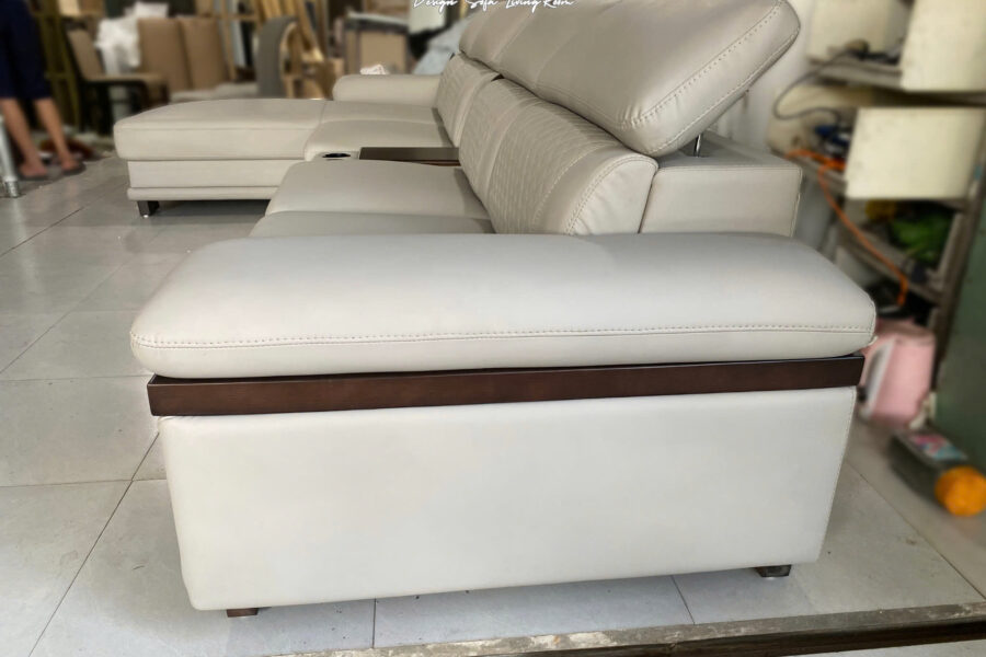Phần tráp gỗ tích hợp trên bộ sofa da này là một chi tiết nổi bật, vừa đẹp mắt vừa cực kỳ thực dụng.
