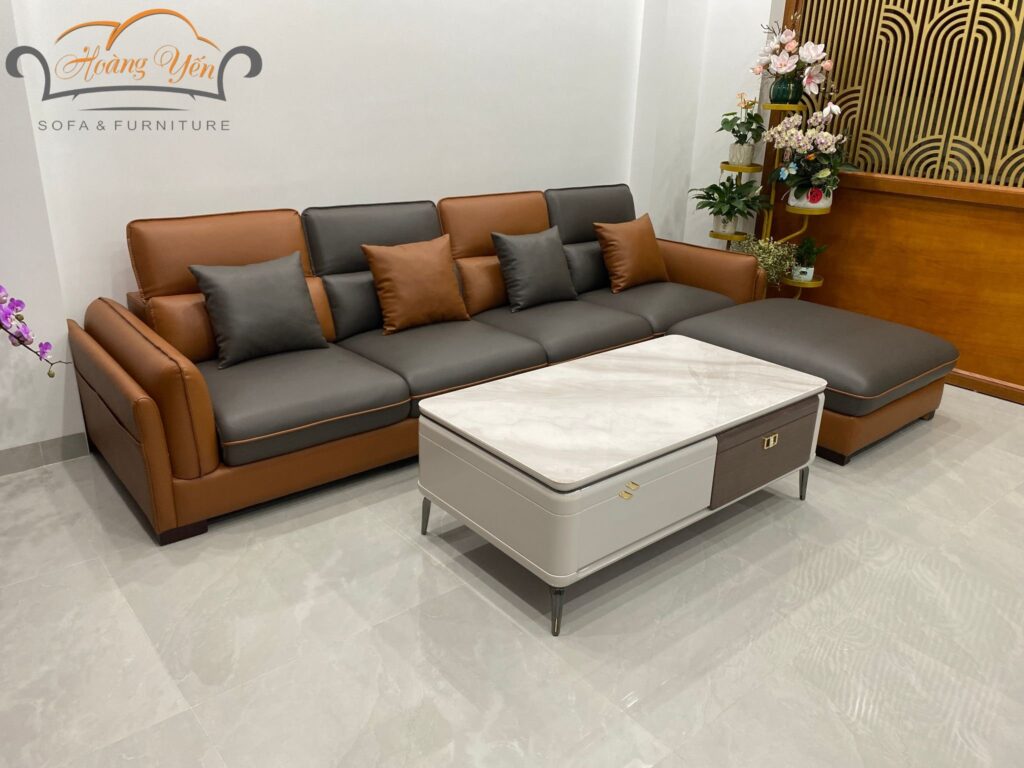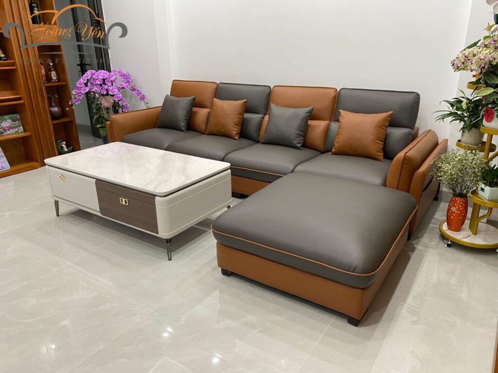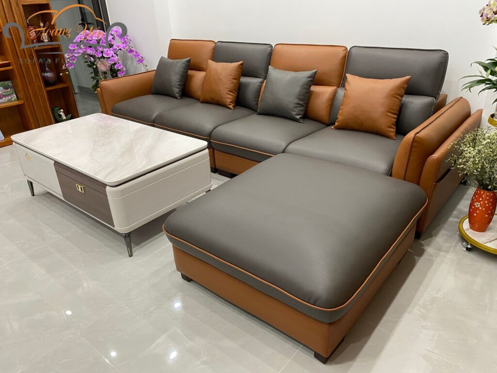 Đây là mẫu sofa da mang đến sự ấm cúng, hiện đại nhưng vẫn nổi bật cho không gian sinh hoạt chính của gia đình.