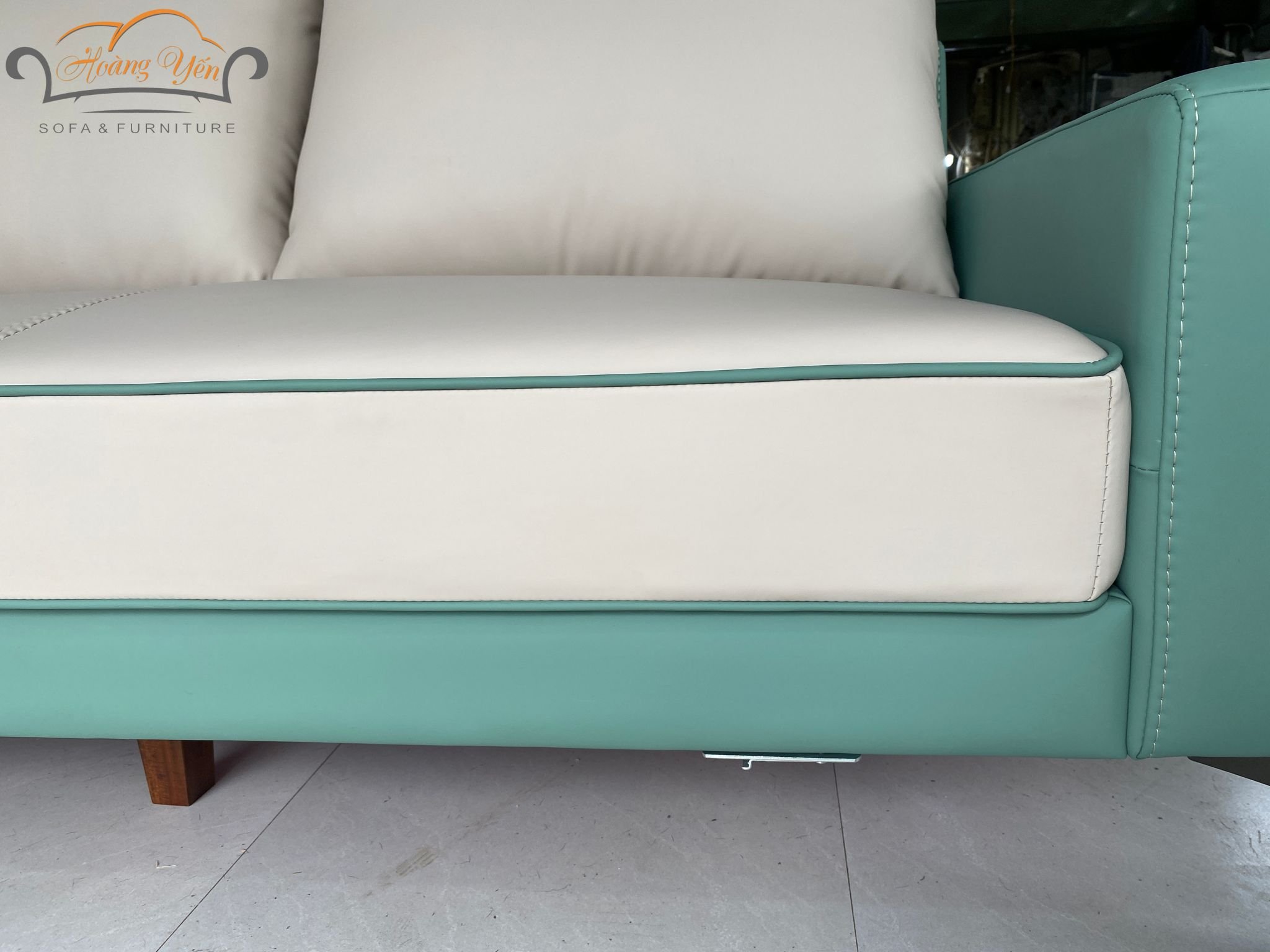 Tay ghế xanh ngọc lam gợi cảm giác mát mẻ, thư thái, giúp tổng thể sofa nổi bật mà không quá sặc sỡ.