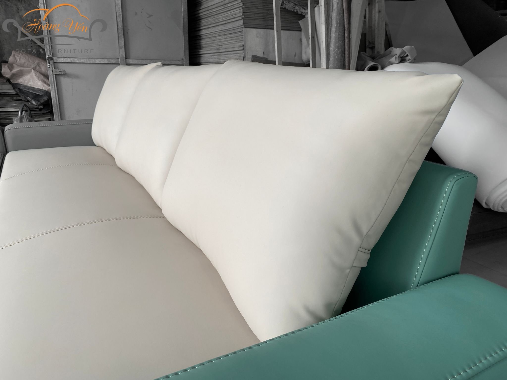Tựa lưng chính xanh ngọc nhạt và tựa rời trắng đối lập, đa năng, dễ vệ sinh và tối ưu hóa trải nghiệm người dùng.