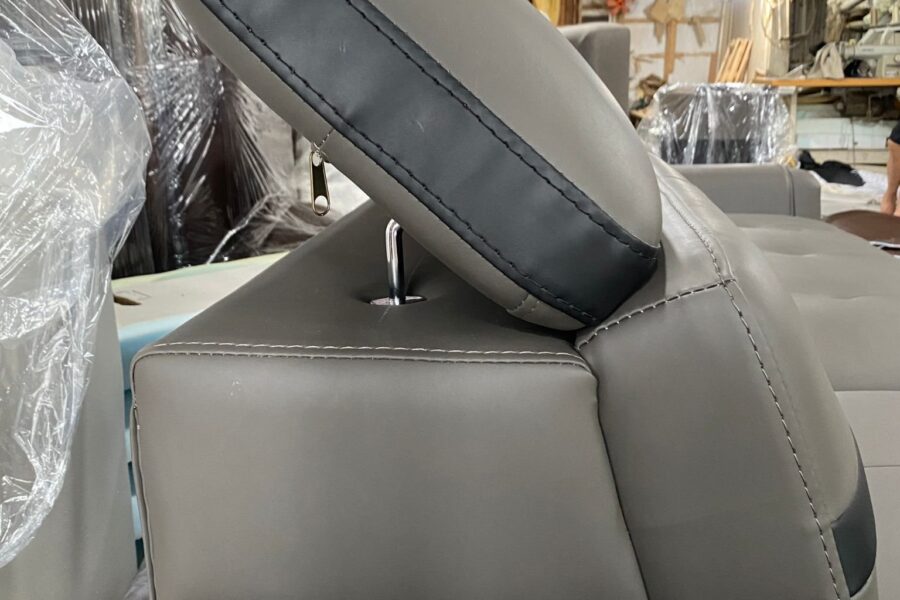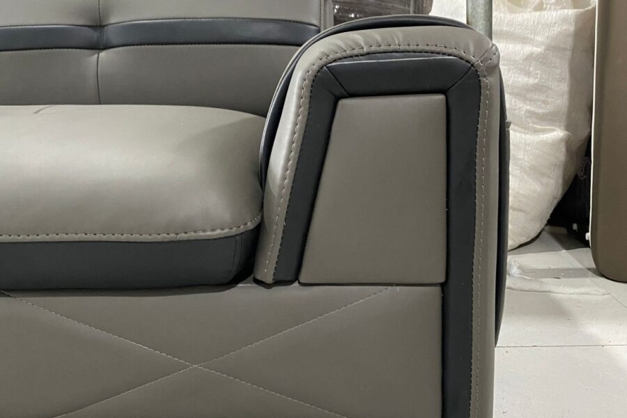 Kết hợp hài hòa giữa da xám và các chi tiết viền da đen làm tăng chiều sâu và sự mạnh mẽ cho tổng thể ghế.