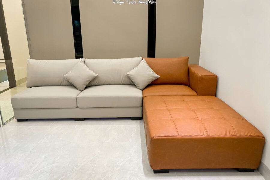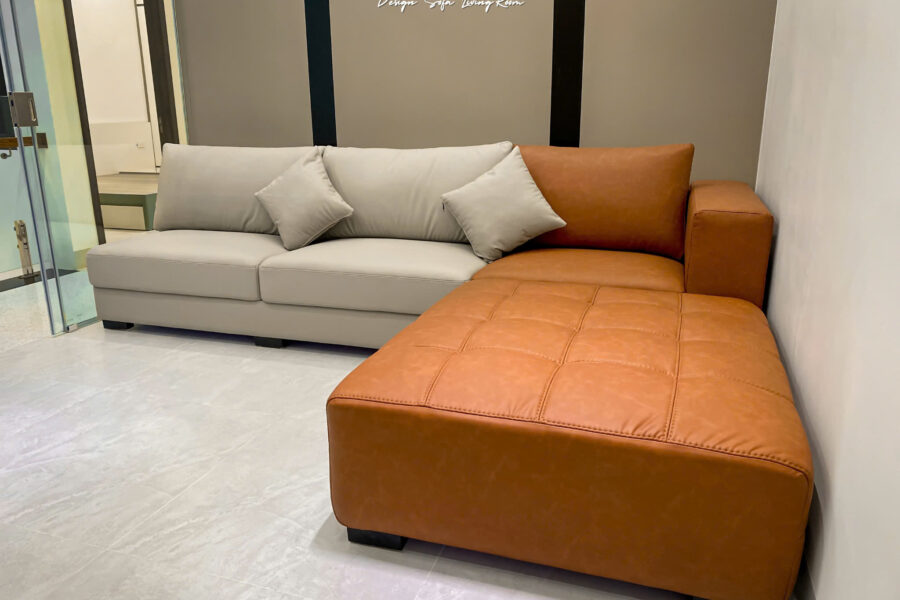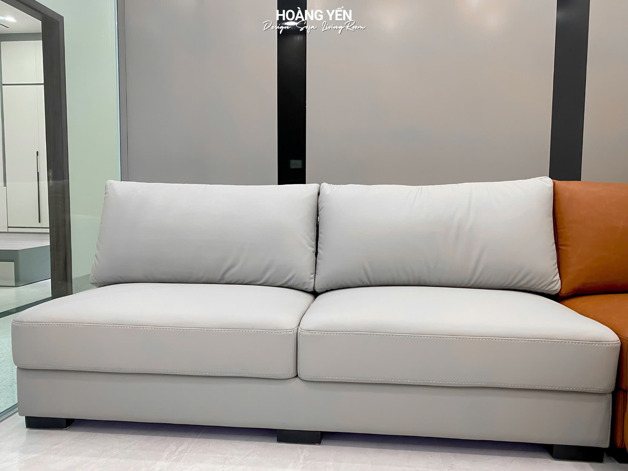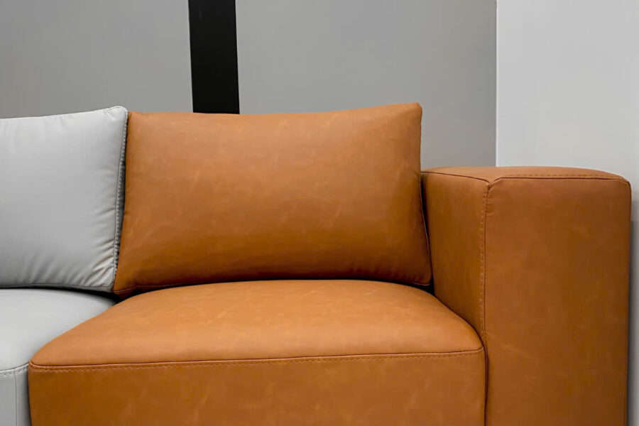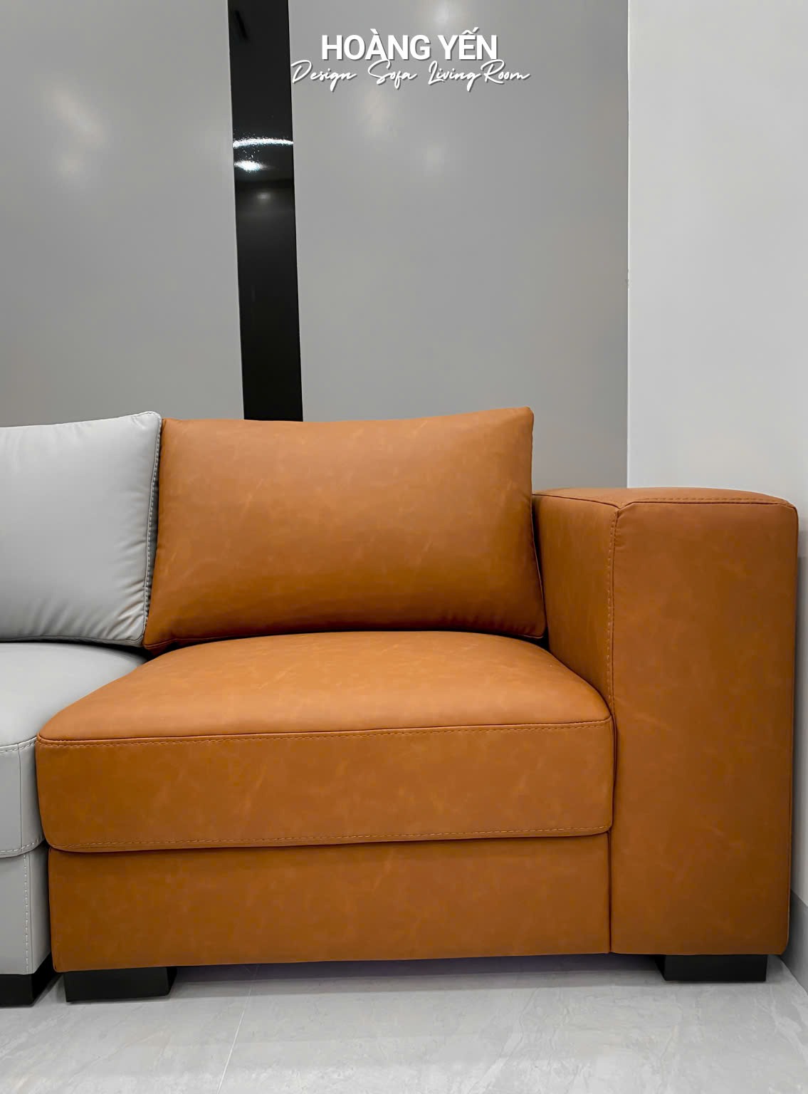 Sofa da góc L SHY422 nổi bật nhờ hình khối rõ ràng và cách phối màu độc đáo.