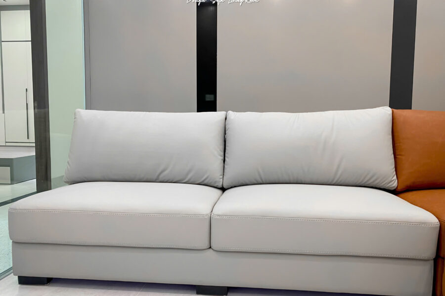 Lưng ghế sofa chia khoang rõ ràng, sử dụng gối tựa rời thay vì lưng ghế liền, kết hợp cùng các đường may đơn giản, chỉn chu.