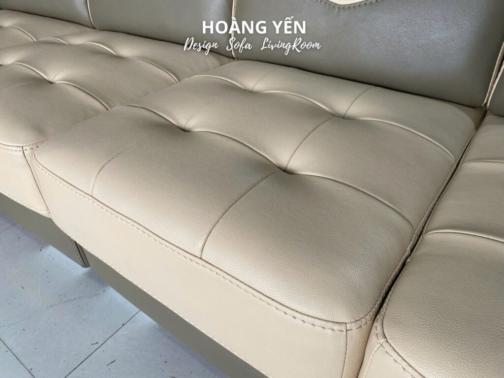 Phần đệm ngồi của bộ sofa được thiết kế theo dáng phẳng chia khoang, với những đường may lõm dạng caro nhẹ.