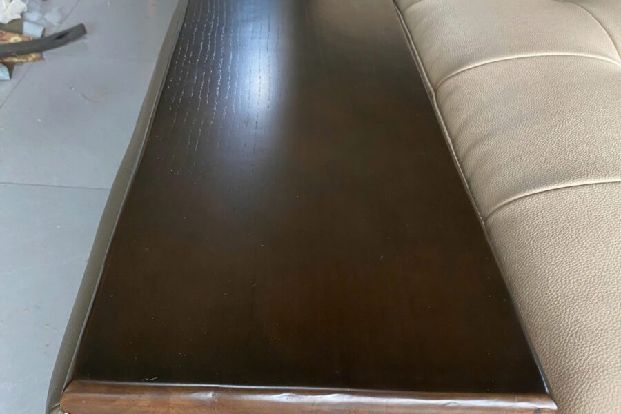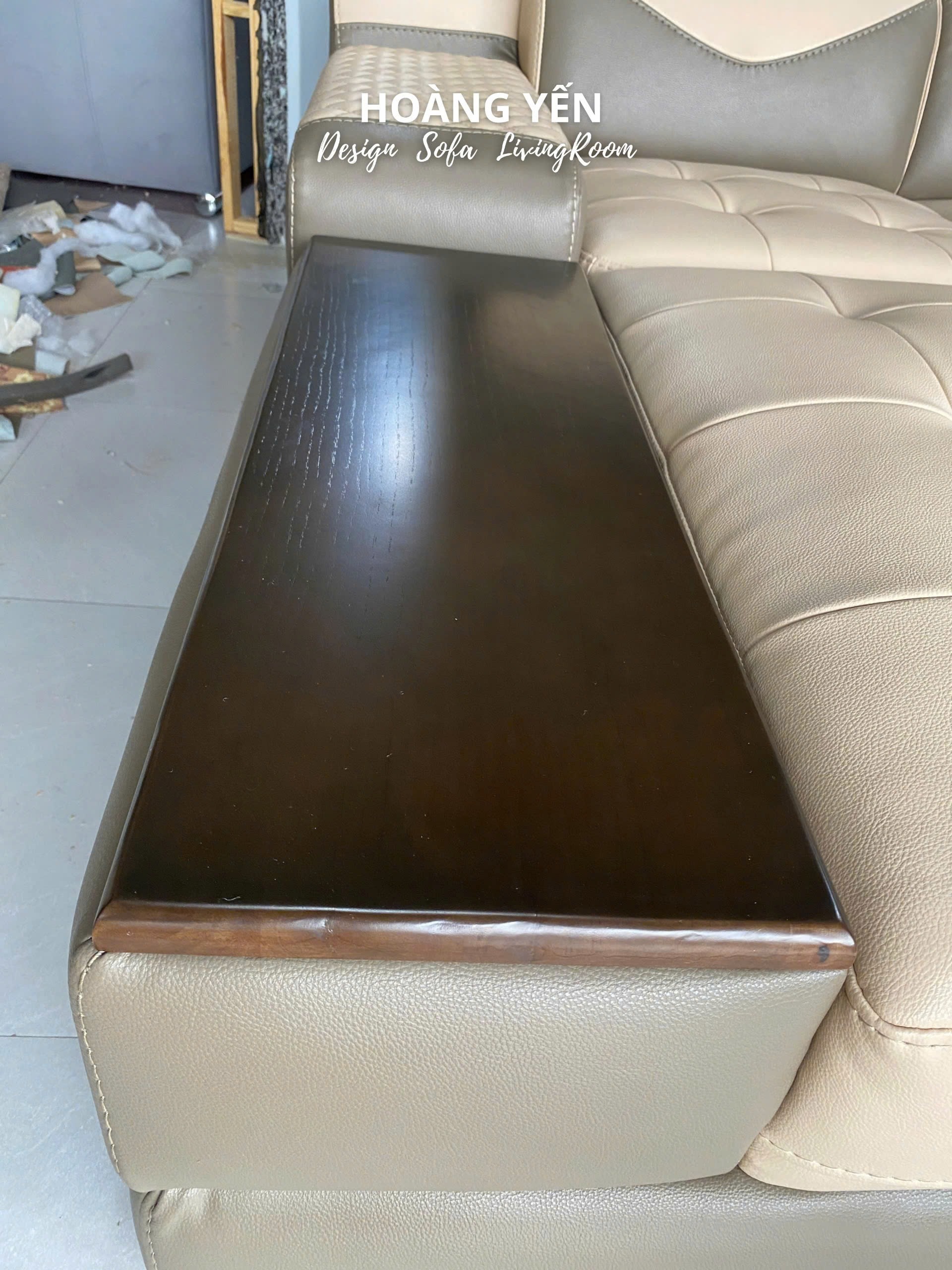 Mặt gỗ vuông đen bóng, đóng vai trò như bàn trà mini hoặc khay để đồ, rất tiện dụng và tạo điểm nhấn sang trọng cho khối đệm.