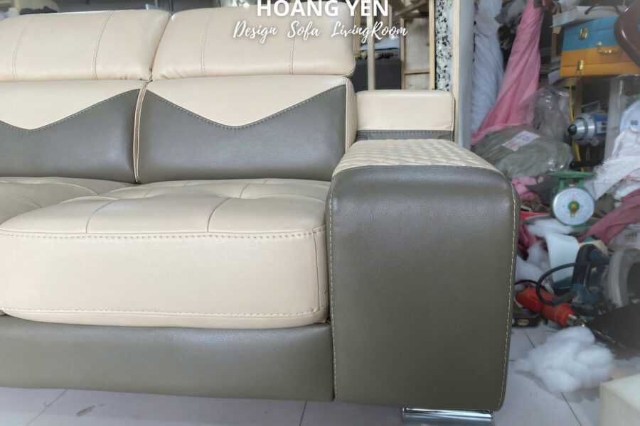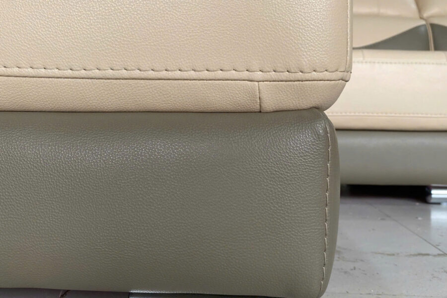 Sofa da góc L SHY427 phối màu hai tông kem, xám rêu tạo sự tương phản hài hòa, mà vẫn giữ được nét sang trọng.