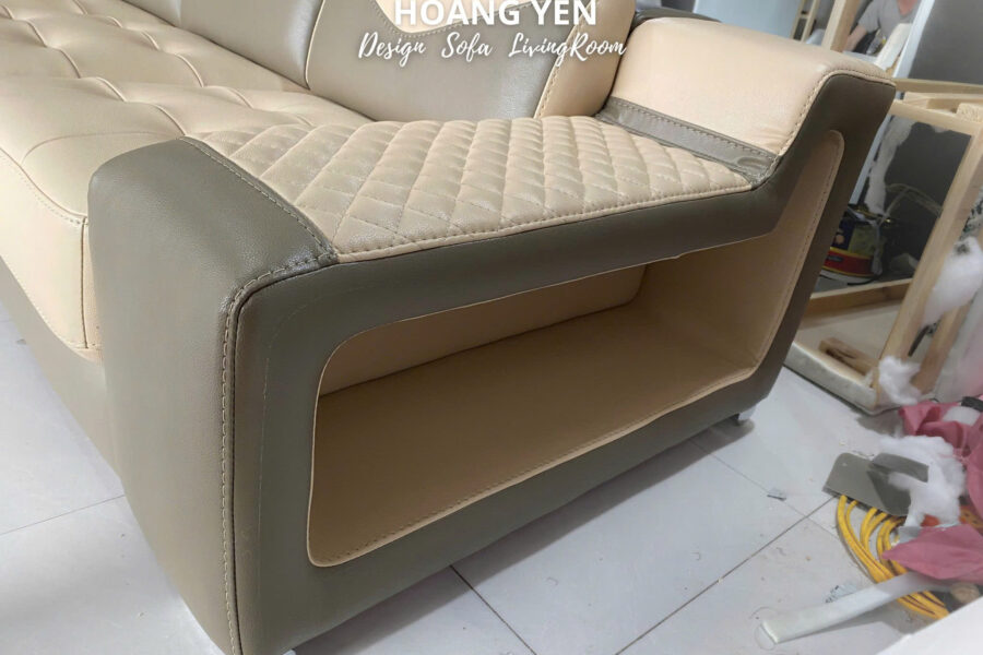 Sofa độc đáo với đường may quả trám và kệ mở bên hông tay, vừa tăng tính thẩm mỹ, vừa tiện lợi để đặt sách, đồ trang trí.