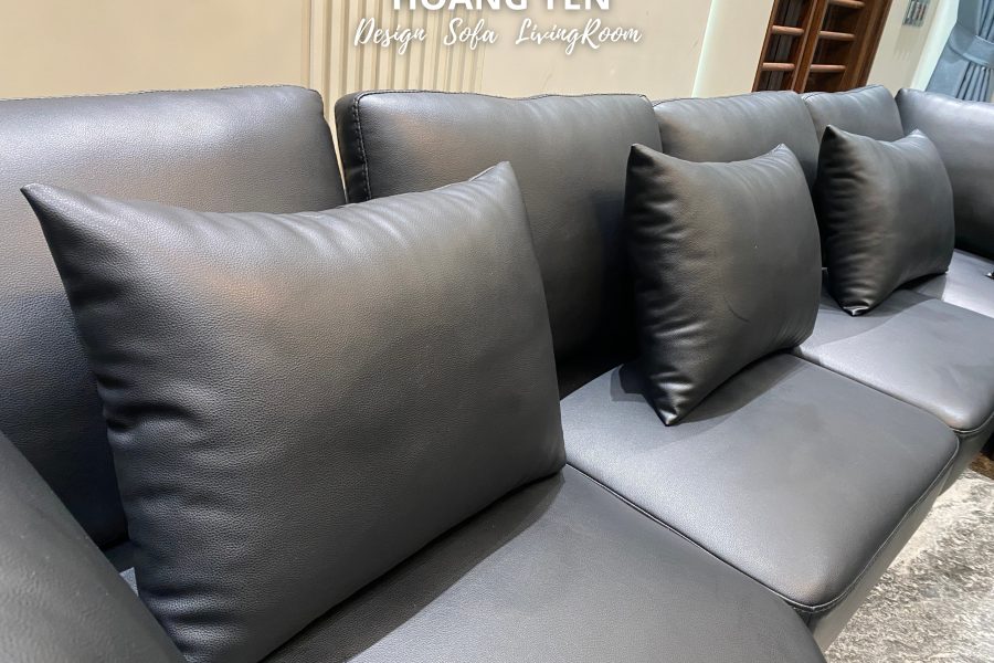 Sofa da phòng khách sử dụng tông màu ghi đậm mang lại cảm giác sang trọng và mạnh mẽ.