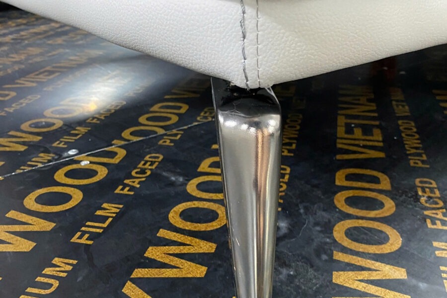 Chân ghế có màu kim loại ánh bạc nhám, hài hòa với lớp da ghi sáng.