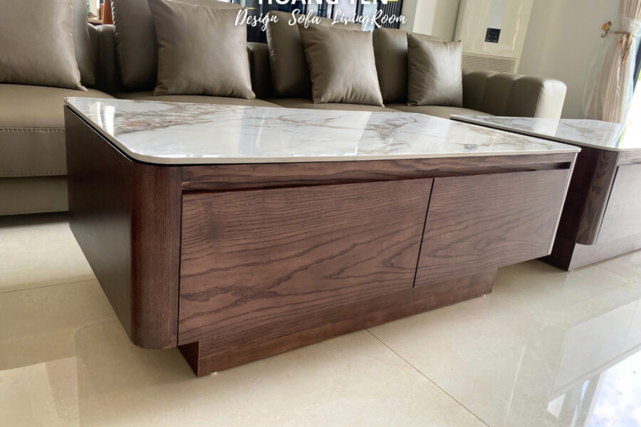 Sắc gỗ trầm ấm khiến phần góc sofa trở nên cuốn hút, tạo hiệu ứng tương phản bắt mắt.