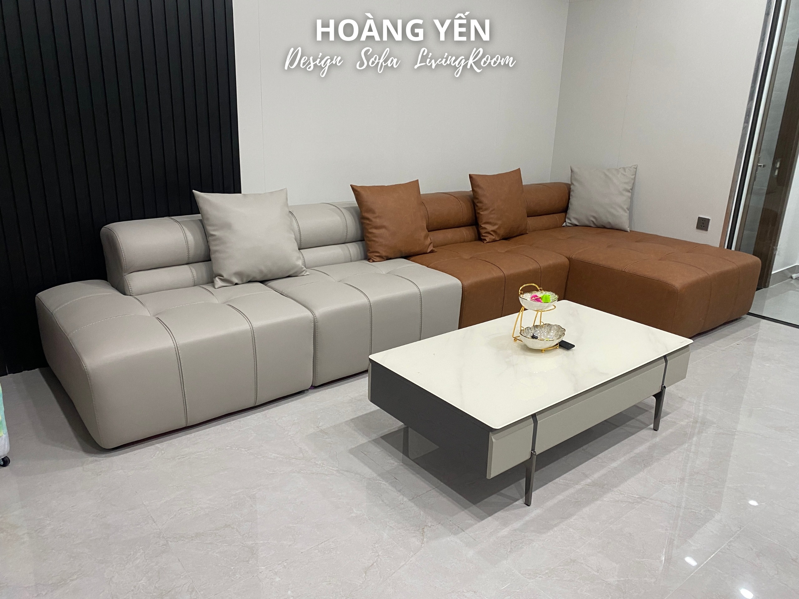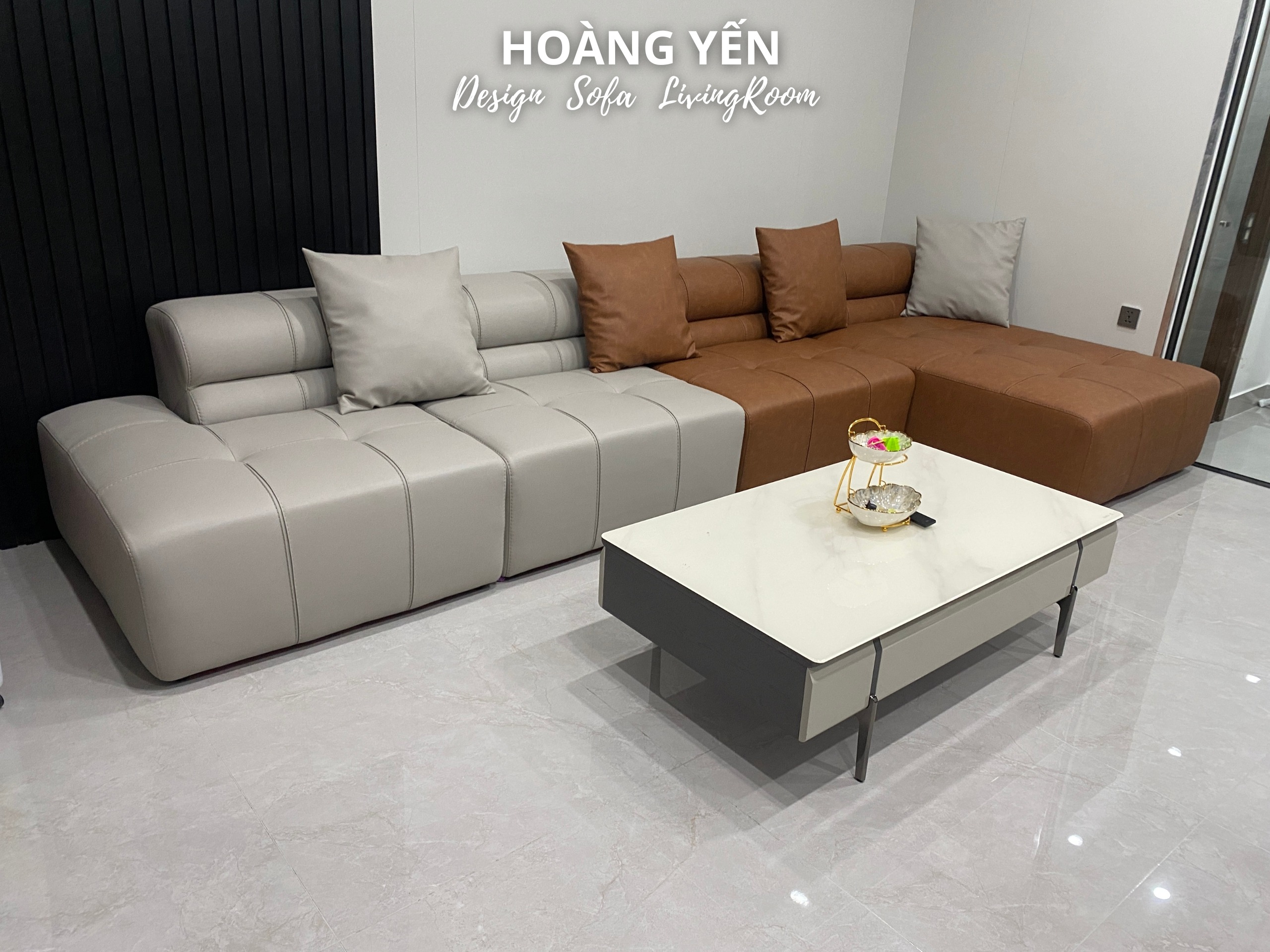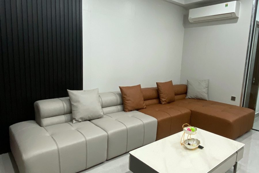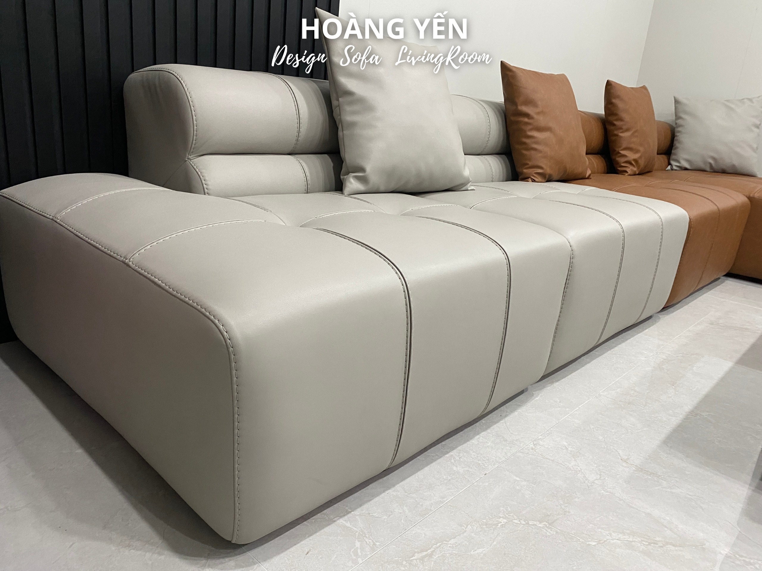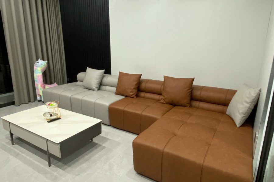 Sofa da góc L kết hợp 2 tone tương phản tạo điểm nhấn phá cách.
