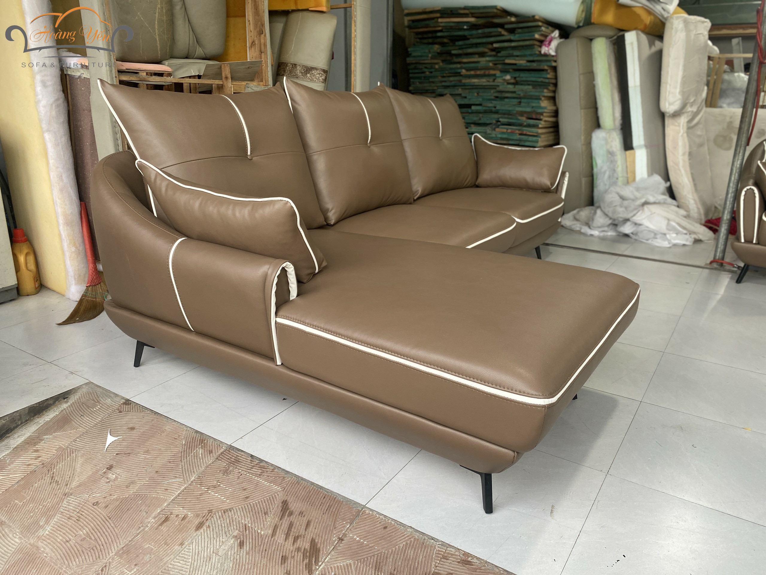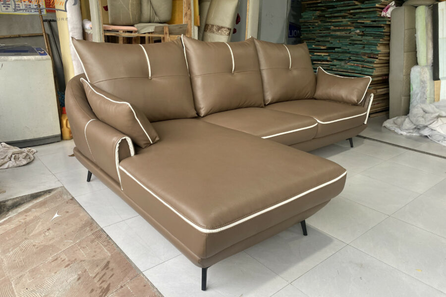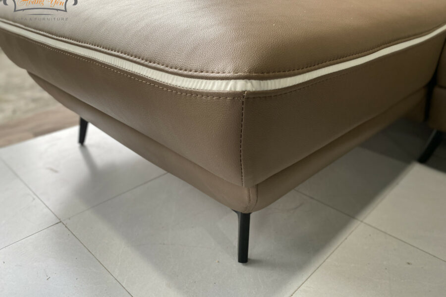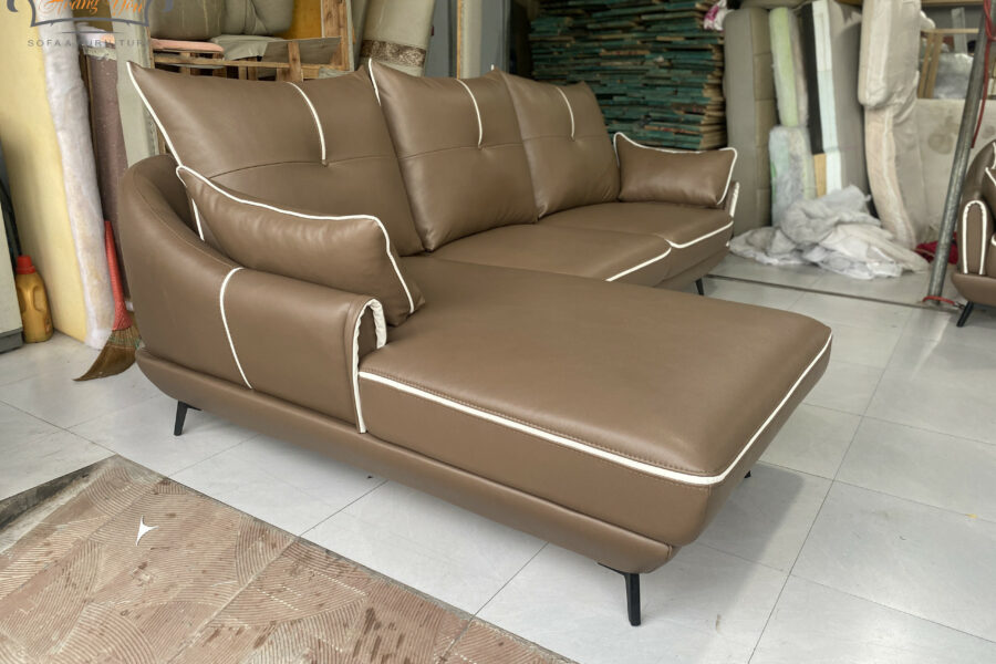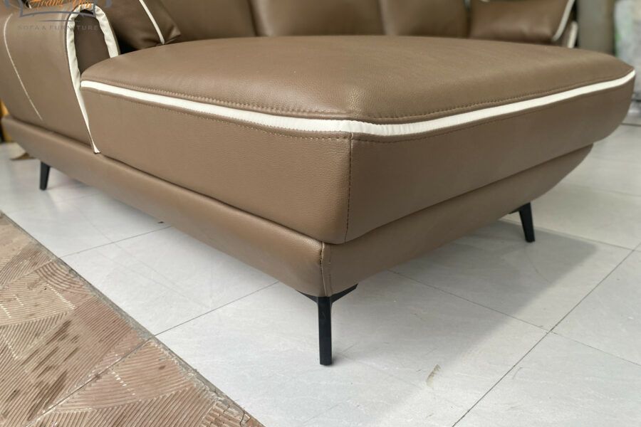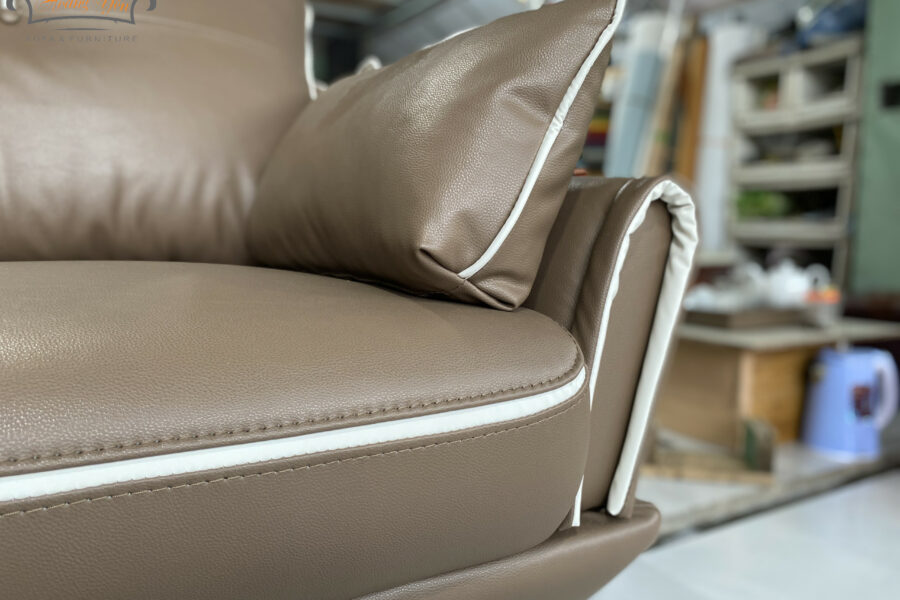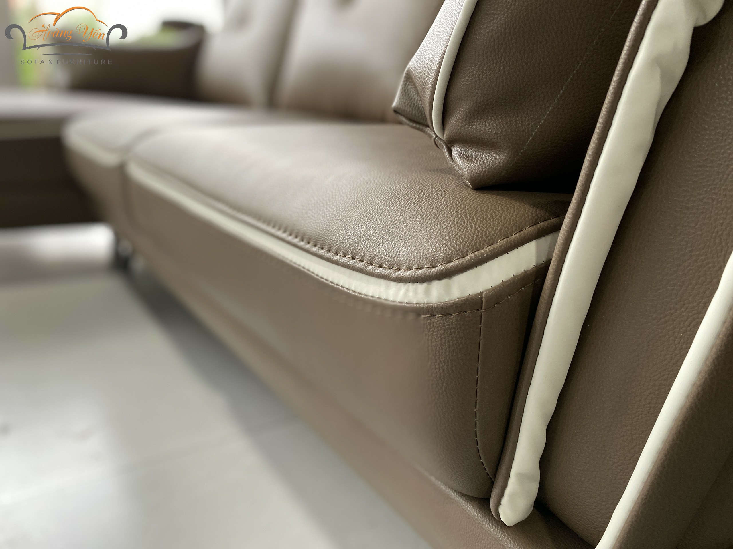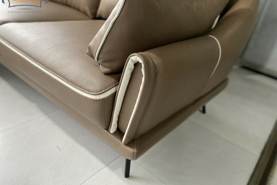 Sofa nâu sữa trầm ấm kết hợp cùng đường viền trắng chạy quanh mép ghế, tạo nên sự tương phản.