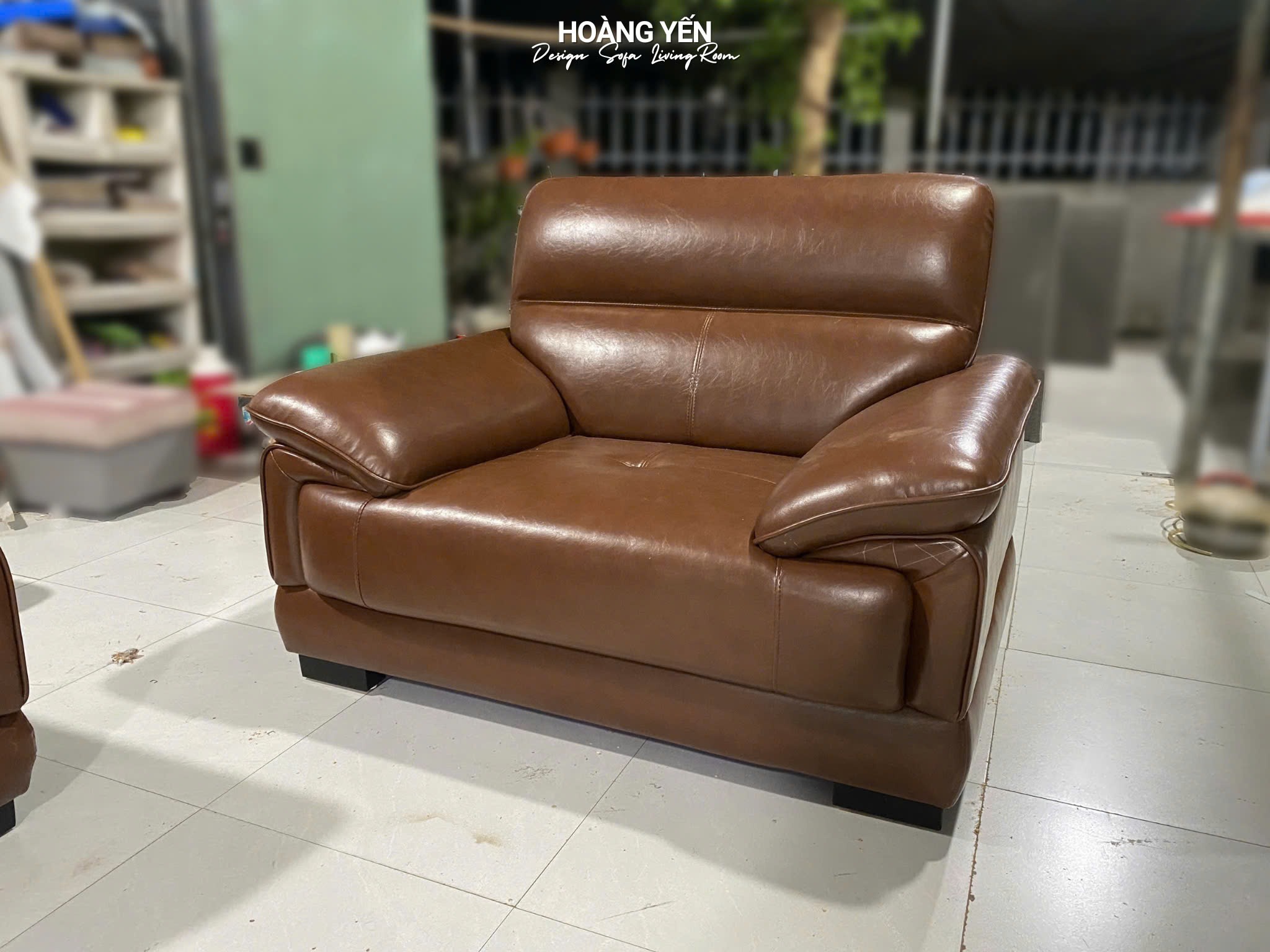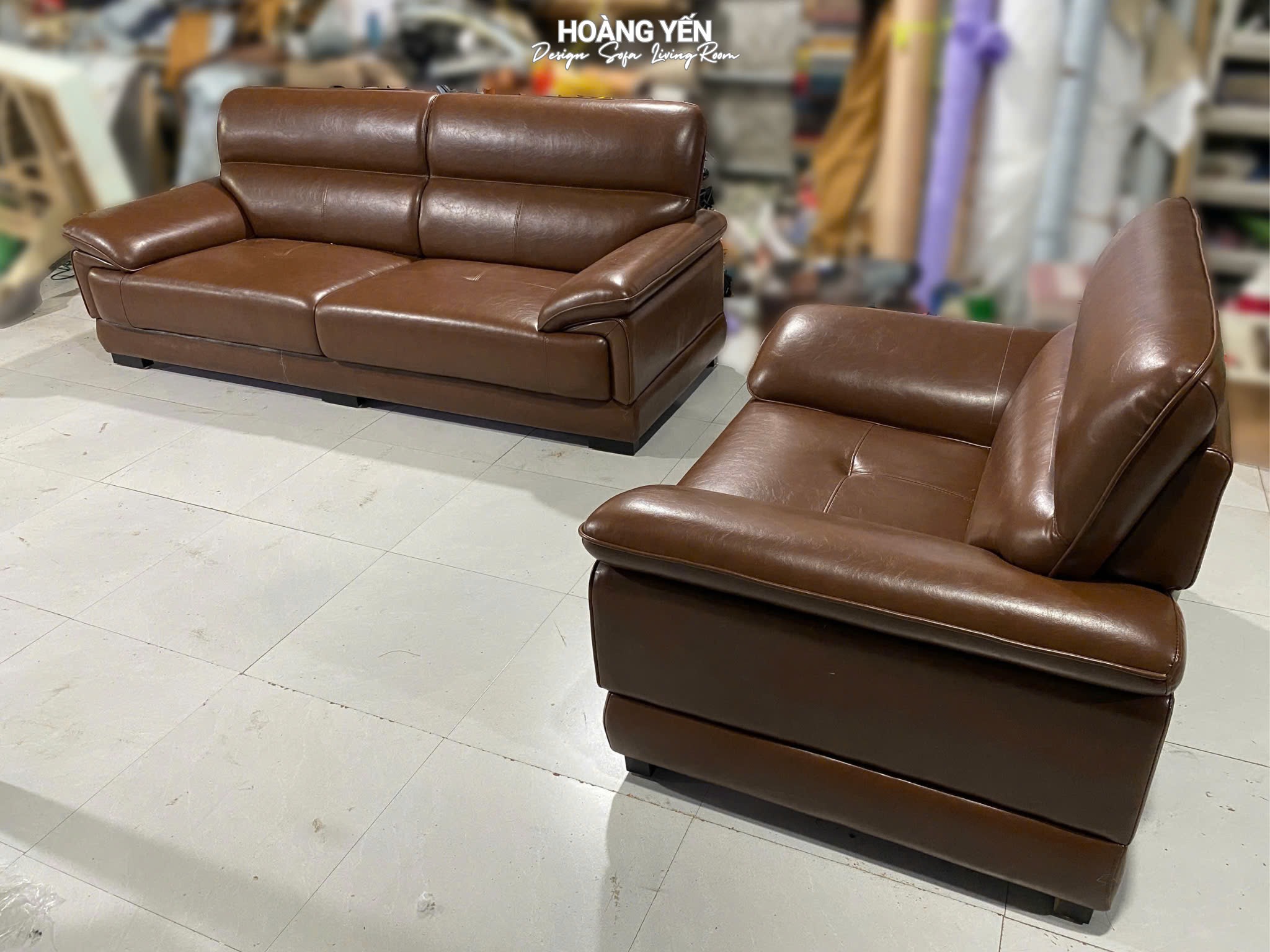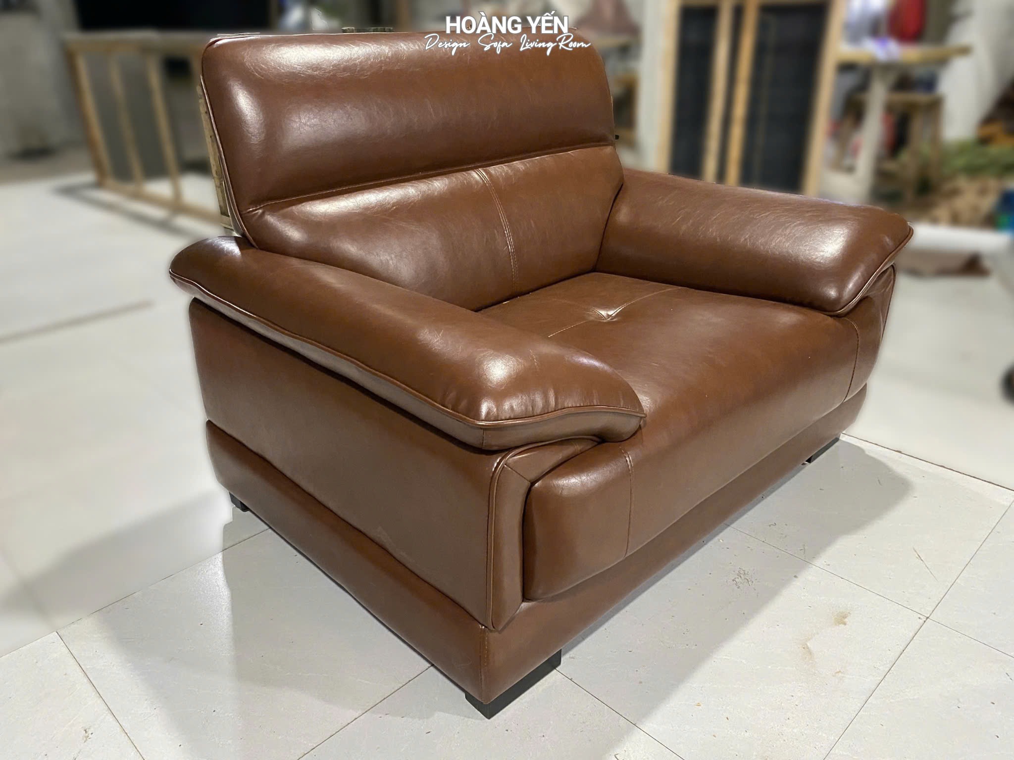 Sofa phòng khách SHY405 nâu bóng gồm một văng dài và một ghế đơn, gây ấn tượng mạnh bởi lớp da nâu bóng mịn.