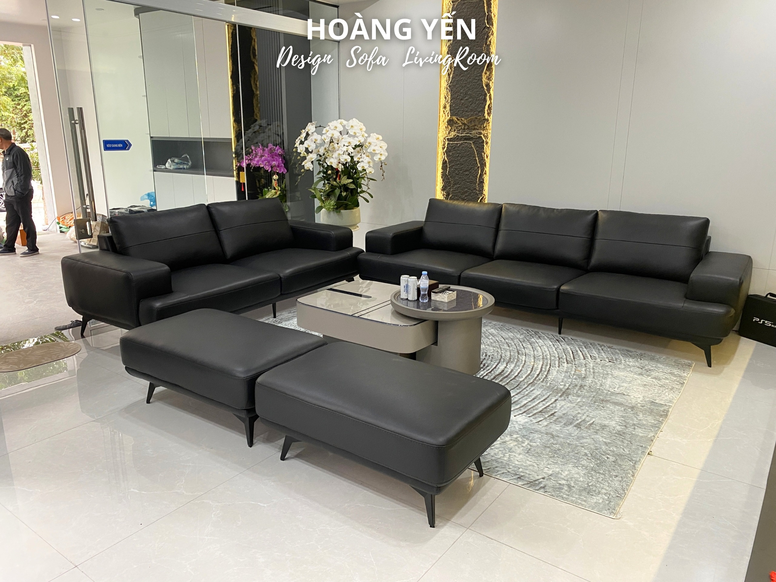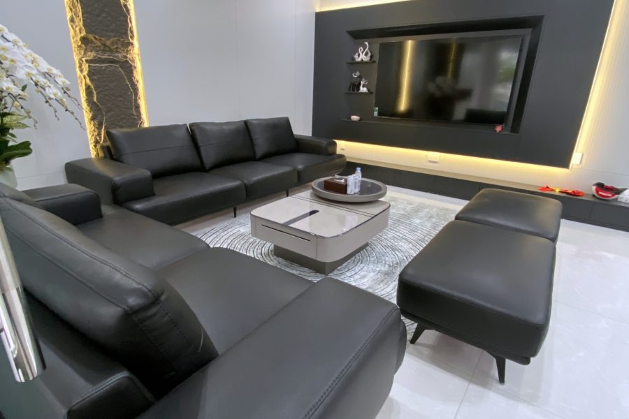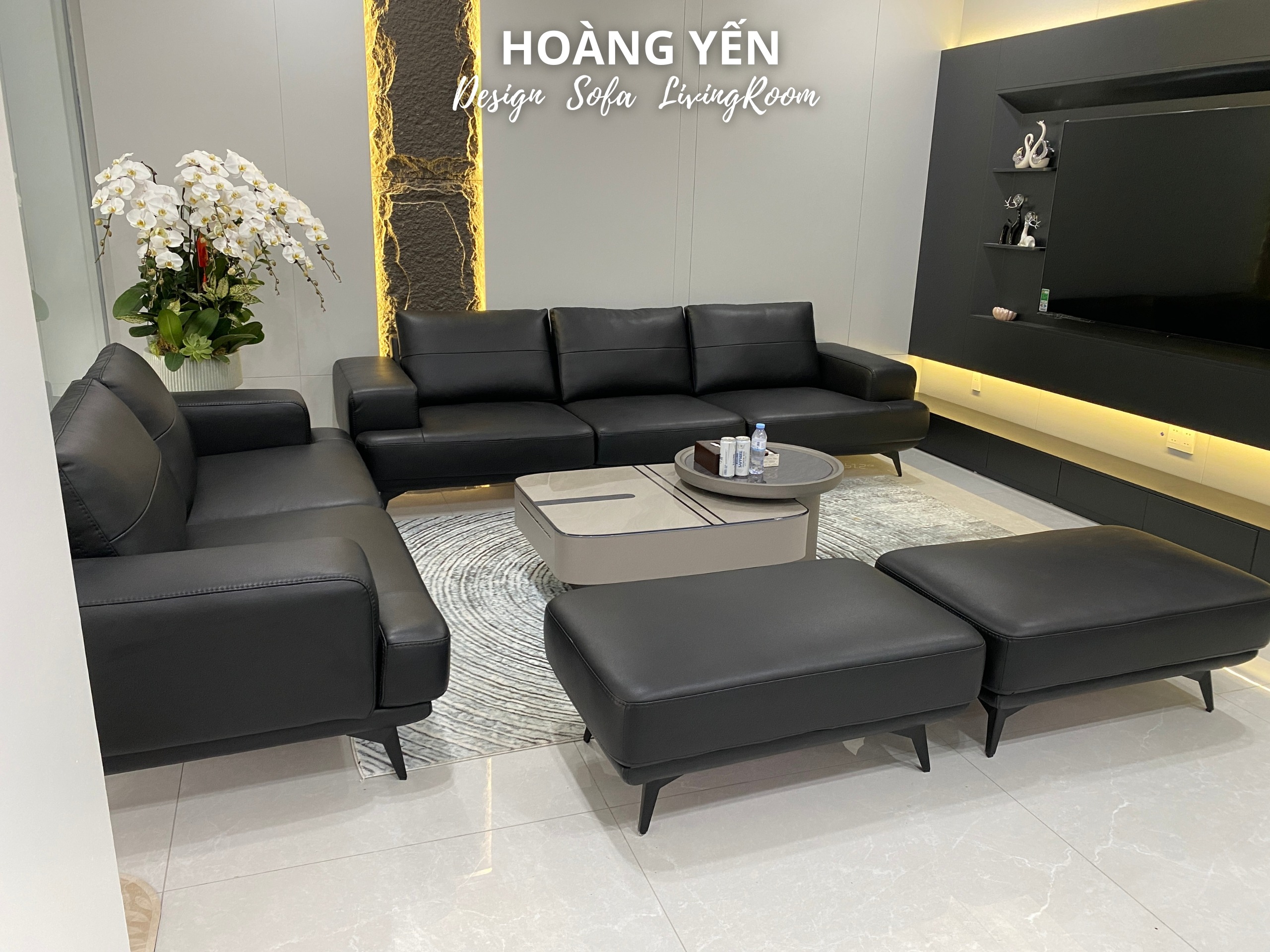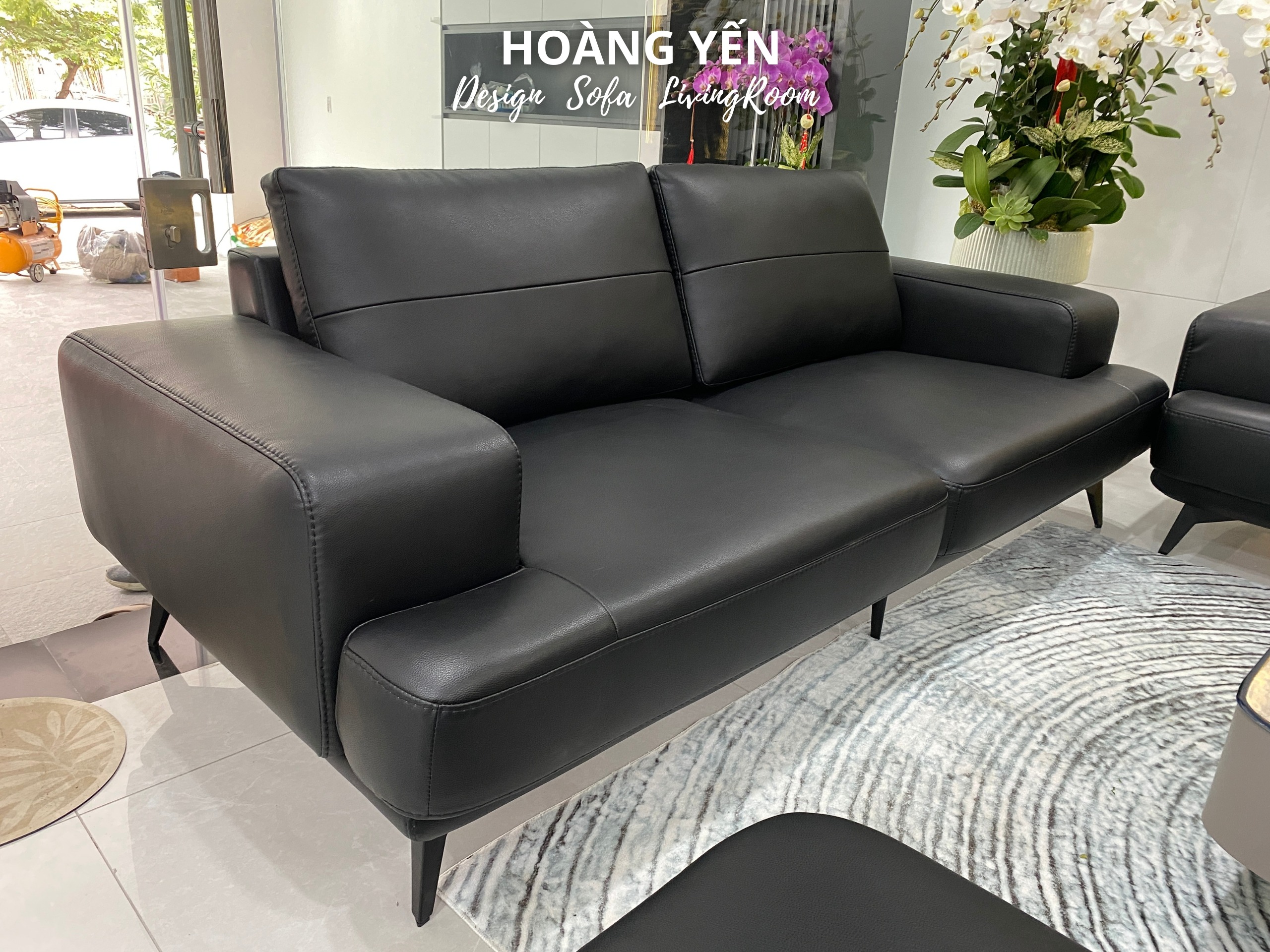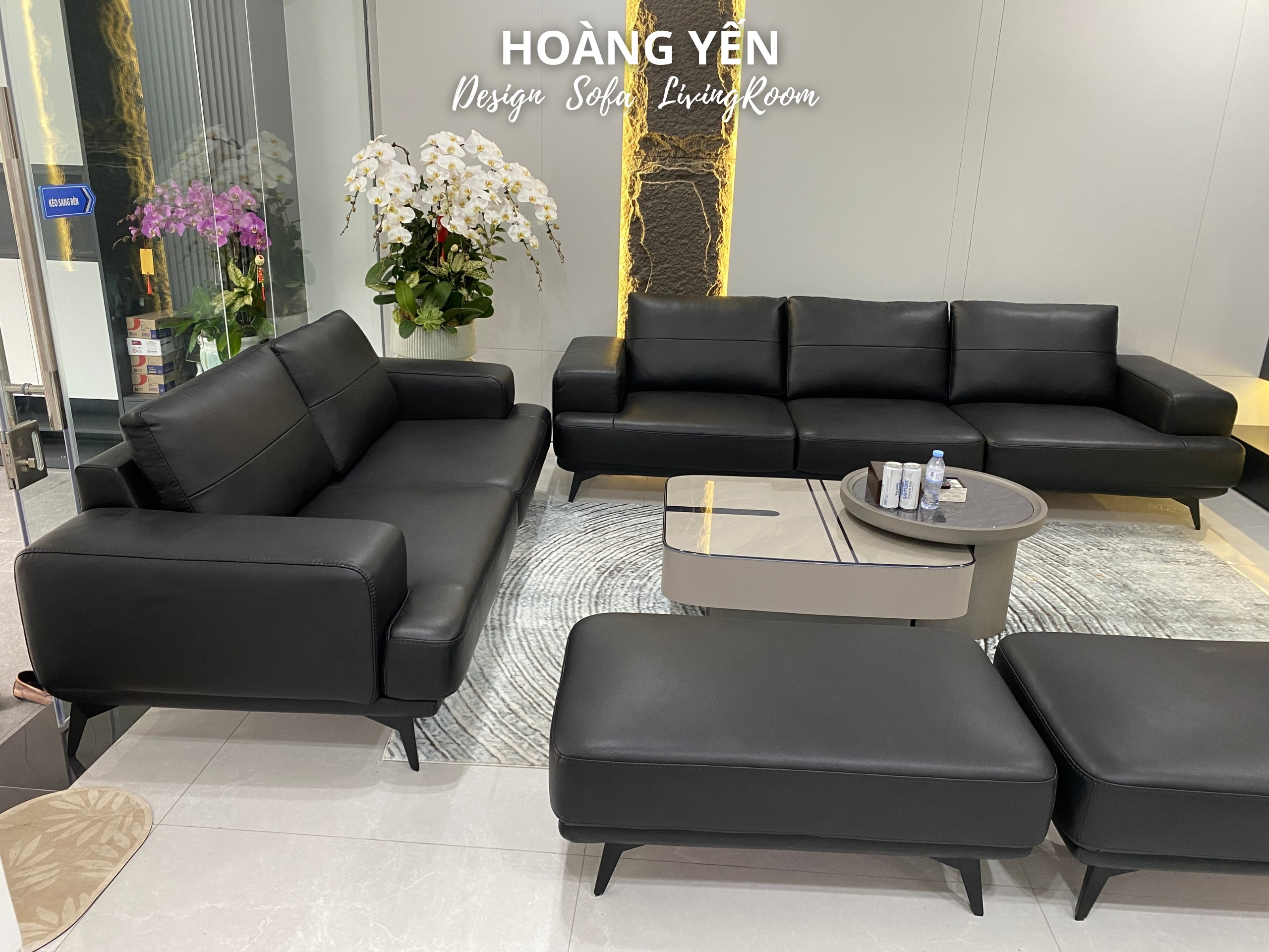 Sofa da phòng khách SHY419 màu ghi đen là điểm nhấn thị giác chính trong không gian.