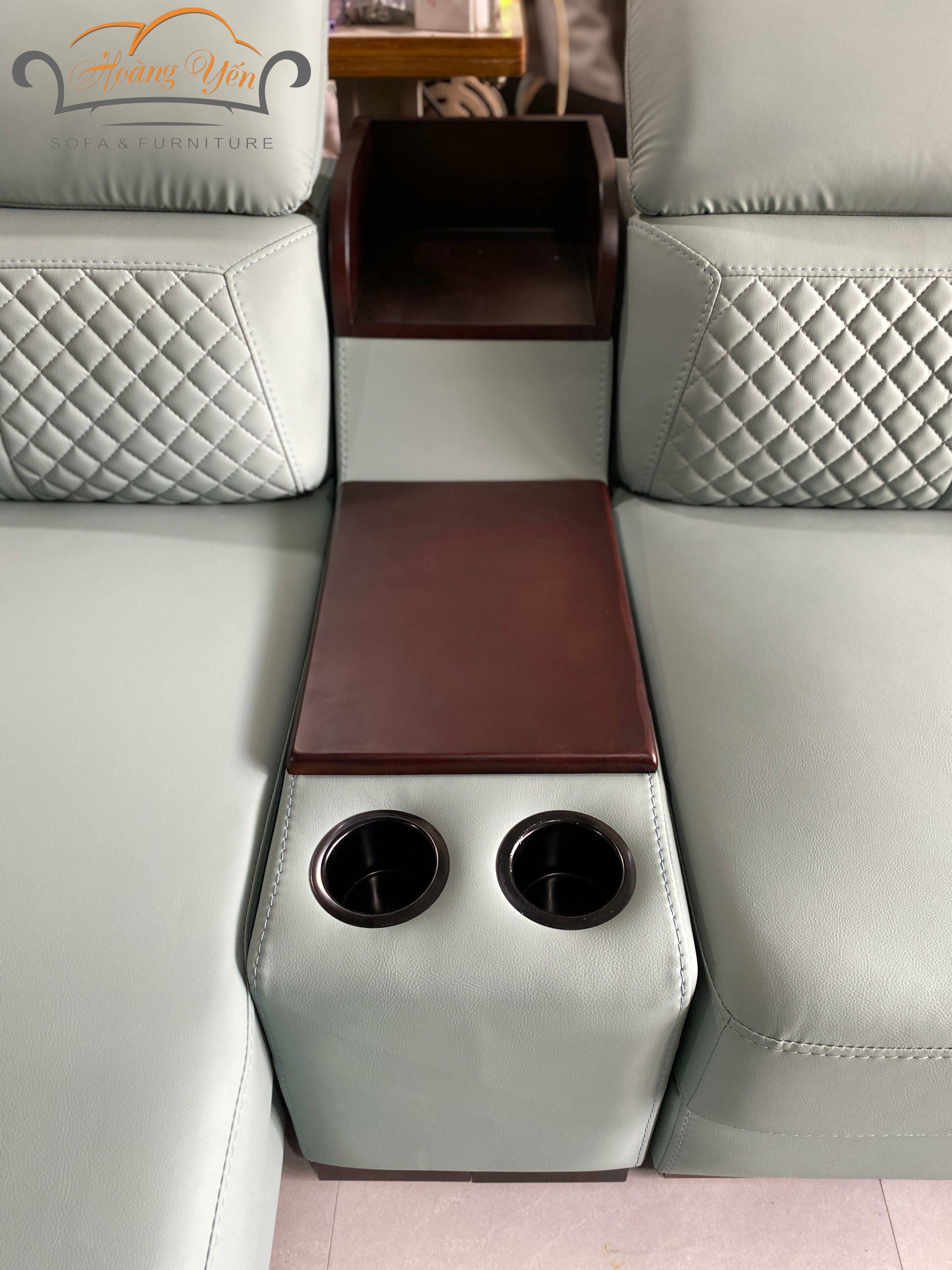 Tráp có ngăn để cốc nước, có phần để trang trí lọ hoa rất tiện lợi, lại có thêm phần gỗ ở đuôi góc L tạo sự nhấn nhá cho bộ ghế.