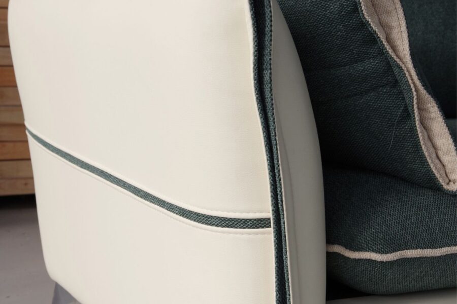 Màu xanh của lớp đệm tạo sự trầm tĩnh, sang trọng, đồng thời làm nổi bật lớp khung ghế màu kem phía dưới.