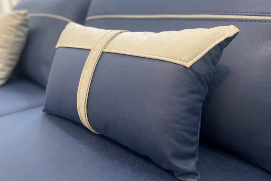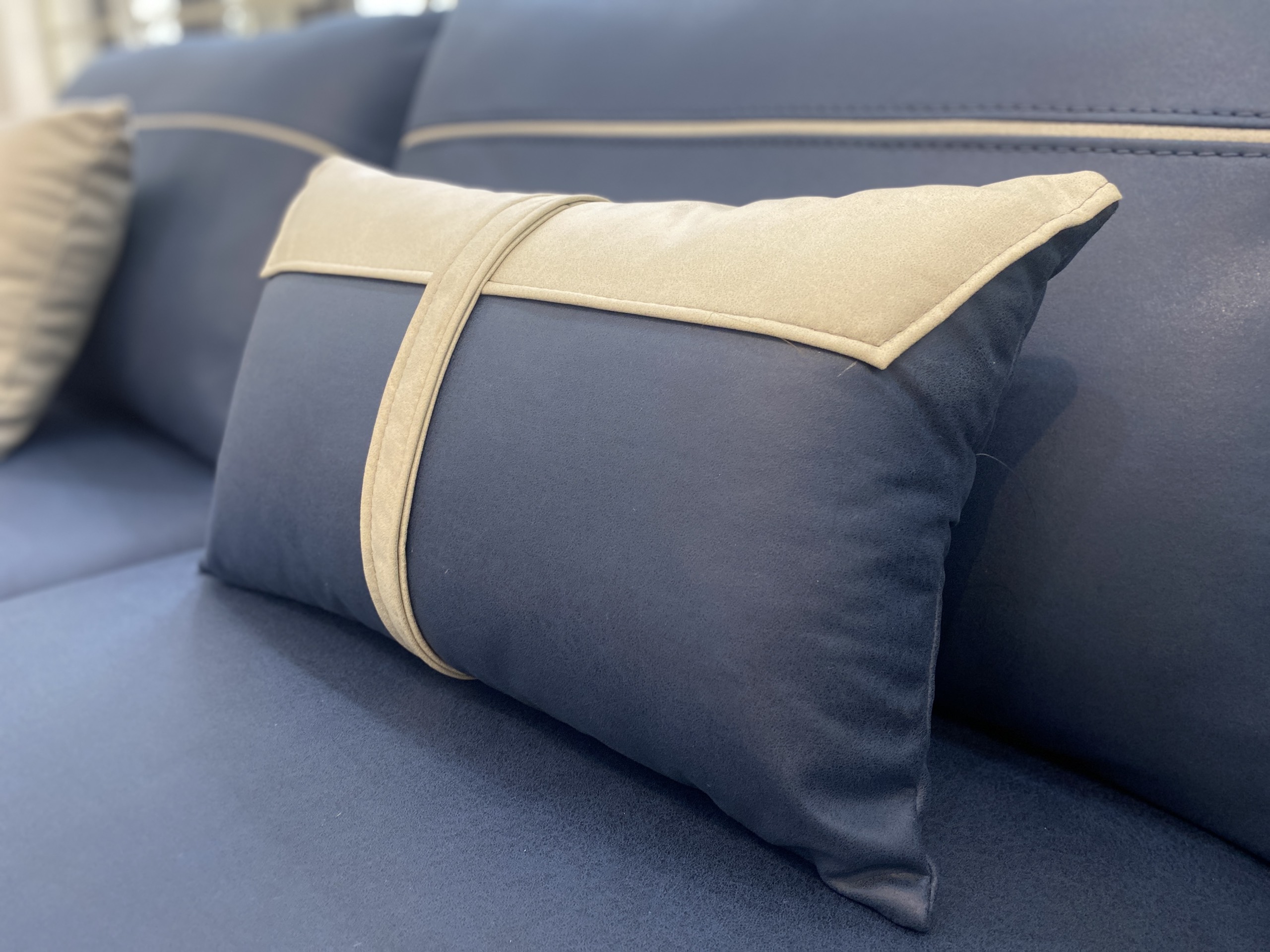 Màu xanh dương đậm của gối tựa tạo sự sang trọng, nổi bật, đồng thời giúp cân bằng với màu trắng be ở khung lưng.