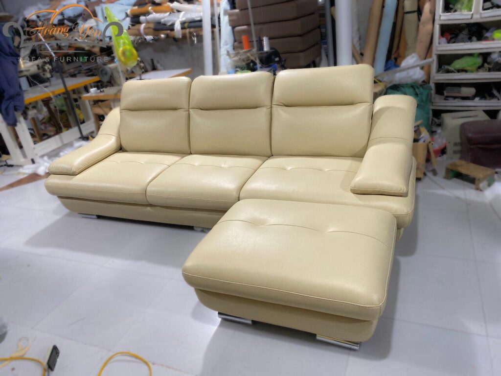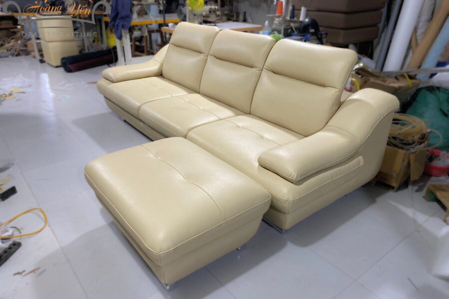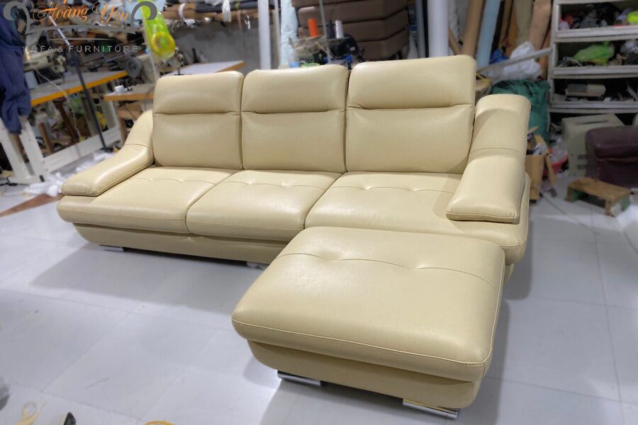 Ghế văng góc L dùng da HC 2 lớp có bề mặt vân sần nhẹ và mềm mại, chịu được mài mòn.