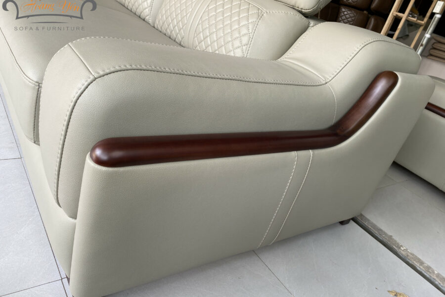 Sofa văng HY369 lai giữa nét hiện đại của da với nhiều tiện ích và sự cổ kính từ họa tiết gỗ cùng những đường may nghệ thuật.