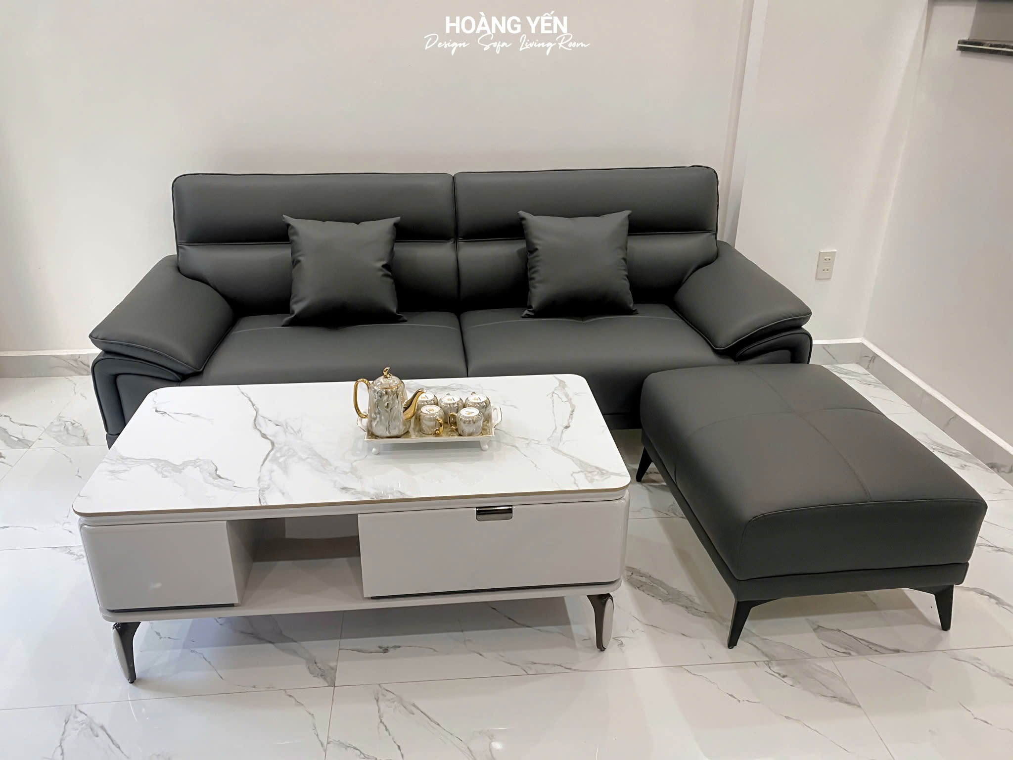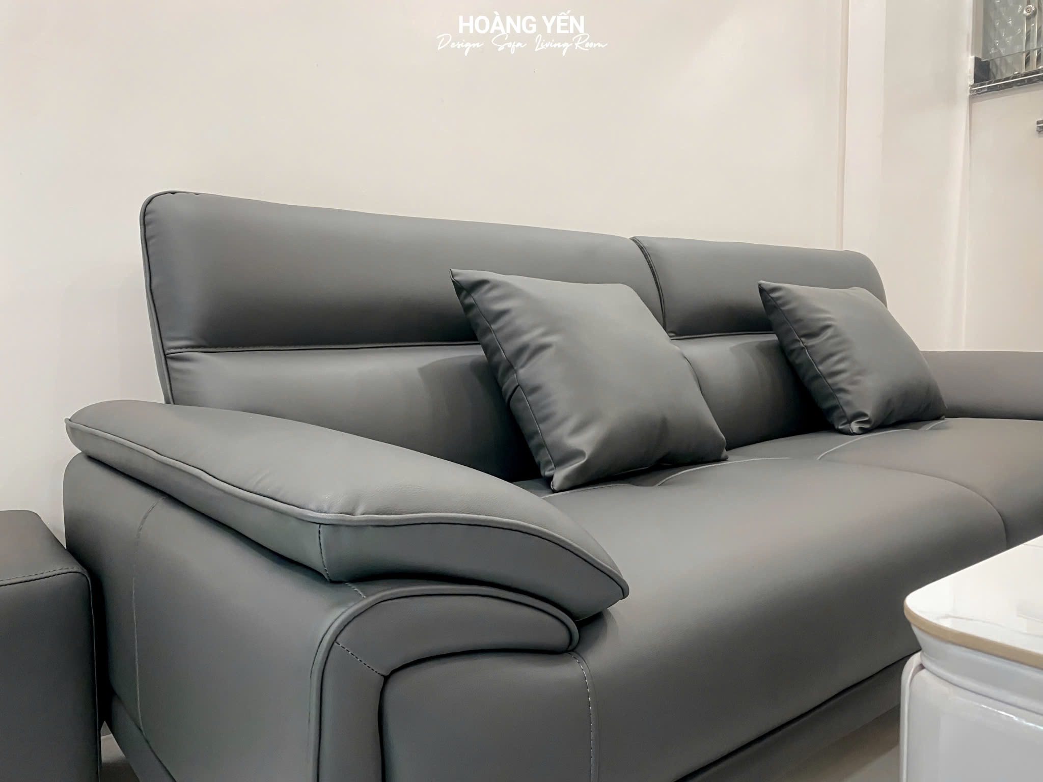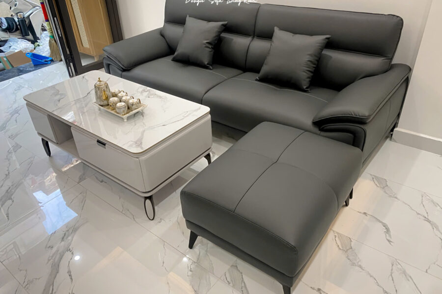 Bộ sofa HY405 ghi đậm với văng dài văng dài 2.3m và đôn to 60*90, được làm bằng dòng da LC cao cấp 2 lớp có giá là 13.000.000.