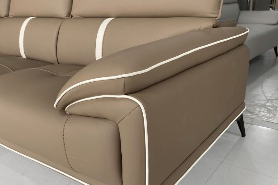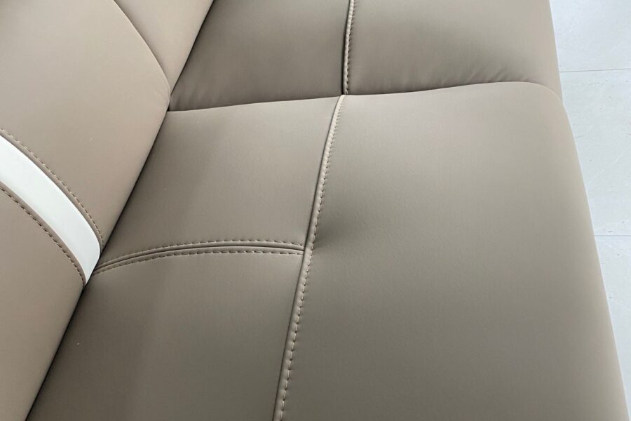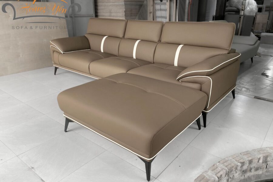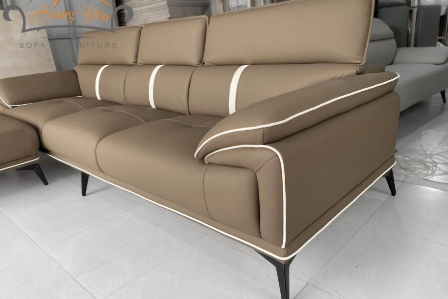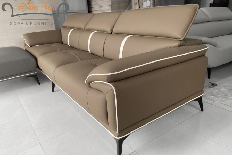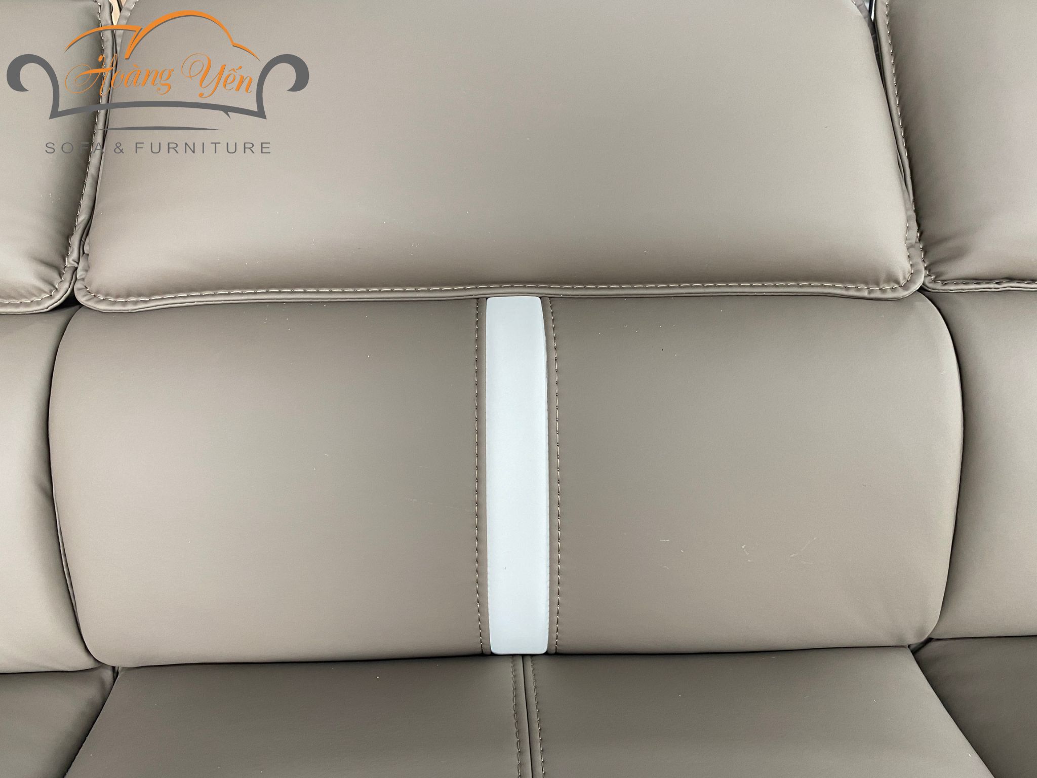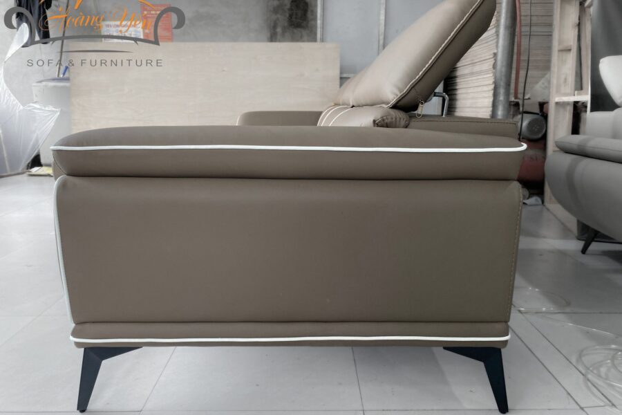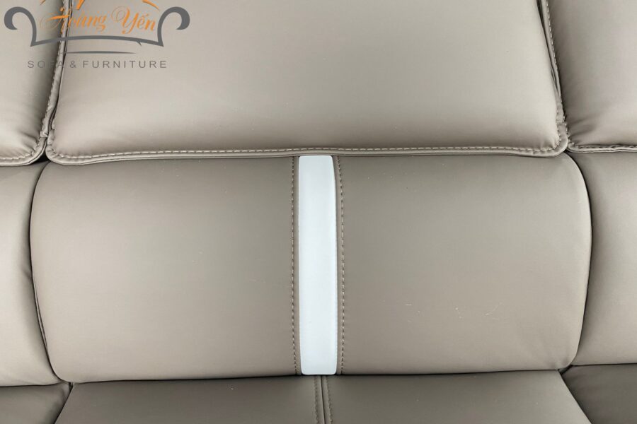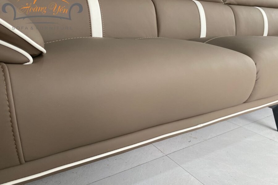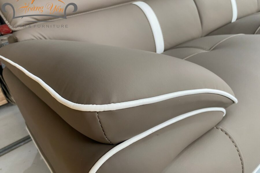 Bộ sofa da sử dụng tông màu nâu xám chủ đạo, kết hợp với đường viền màu trắng kem.