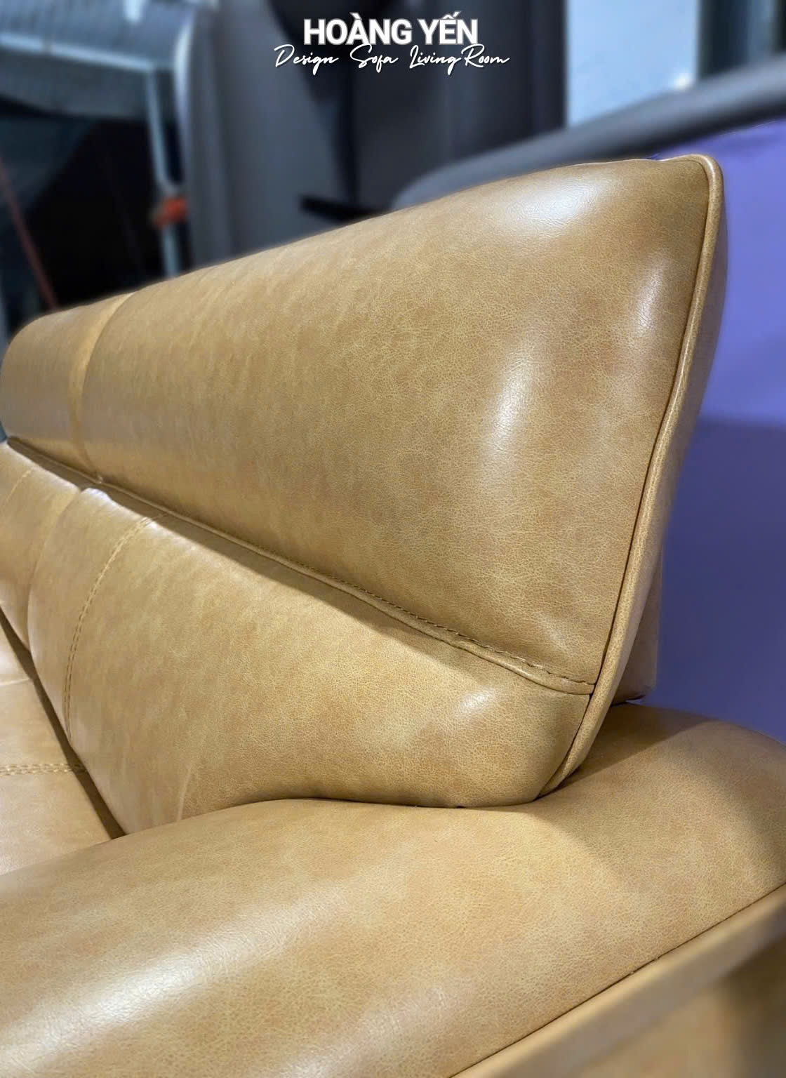 Sofa trong hình có màu vàng bò với vân da loang nhẹ, tạo hiệu ứng màu sắc tự nhiên như được nhuộm tay.
