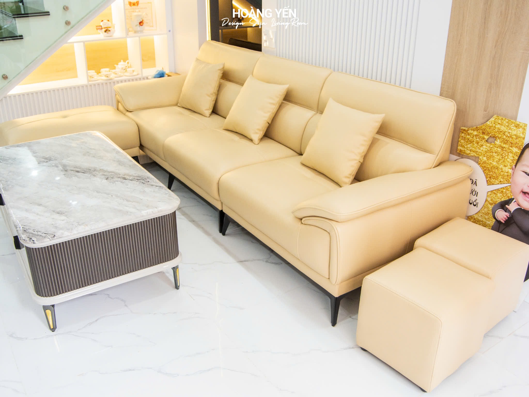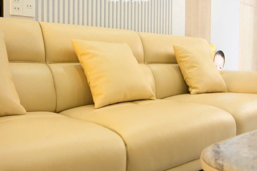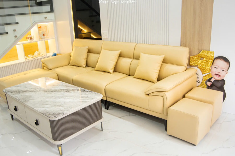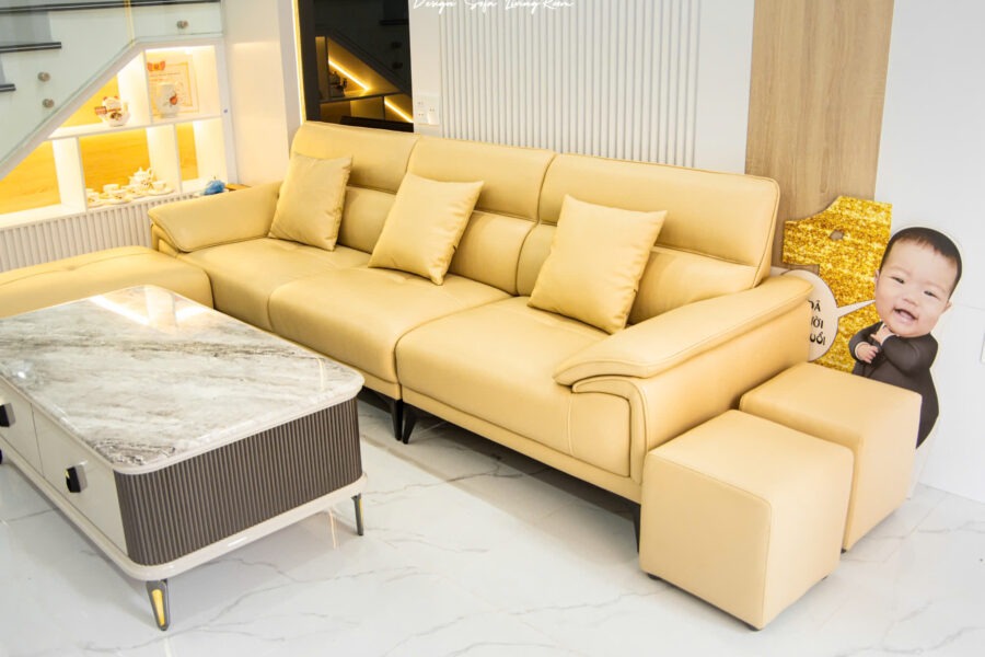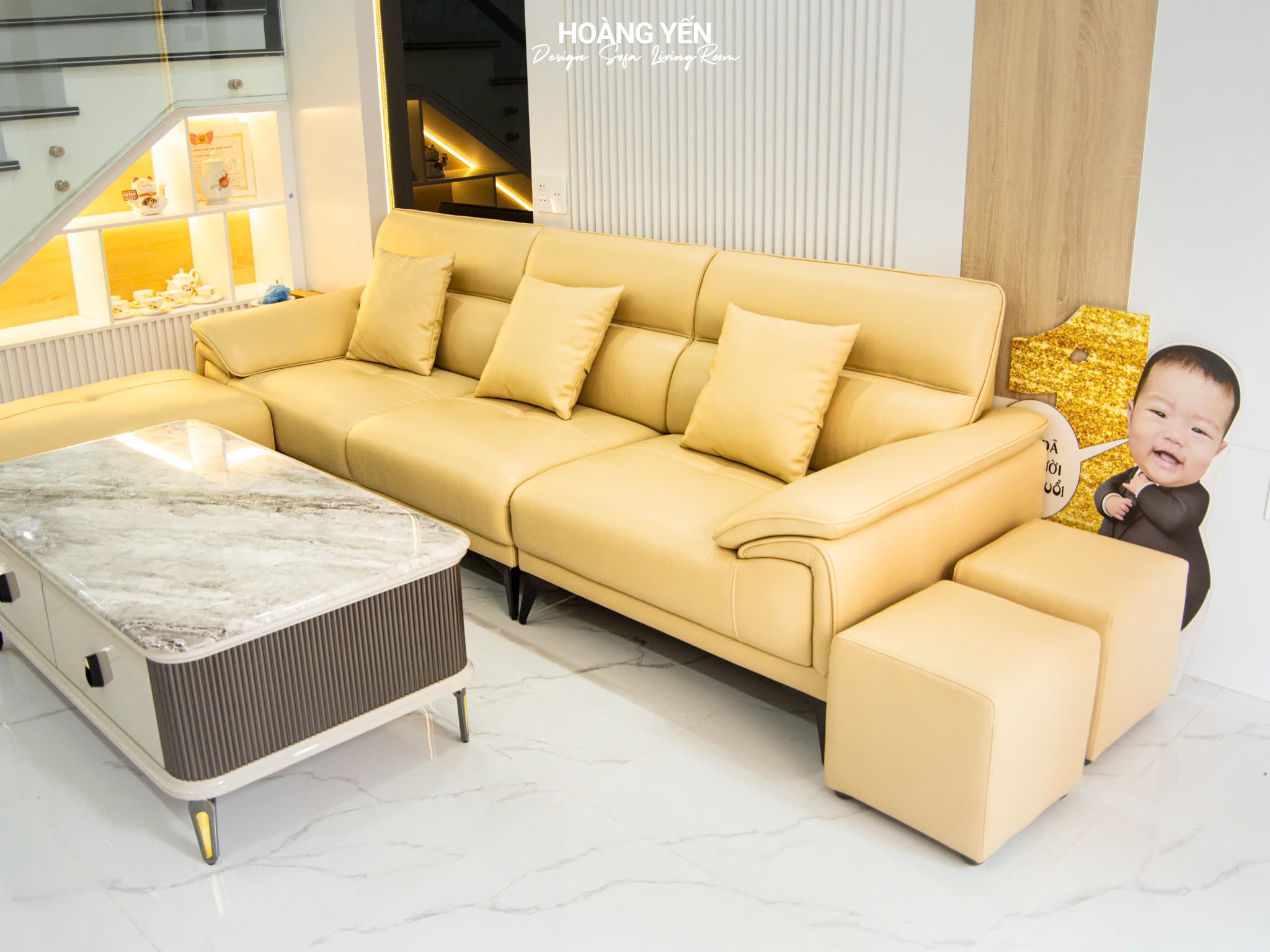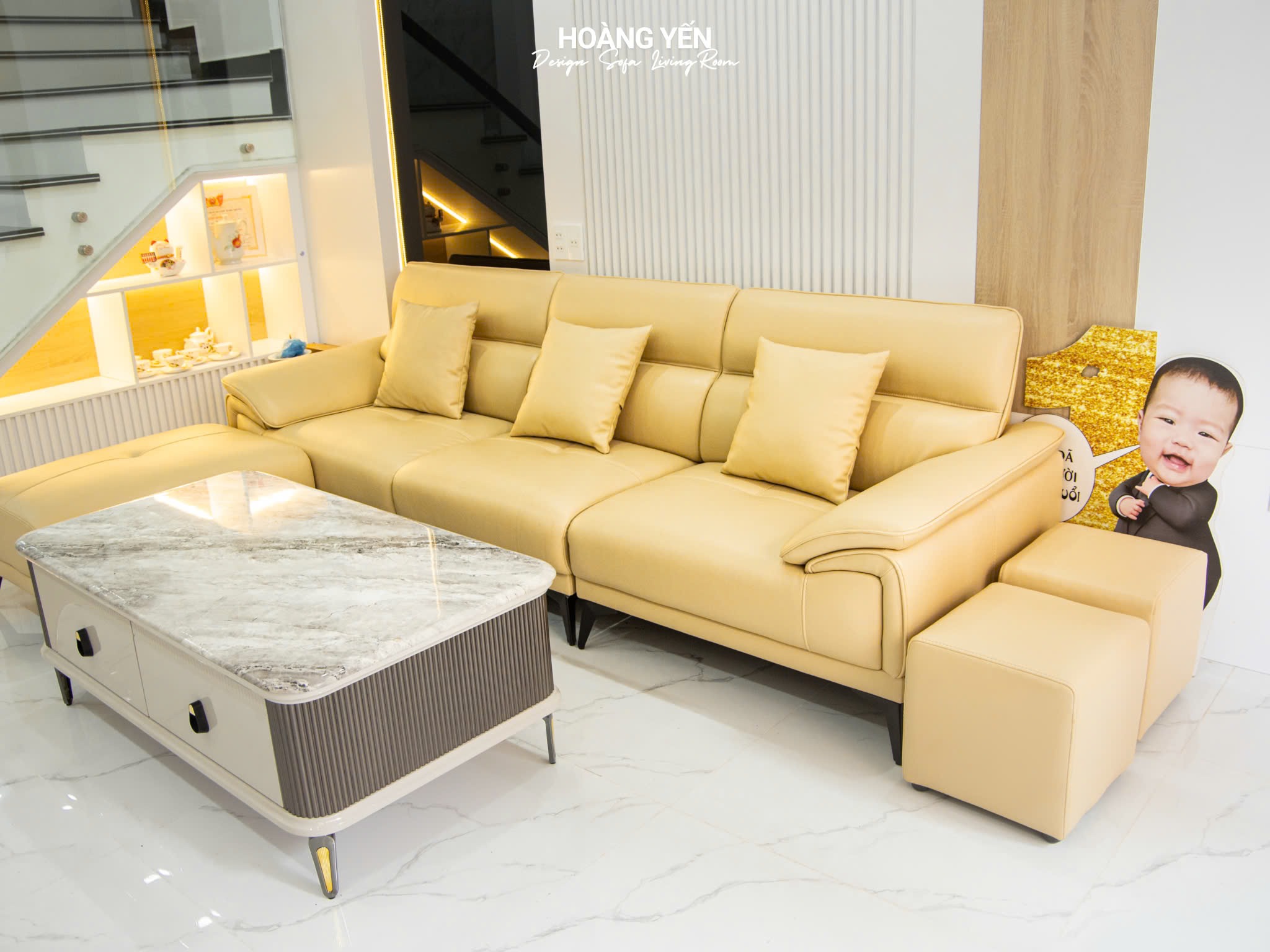 Sofa màu vàng sáng giúp làm sáng tổng thể căn phòng, đặc biệt hiệu quả trong không gian nhỏ hoặc ít ánh sáng tự nhiên.