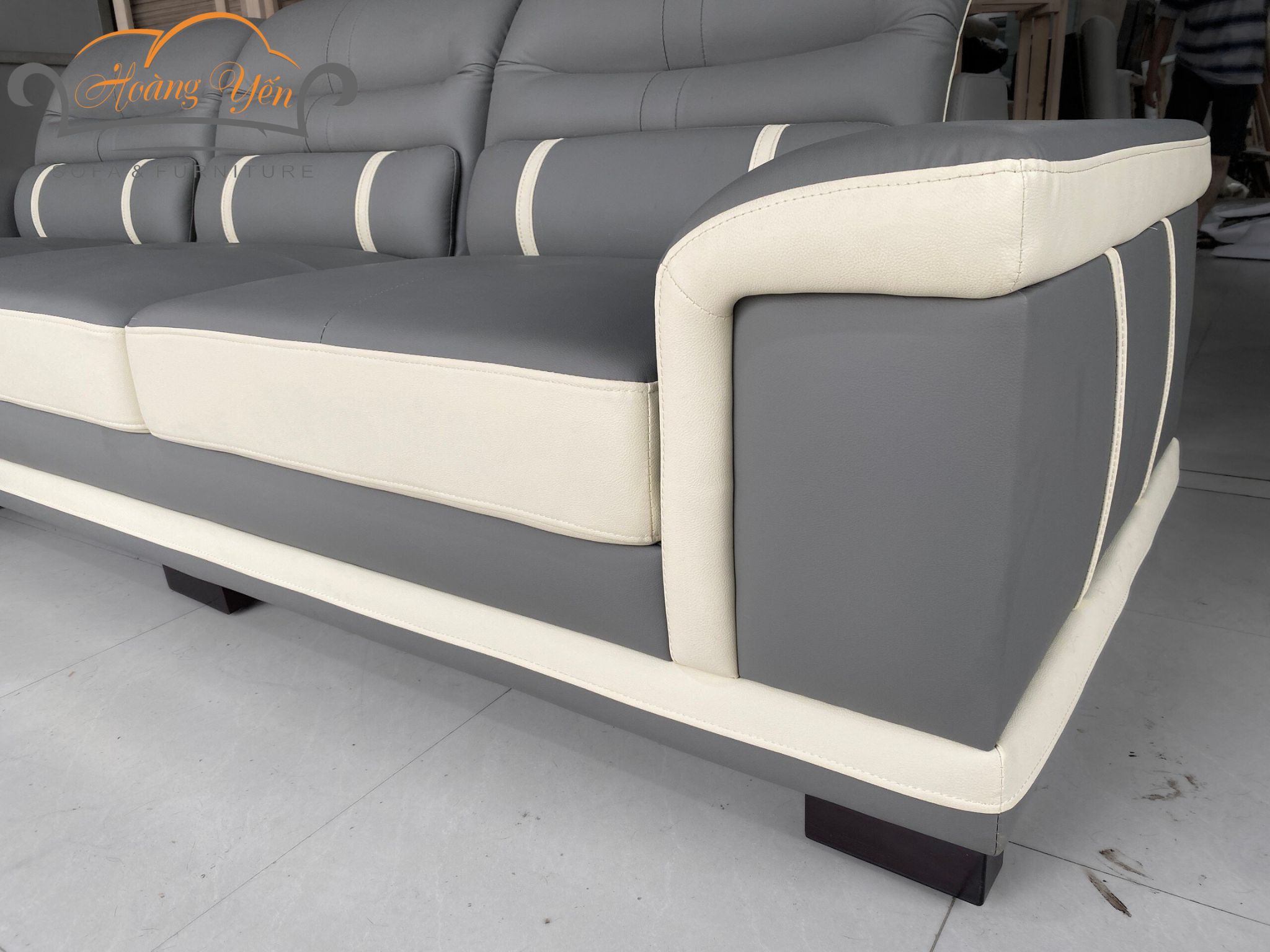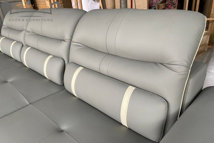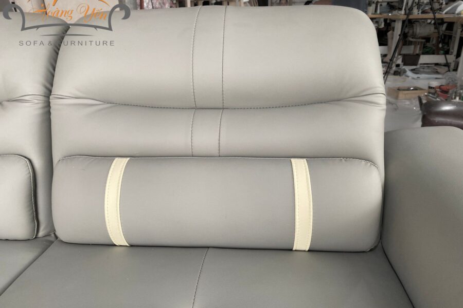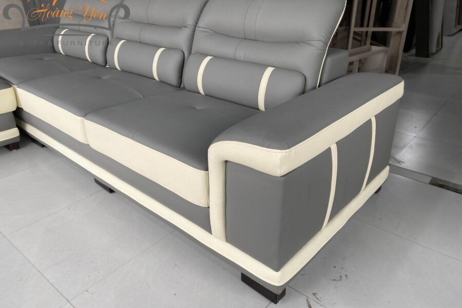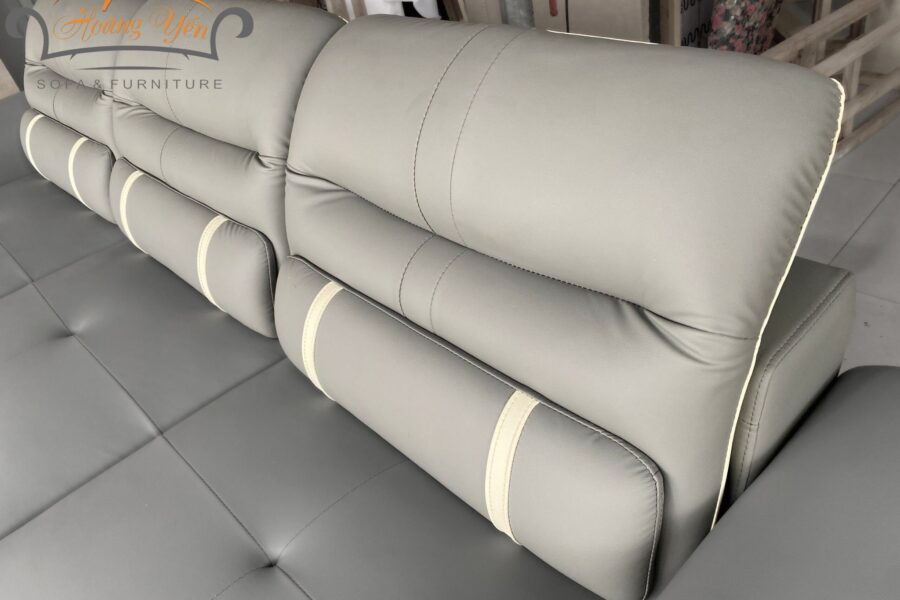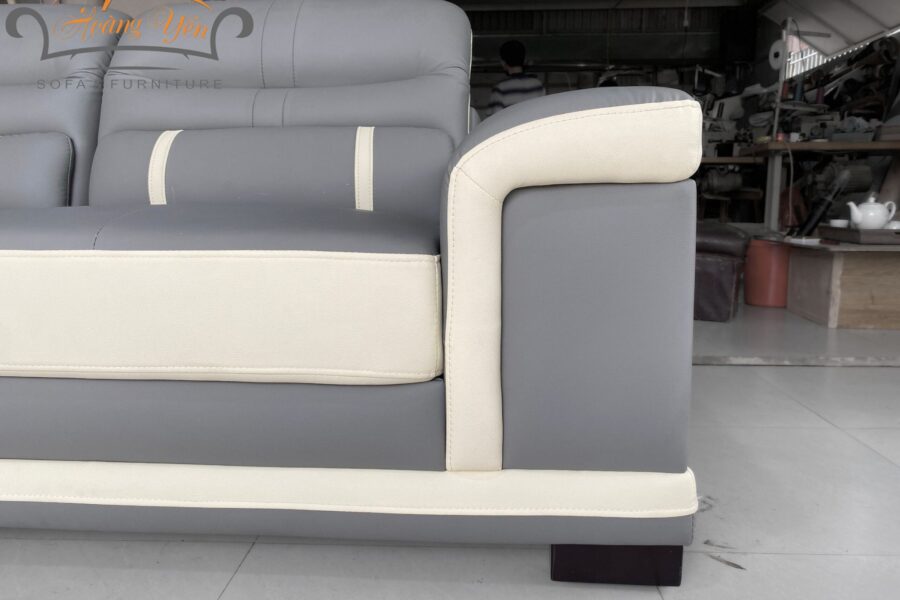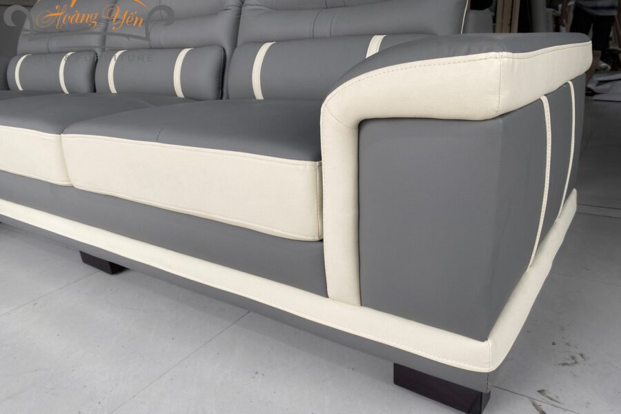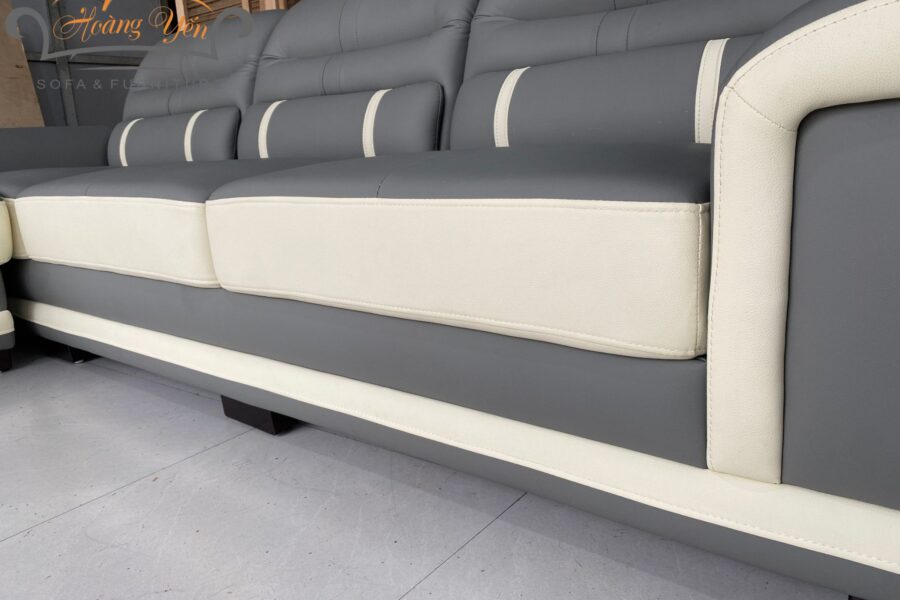 Bộ sofa da sử dụng hai tông màu chủ đạo là xám trung tính và viền chỉ trắng.