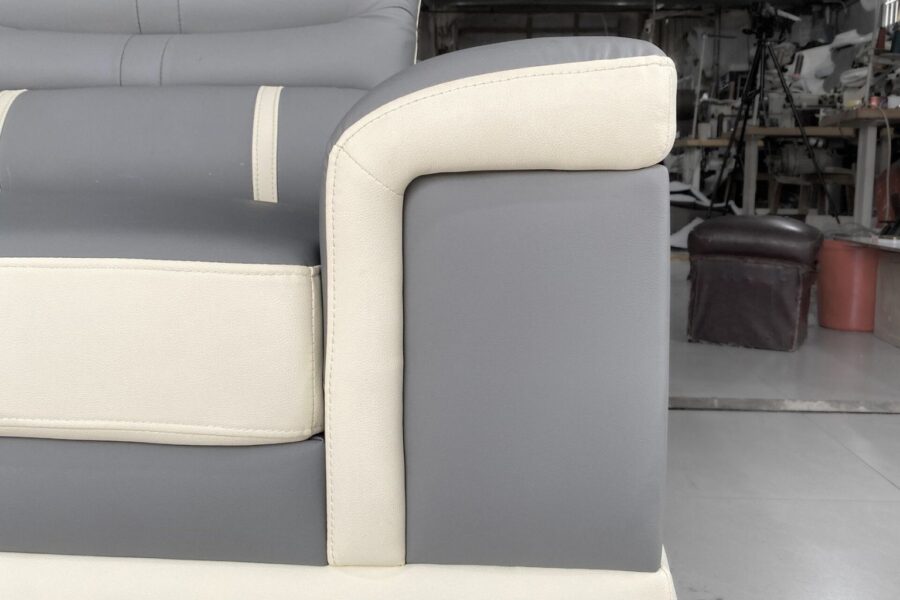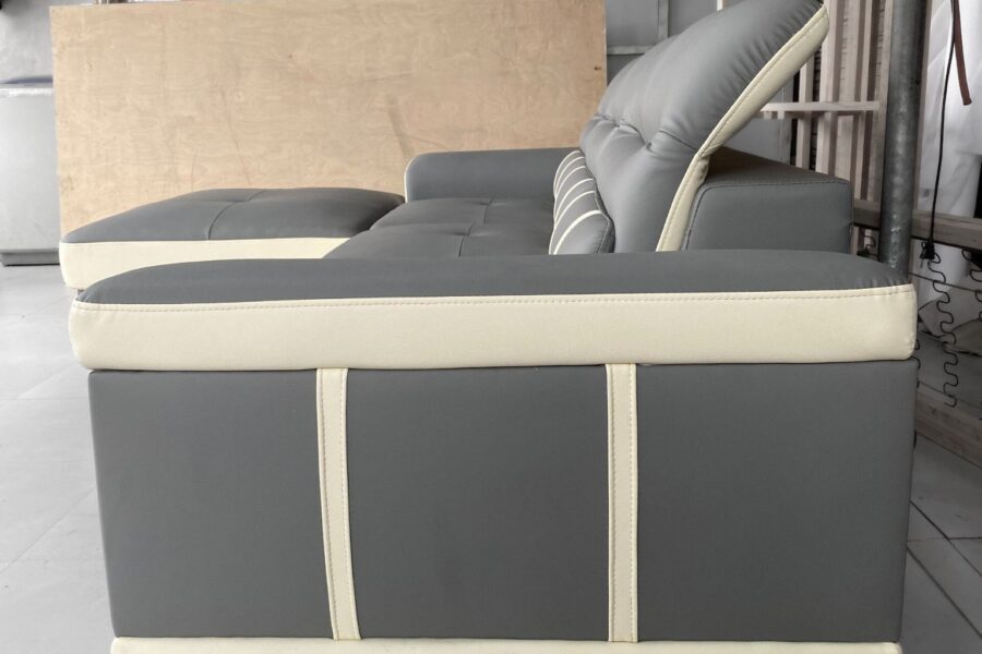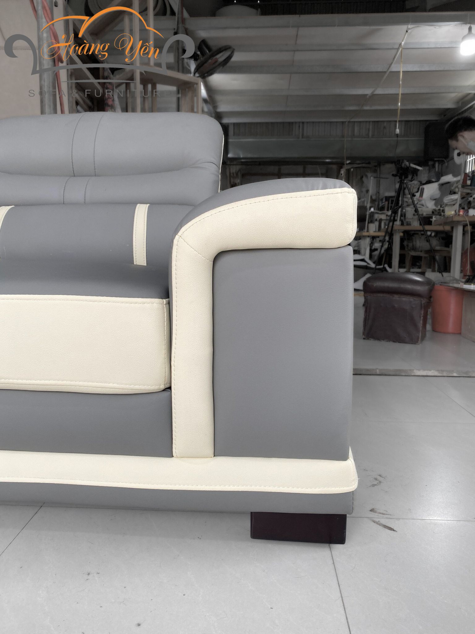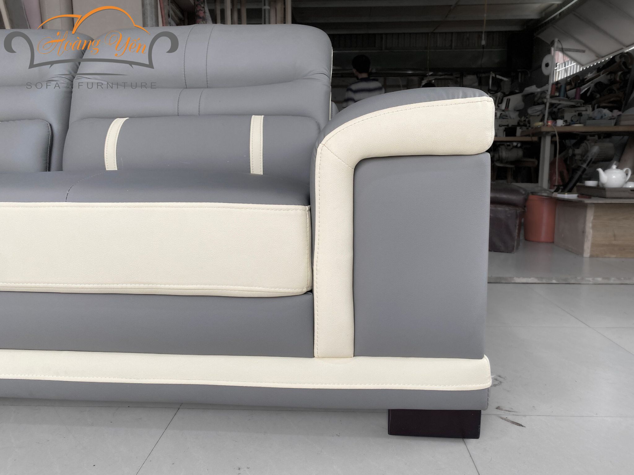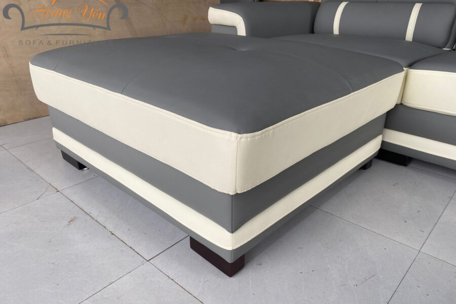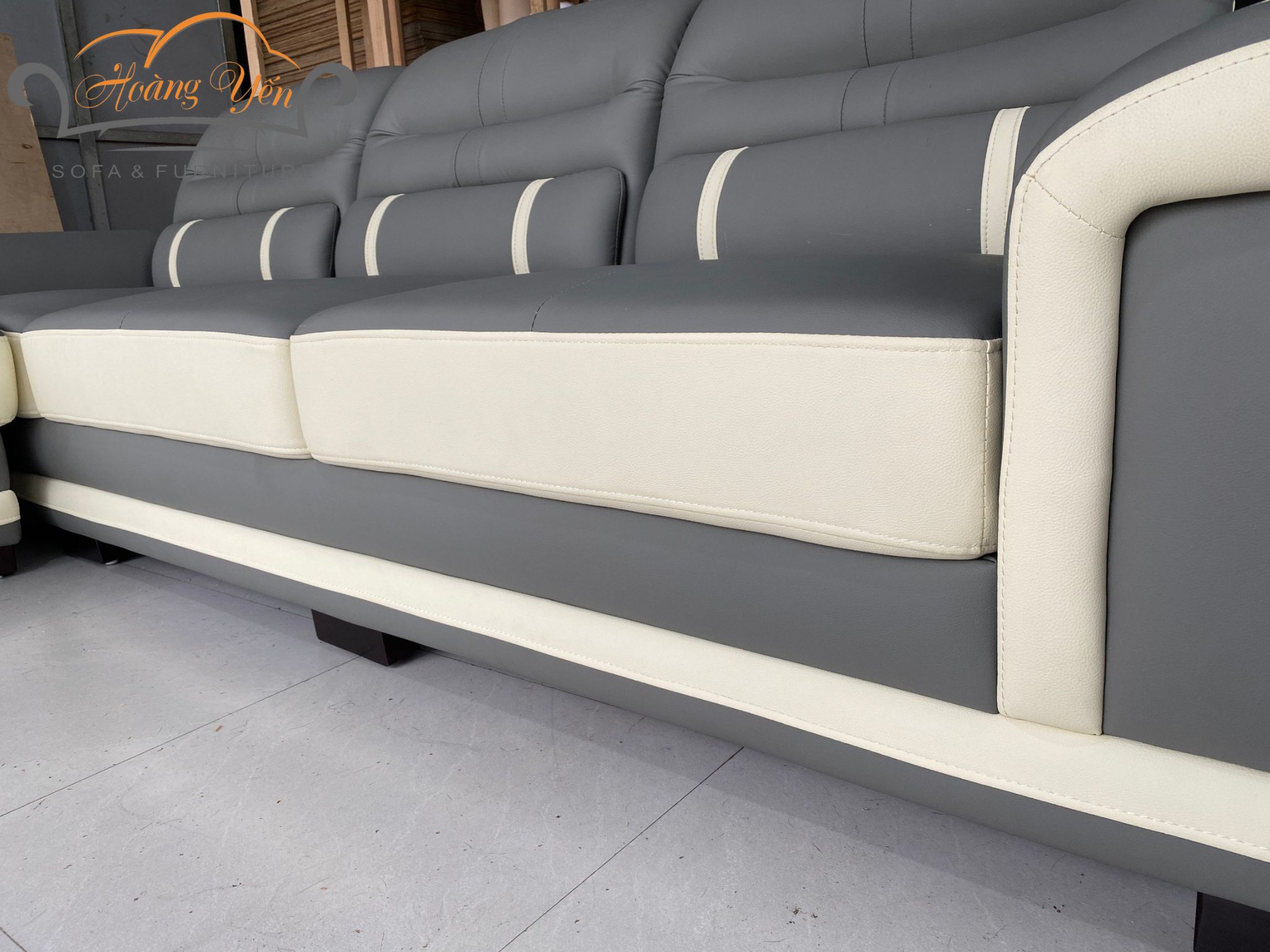 Bộ sofa da sử dụng hai tông màu chủ đạo là xám trung tính và viền chỉ trắng.