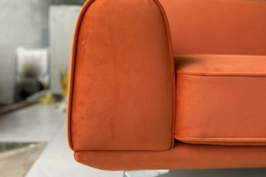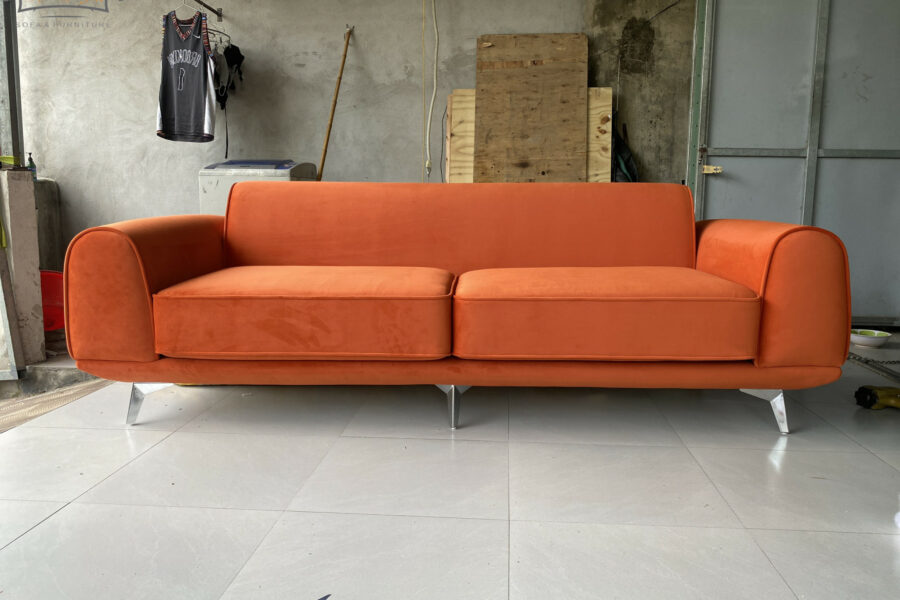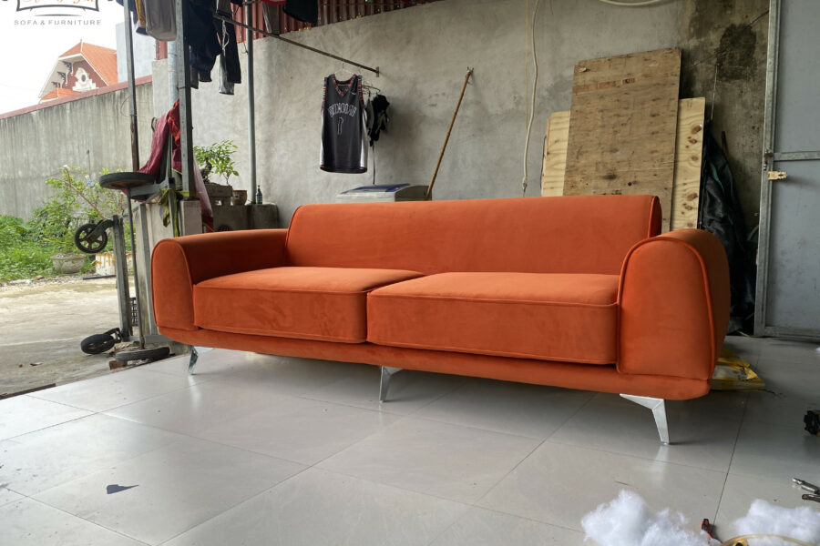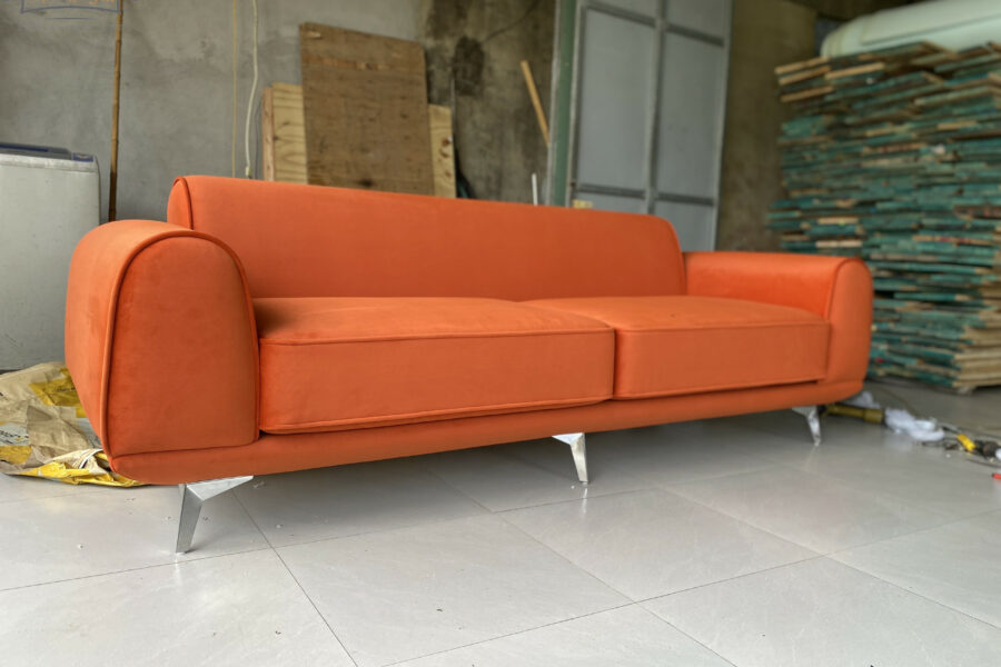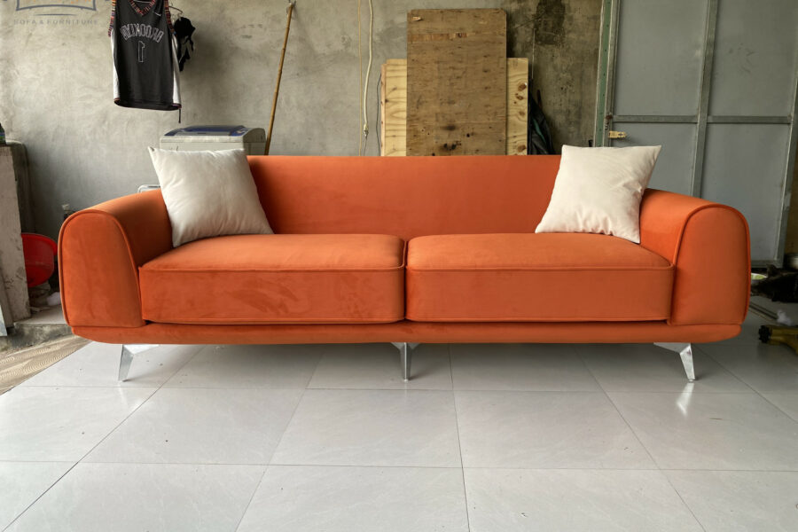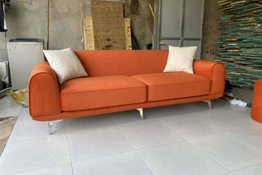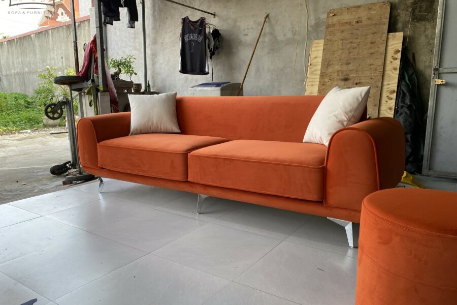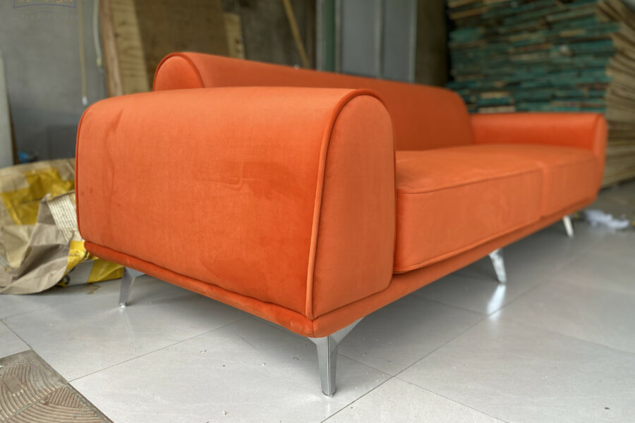Màu cam cháy của sofa nằm giữa cam đất và đỏ gạch, có độ trầm nhẹ giúp giảm bớt độ chói, khiến tổng thể trở nên sang trọng và tinh tế.