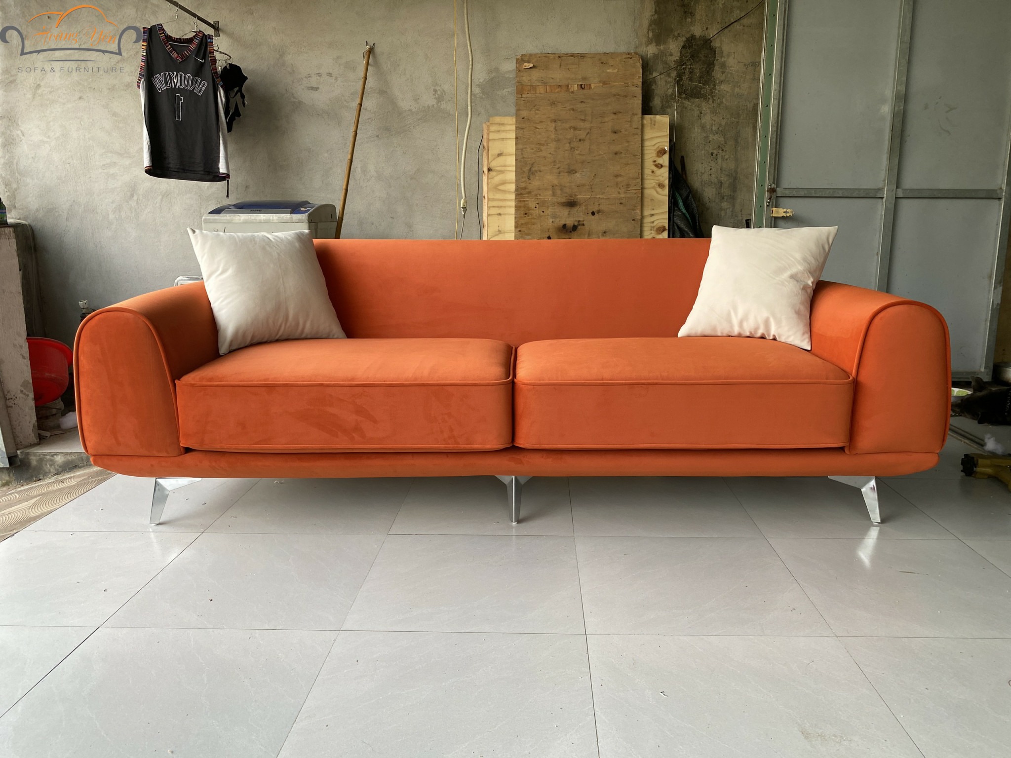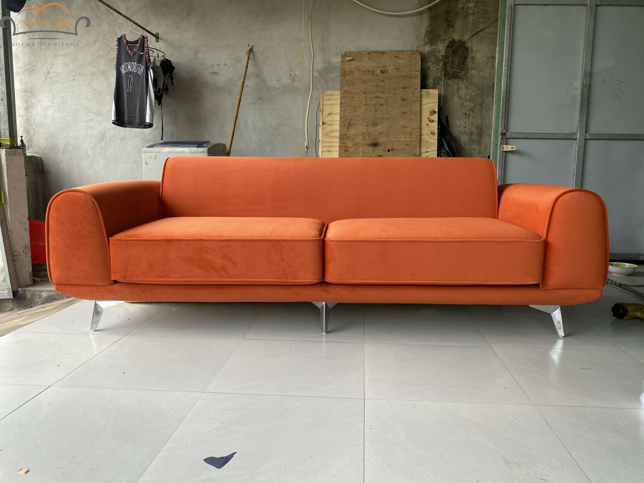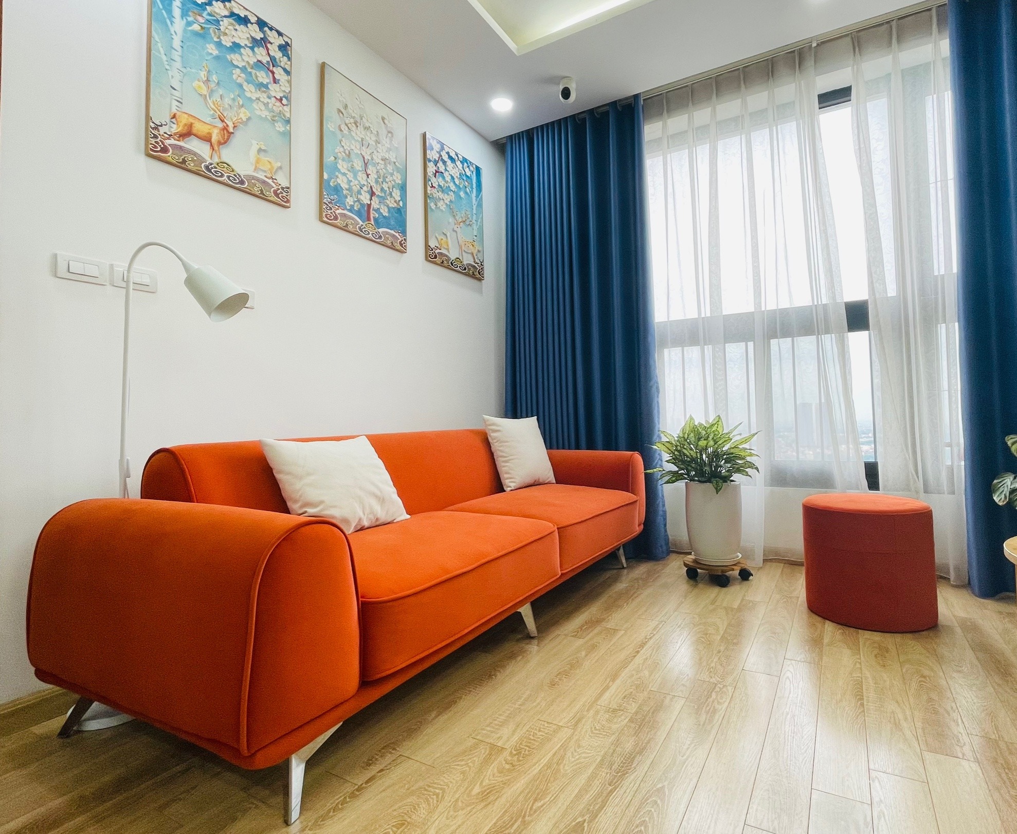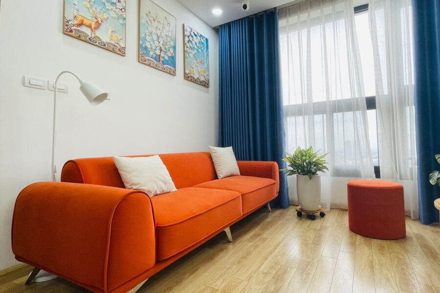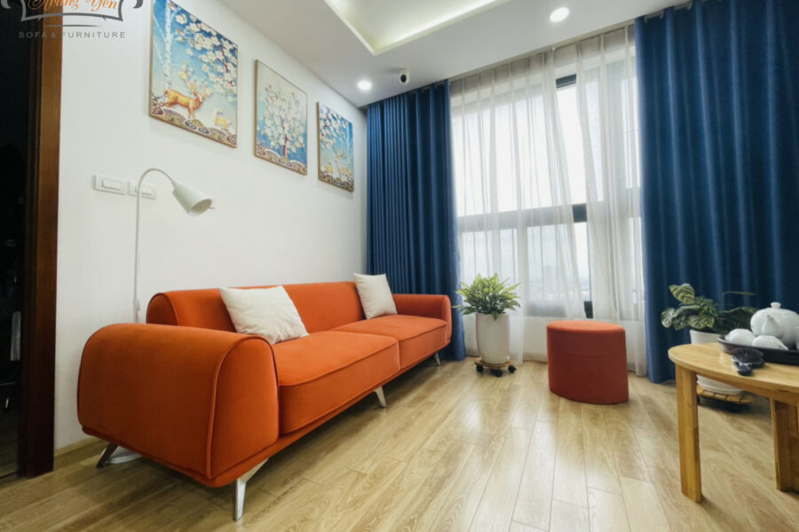 Sofa mang màu cam cháy rực rỡ nhưng vẫn ấm áp, tạo cảm giác vừa hiện đại vừa gần gũi.