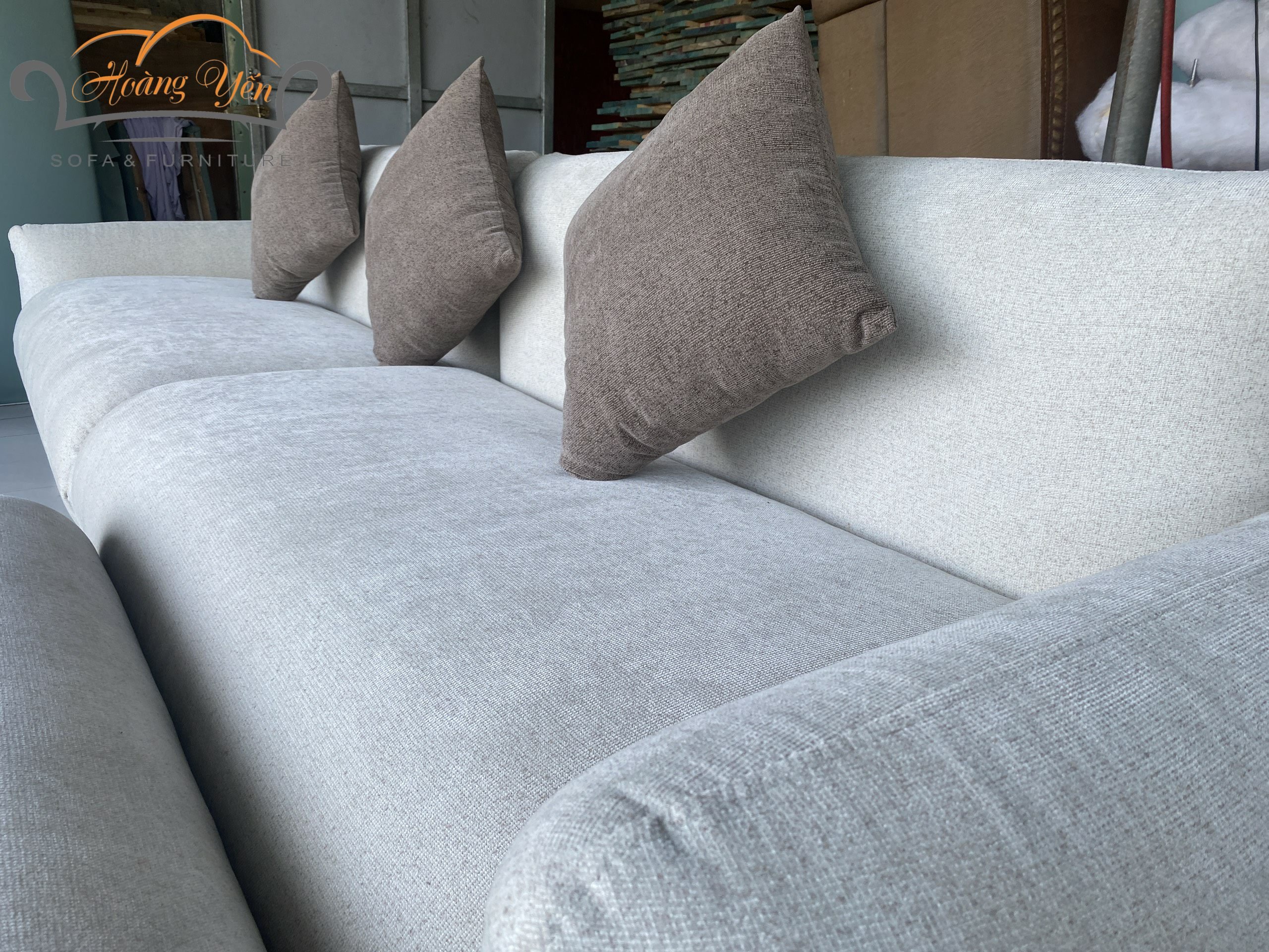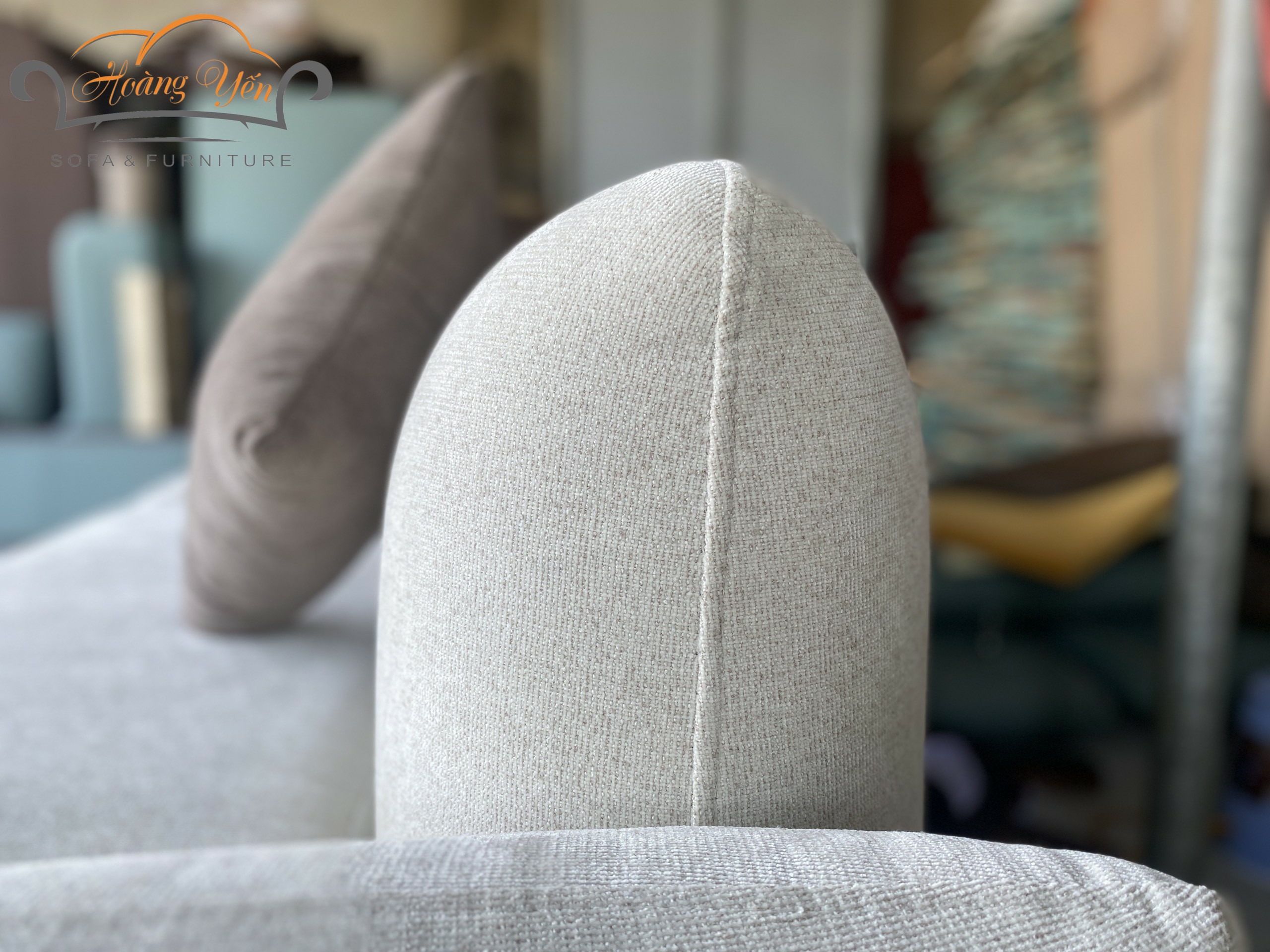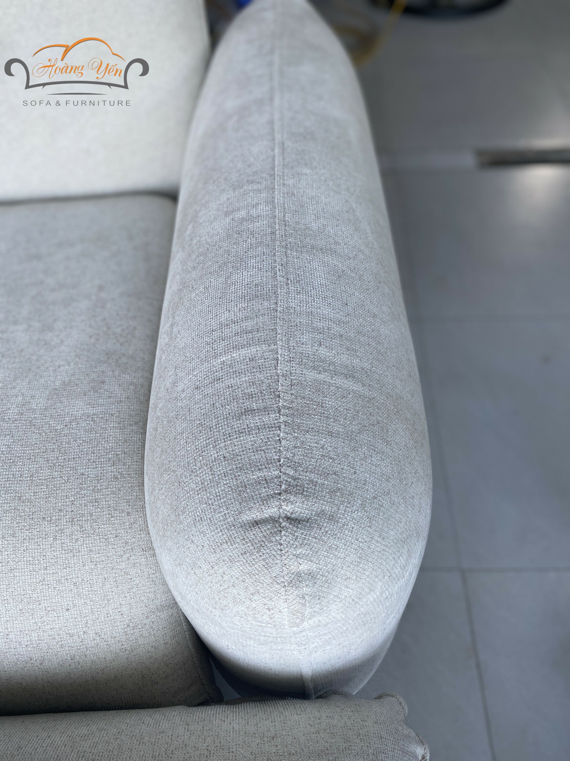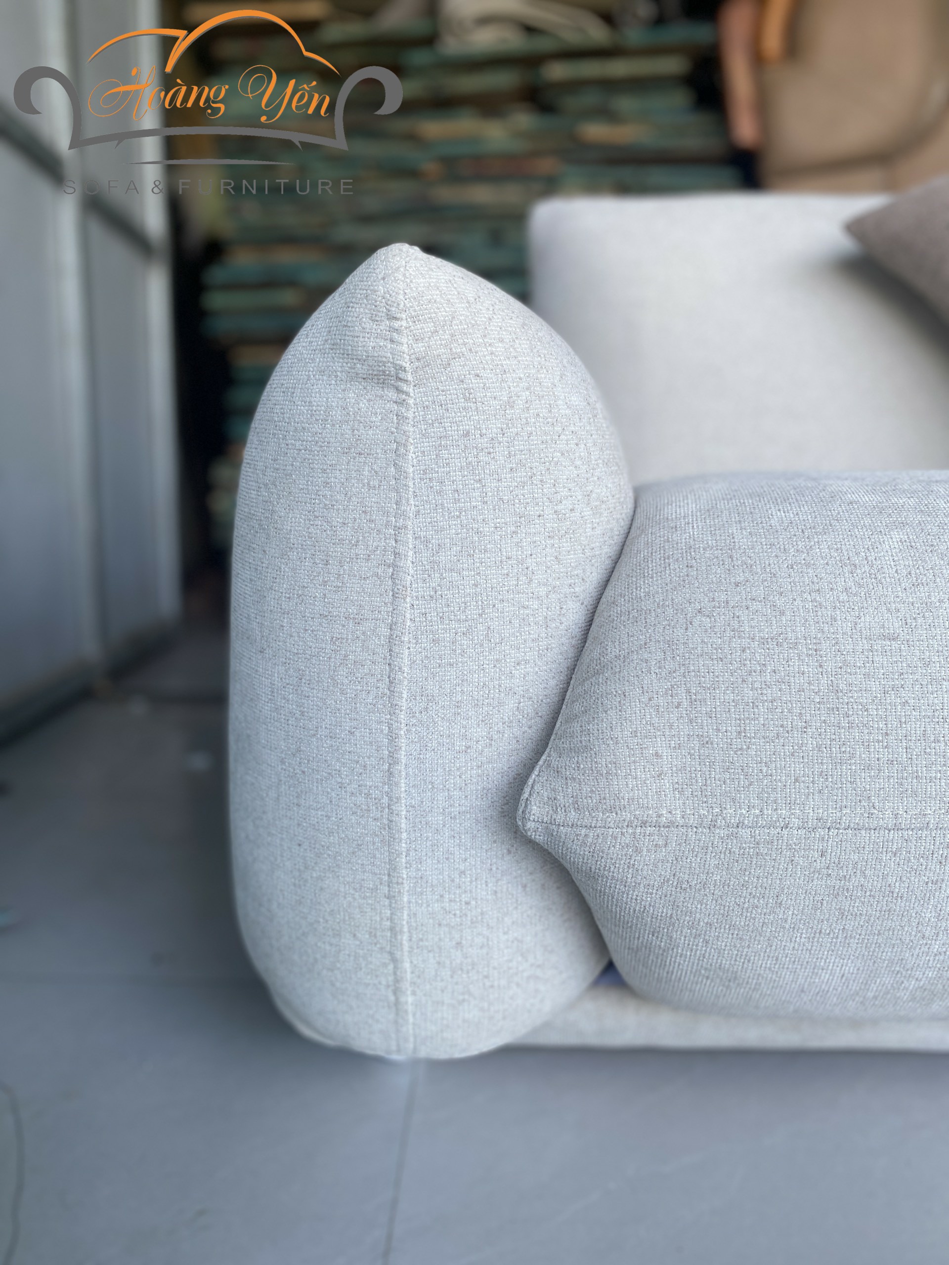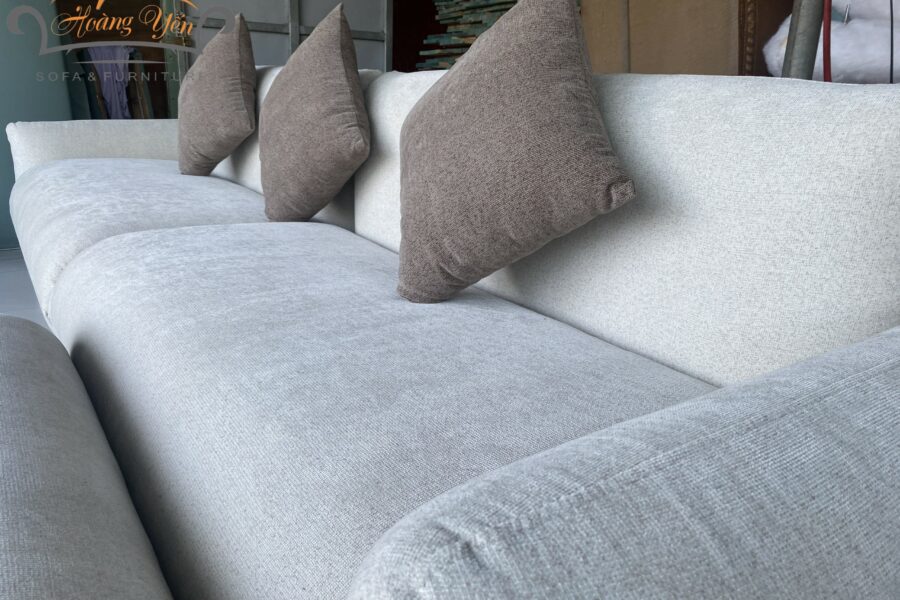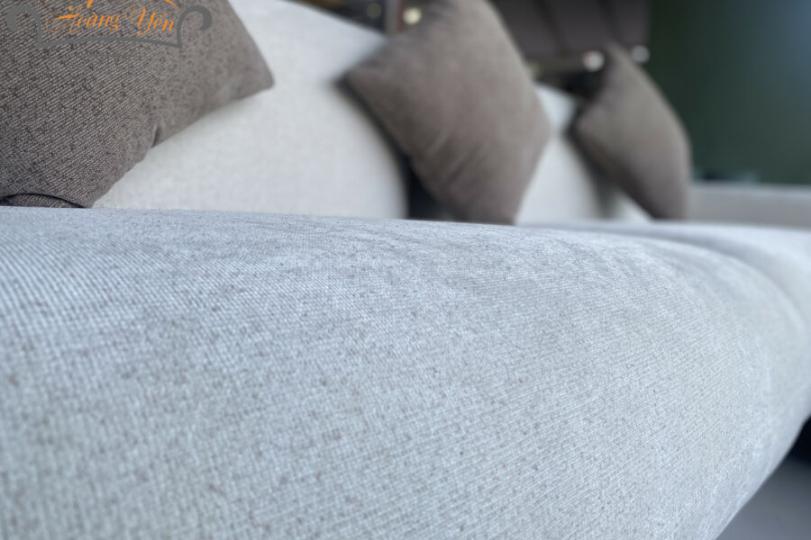 Sofa văng nỉ SHY386 màu sắc tinh khôi, trông gọn gàng và tinh tế, kết hợp gối ôm màu ghi tối càng làm sofa thêm nổi bật.