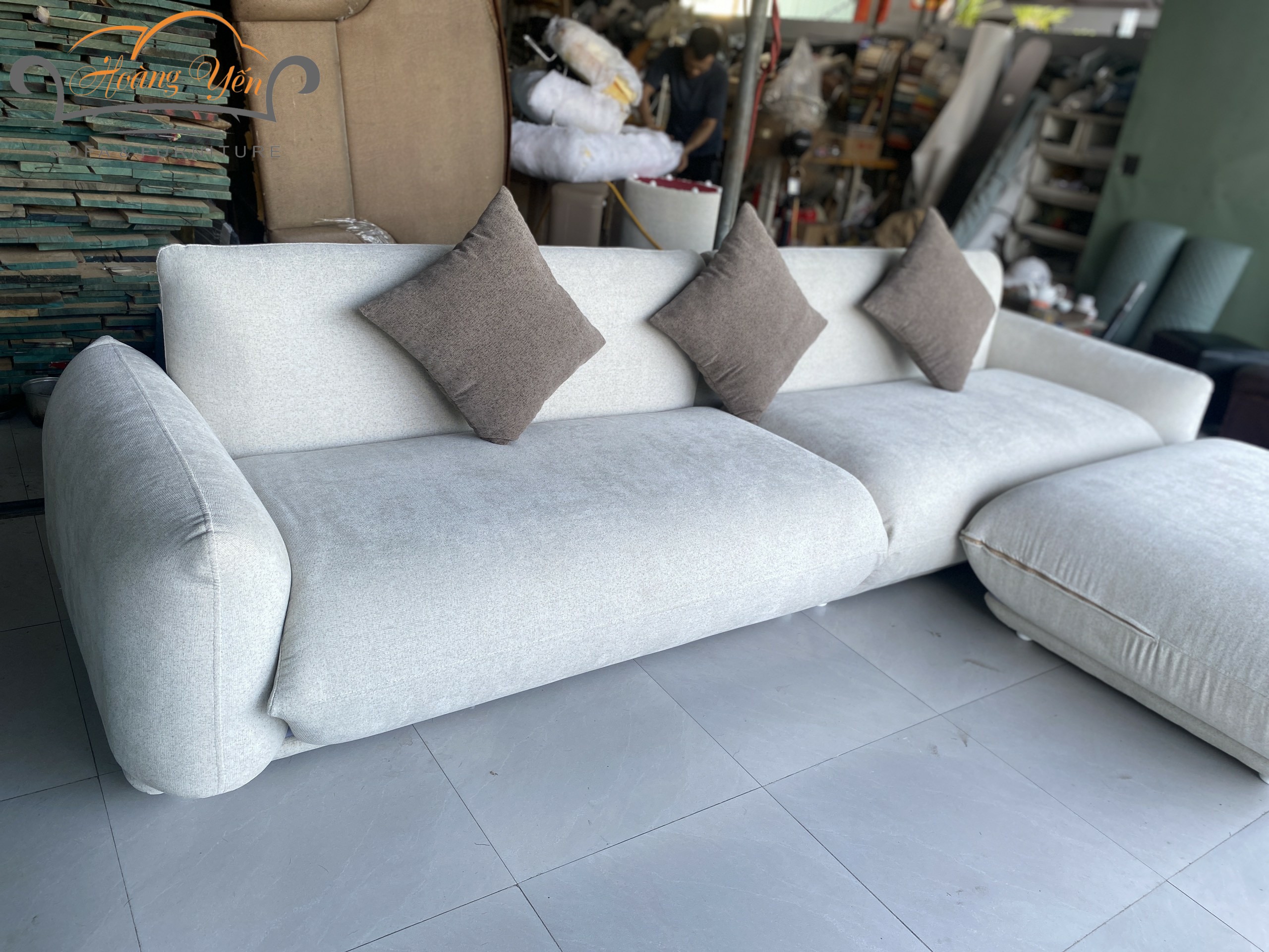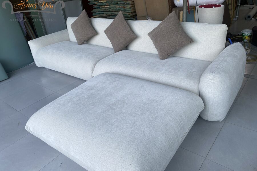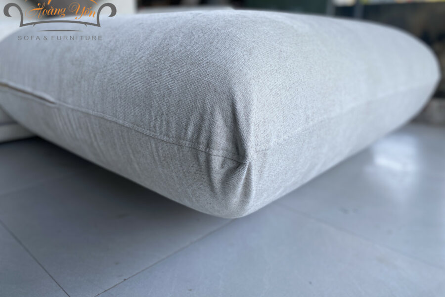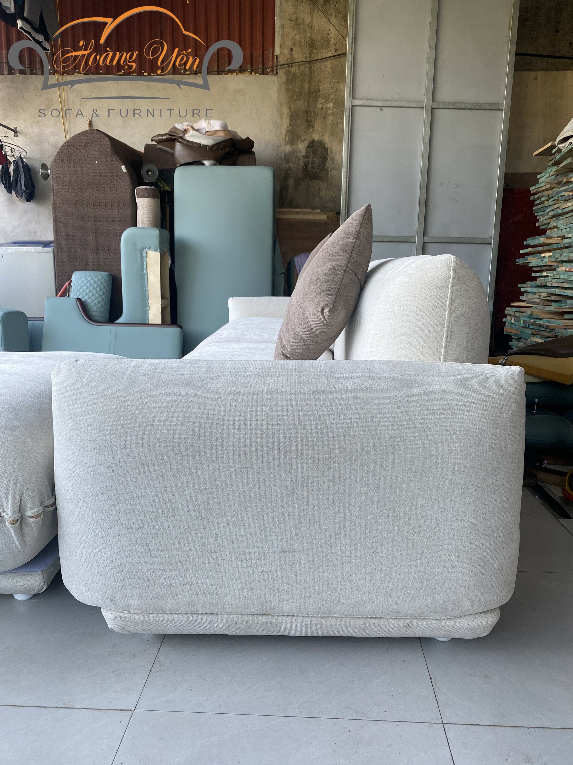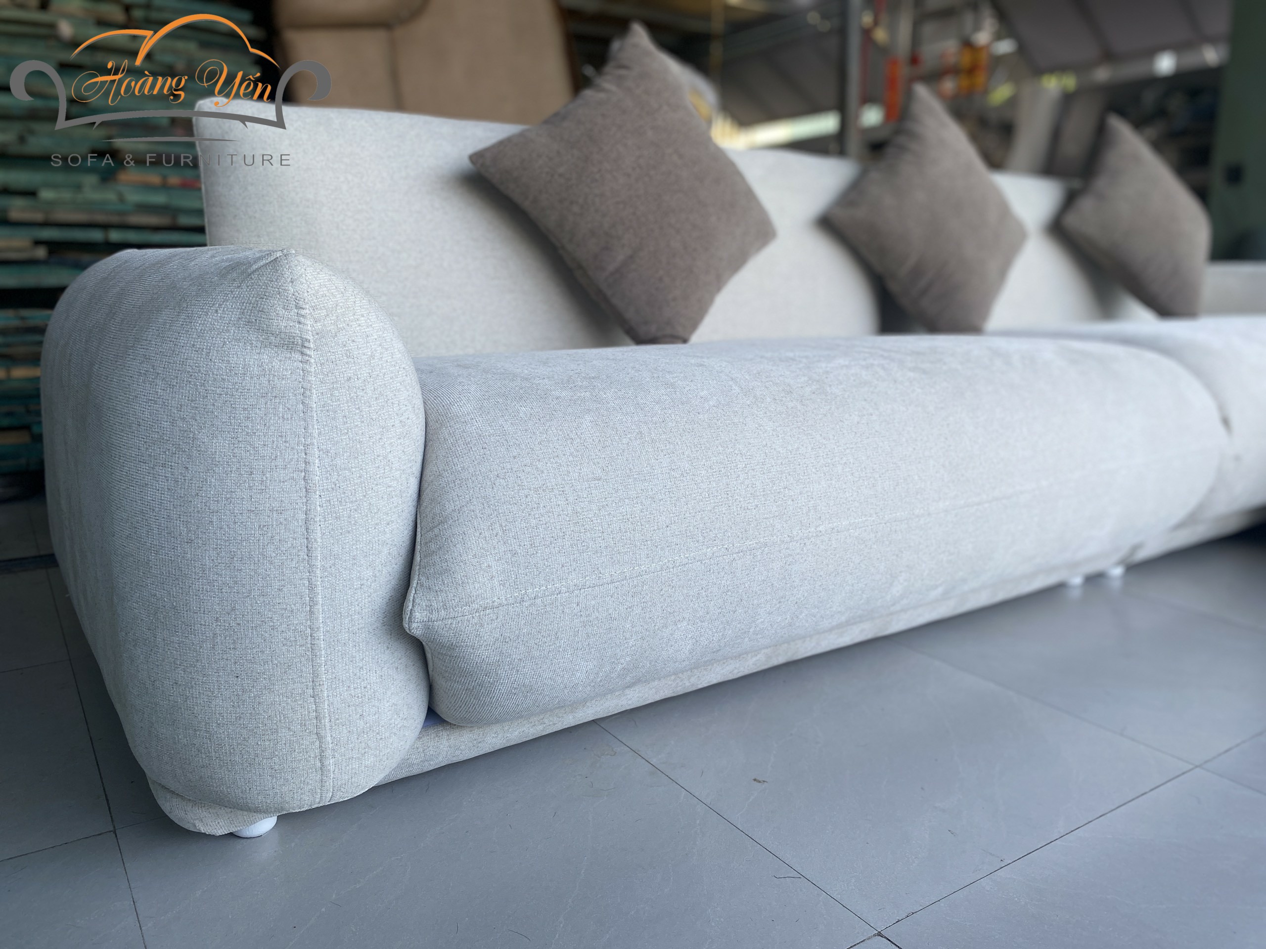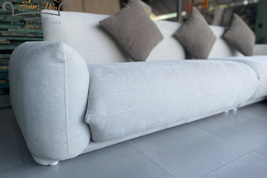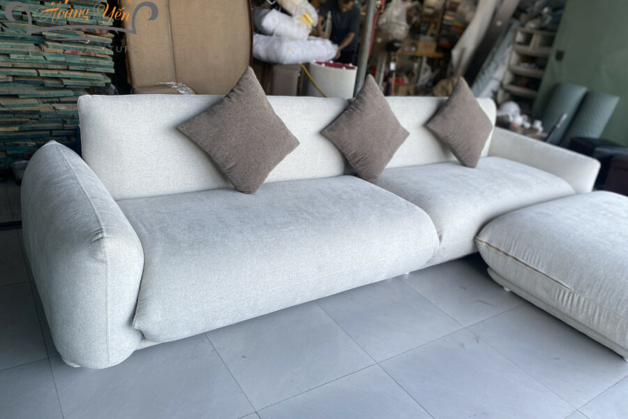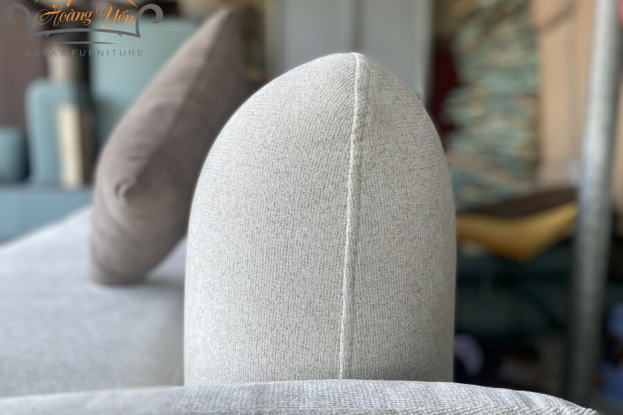 Sofa văng nỉ SHY386 màu sắc tinh khôi, trông gọn gàng và tinh tế, kết hợp gối ôm màu ghi tối càng làm sofa thêm nổi bật.