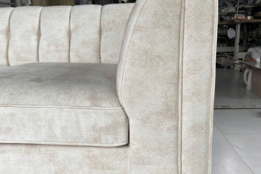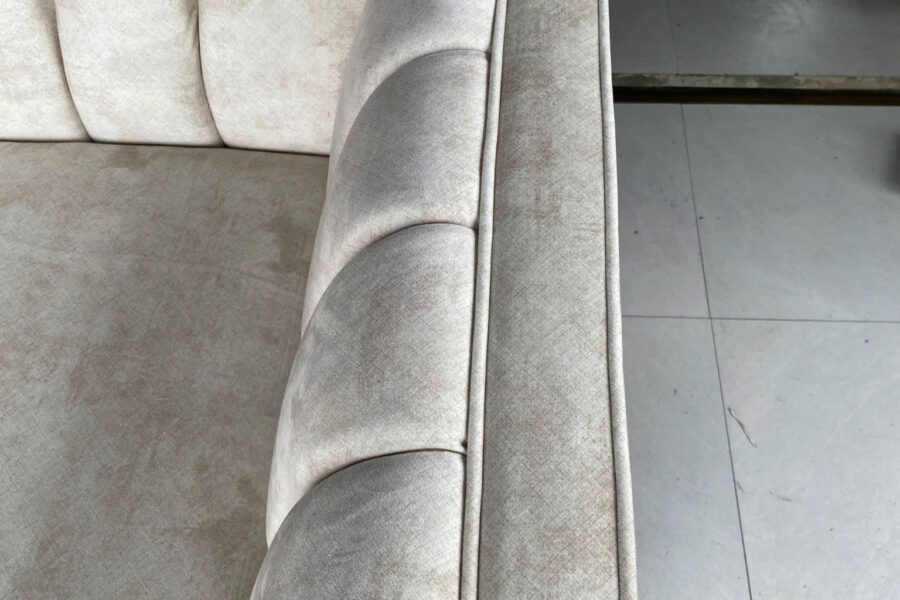 Điểm nhấn của sofa văng nỉ này là phần tay ghế và tựa lưng có các họa tiết đường thẳng song song.